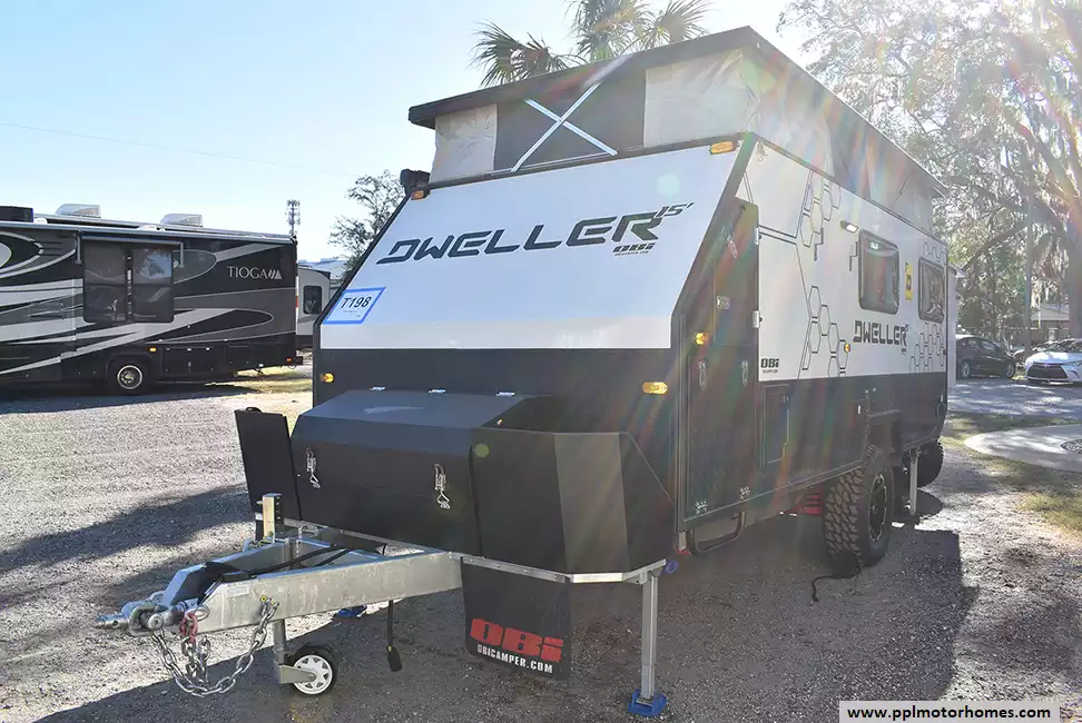 This 2022 Dweller 15 has an Electric Tongue Jack, 1 Non-Ducted Air Conditioner, Refrigerator, In-Fridge Ice Maker, Automatic Main Awning, Solar Panel, Outside Stereo, TV, Outdoor Grill, Outdoor Kitchen, Outside Shower, 2 Burner Range