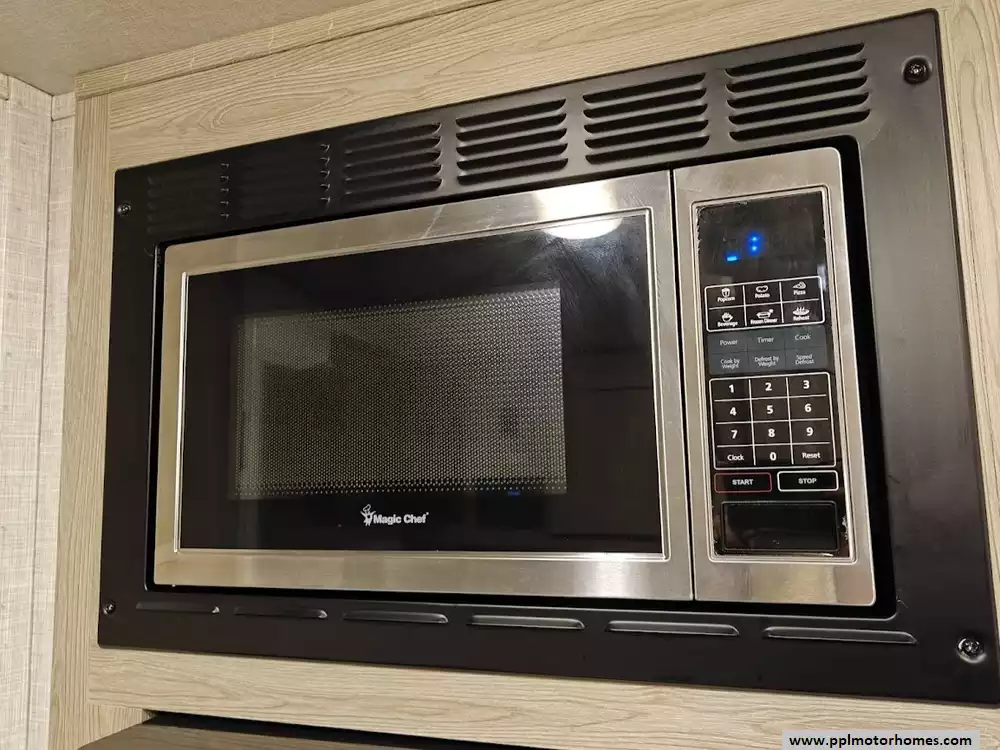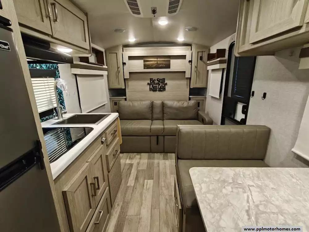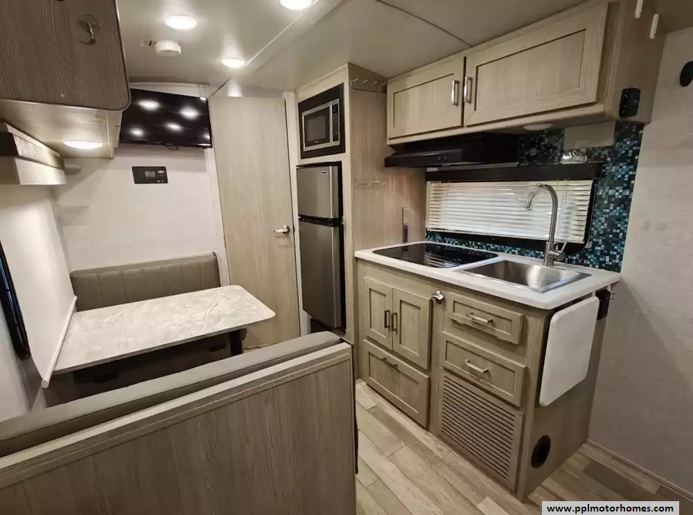 The 2022 Forest River Rockwood Geo Pro 19FD floorplan is designed to maximize space in a compact trailer, with distinct front living/sleeping and rear bathroom areas. It is a single-axle trailer with no slide-outs, which simplifies the design and keeps the weight down. The front area is highly versatile serving as both the main living room during the day and the sleeping area at night. The is a jackknife couch for day and a full size Murphy bed for sleeping. The kitchen is located on the immediate right upon entry and includes a sink, a three-burner cooktop, a microwave oven and a 2 door refrigerator/freezer. Opposite the kitchen on the left side is a 32" booth dinette that features large windows for a great view of the campsite and can convert into a small additional sleeping space The entire rear of the trailer is dedicated to the full bathroom, which runs the width of the coach and provides a surprisingly spacious feel for a compact RV. It includes:a full shower, toilet and ample storage.