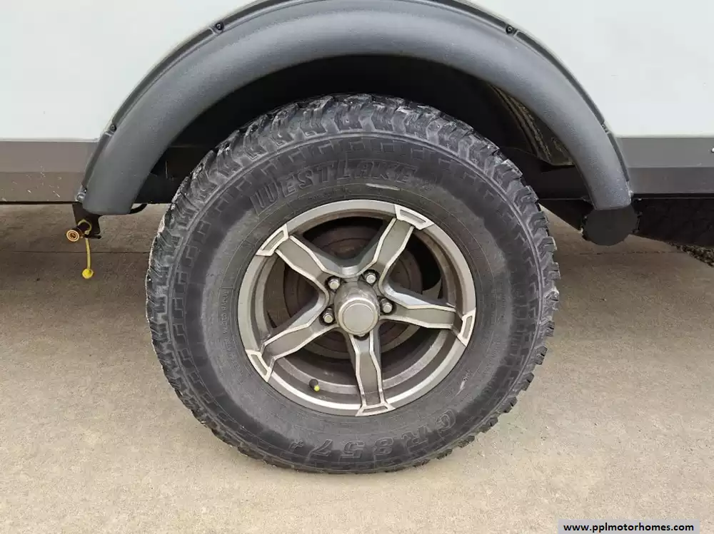 The exterior is designed for durability and off-road capability, featuring lightweight aluminum construction, a power awning, solar panels, and a range of convenient utility features for outdoor living. There is both a pass-through storage compartment and additional exterior storage for gear. The exterior includes a roof ladder for easy maintenance, an outside shower, and a black tank flush system. It also comes with a back up camera and monitor.