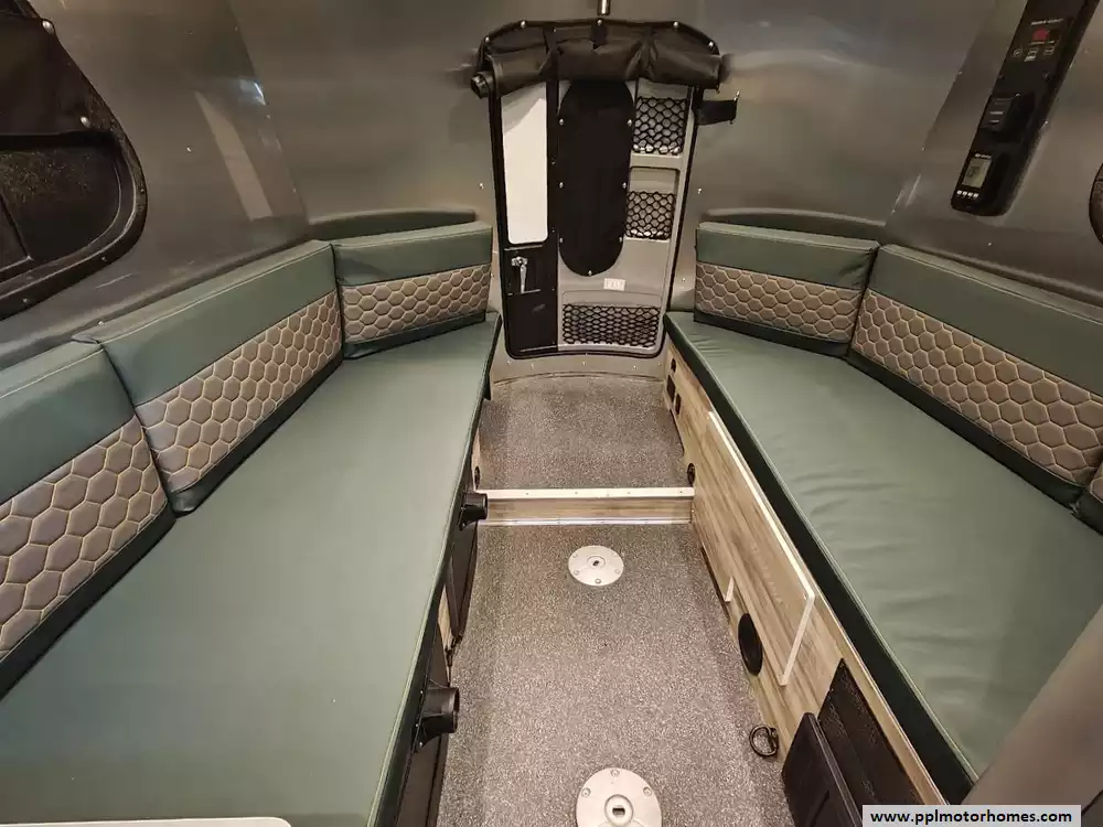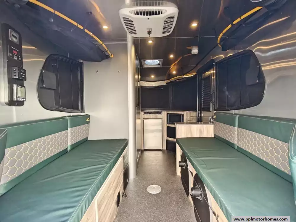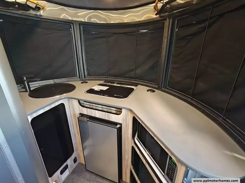 This 2023 Basecamp 16X features two benches and two removable pedestal tables that can be configured into a full-sized 76" x 76" bed (sleeping two), a half-bed for one, or two separate seating areas for up to five people. With the tables removed and the rear 26" x 46" hatch open, you have 126 inches of unobstructed cargo depth for kayaks, bikes, or skis. The overhead storage includes racks with bungee nets, under-bench compartments, and an L-track storage system on the floor for securing gear during transit. The kitchen wraps around the front of the trailer, allowing you to cook while looking through the signature panoramic windows. It is equipped with a two-burner gas stove, a microwave, a stainless steel sink and a single door 12v refrigerator. The waterproof wet bath combines a toilet, sink, and shower into a single efficient space. The showerhead can be passed through a small door to the exterior, creating an outdoor shower for rinsing off gear or pets. It also features a tankless on-demand LP water heater for instant hot water. Other features include a Non-Ducted Air Conditioner, Solar Panel, Lithium batteries, Heated Tanks and Outside Shower.