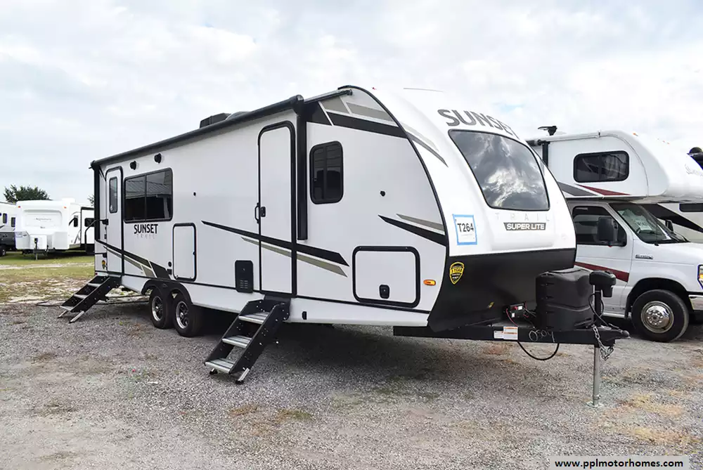 This 2023 Sunset Trail 256RK has an Electric Tongue Jack, 1 Slide-out, 1 Ducted Air Conditioner, Double Door 12V Residential Refrigerator, Automatic Main Awning, Outside Speakers, TV, Outdoor Grill, Microwave, 3 Burner Range