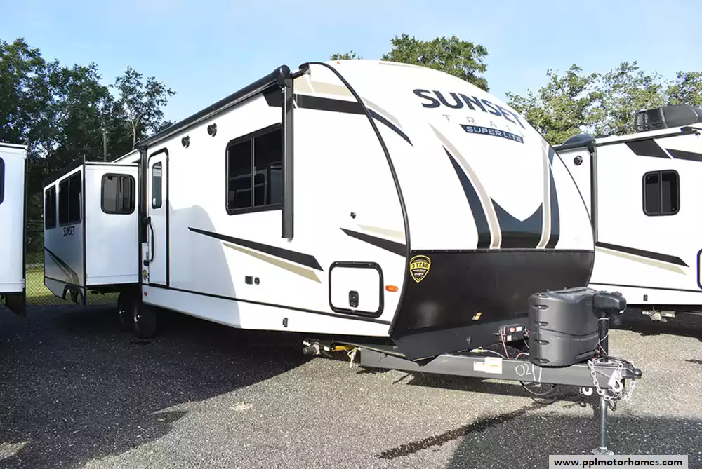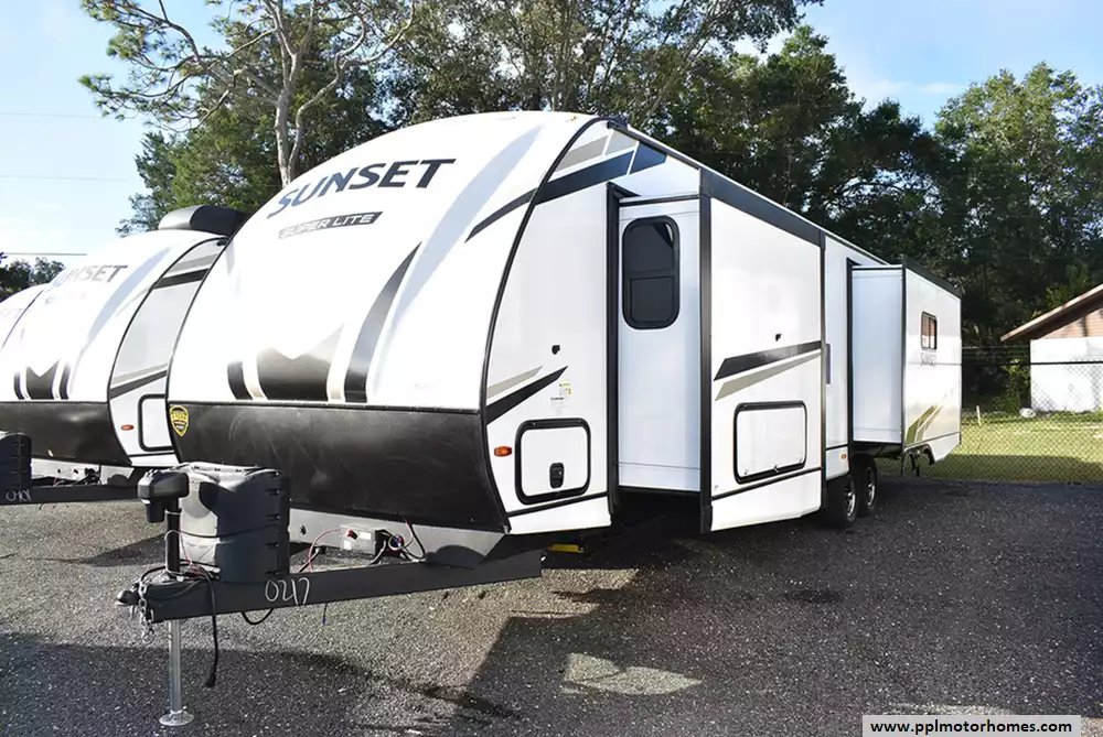 This 2023 Sunset Trail 330SI has an Electric Tongue Jack, 3 Slide-outs, 1 Ducted Air Conditioner, Double Door 12v Refrigerator, Automatic Main Awning, Outside Speakers, TV, Outside Shower, Fireplace, Microwave, 3 Burner Range, Oven