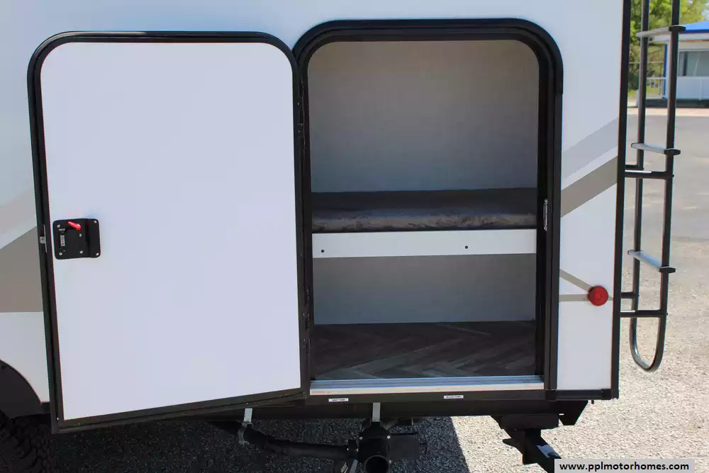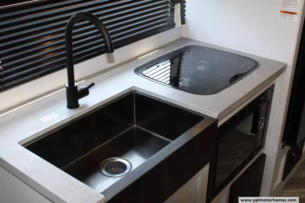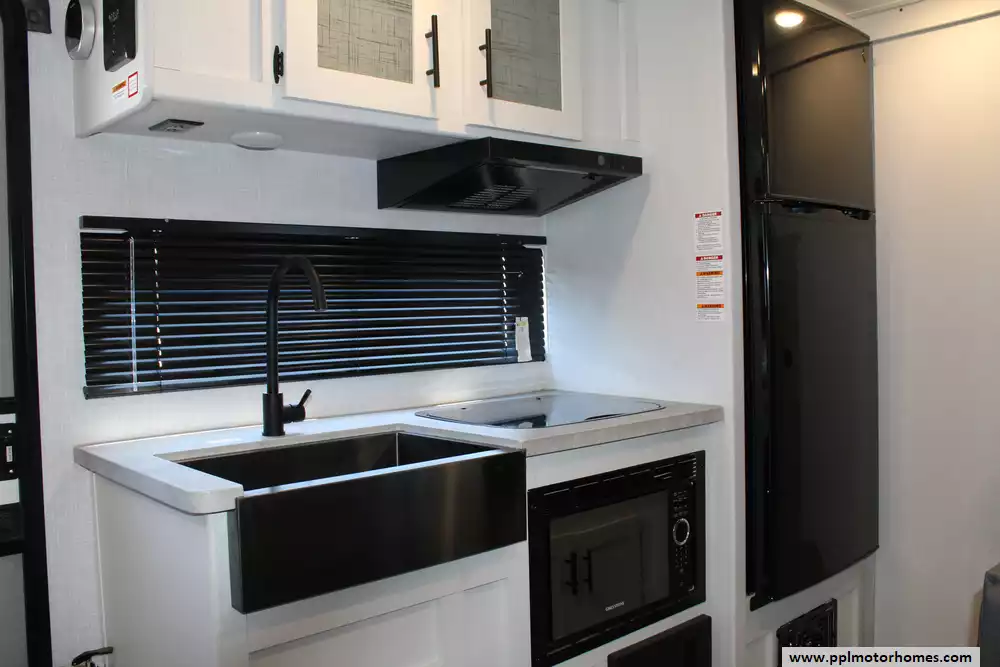Inside, the Rubicon 1628BH features a well-equipped kitchen with a 10 cubic foot 12V refrigerator, a two-burner stove, and a stylish black stainless steel farm-style sink. The living space is decorated in a modern Boulder theme with woodgrain accents and durable vinyl flooring, creating a cozy yet practical environment. The rear corner bathroom includes a shower with a curtain, a toilet, and a medicine cabinet, providing all the essentials needed for a comfortable camping experience.