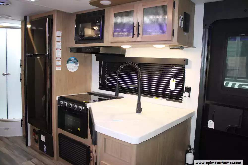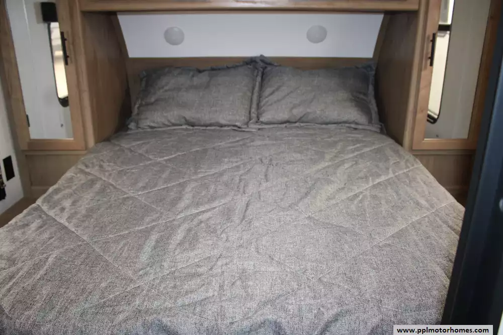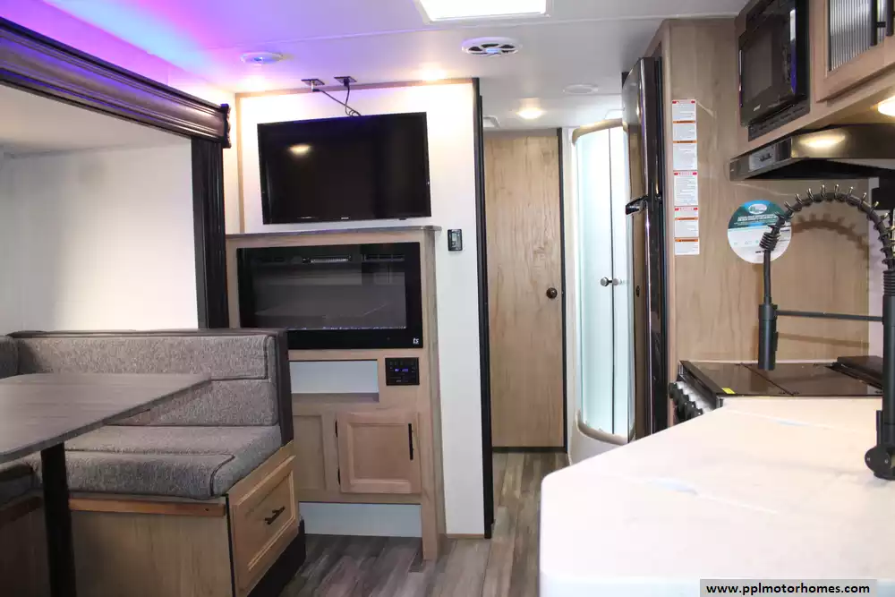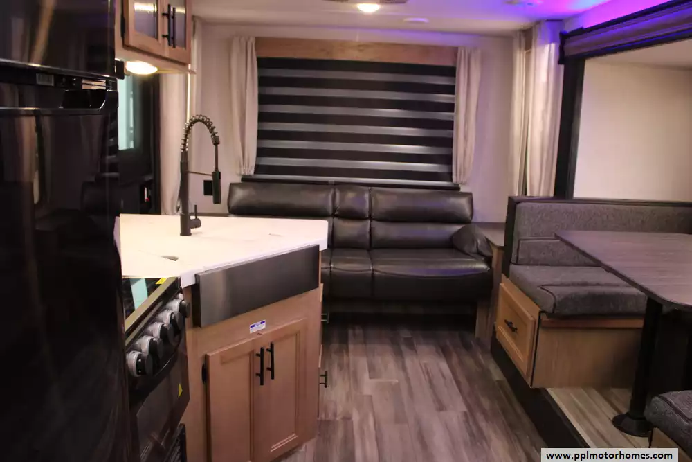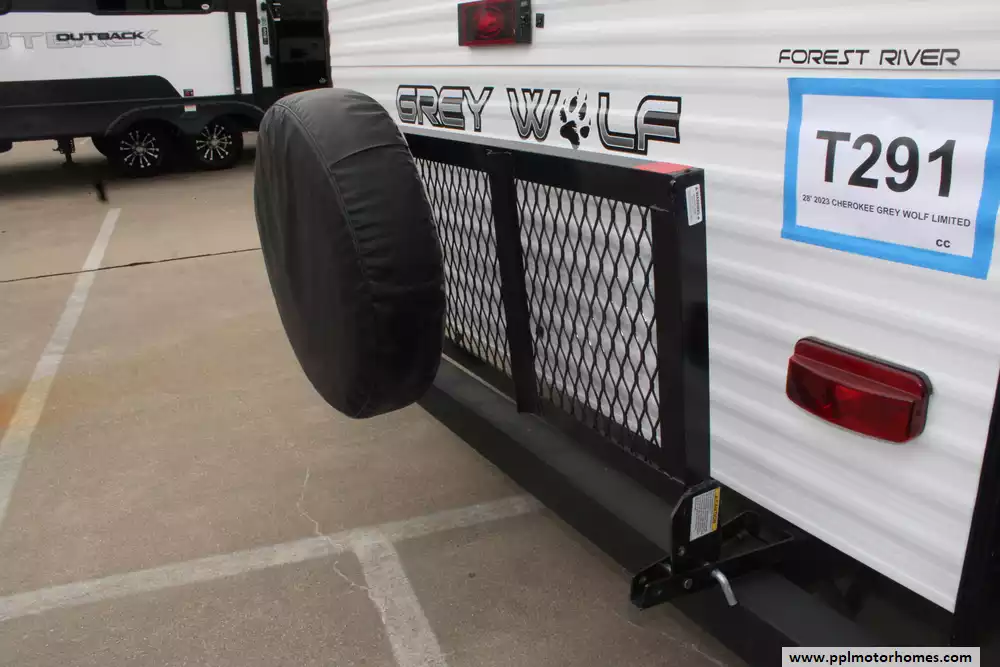 The 2023 Forest River Cherokee Grey Wolf Limited 23MK is a modern travel trailer designed to provide spacious comfort and practical features for couples or small families. Measuring about 29 feet in length with one slide-out and a dry weight of roughly 5,063 pounds, it offers a roomy interior while remaining towable by many half-ton trucks. The rear living area includes a comfortable sofa and a large U-shaped dinette in the slide-out that converts into additional sleeping space, while the private front bedroom features a queen-size bed and storage. The kitchen is well equipped with a three-burner cooktop, microwave, and large 12-volt refrigerator, and the trailer includes a full bathroom with a neo-angled shower. Additional highlights include a 15-foot power awning with LED lighting, exterior storage, and modern amenities such as a 15,000-BTU air conditioner and tankless water heater, making the Grey Wolf 23MK a comfortable and versatile travel trailer for weekend trips or extended camping adventures.