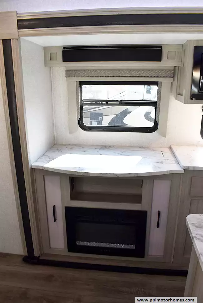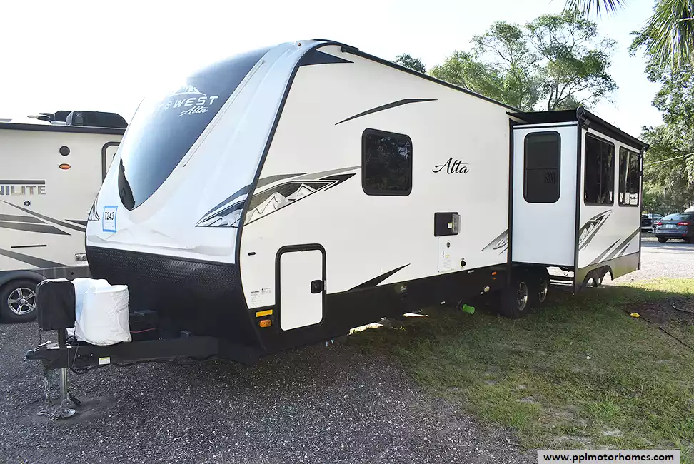 This 2023 East To West Alta 2810KIK has an Electric Tongue Jack, 2 Slide-outs, 2 Ducted Air Conditioners, Double Door 110v Everchill Refrigerator, Automatic Main Awning And Slide/Door Awnings, Solar Panel, Outside Speakers, TV, Outdoor Kitchen, Fireplace, Microwave, 3 Burner Range, Oven