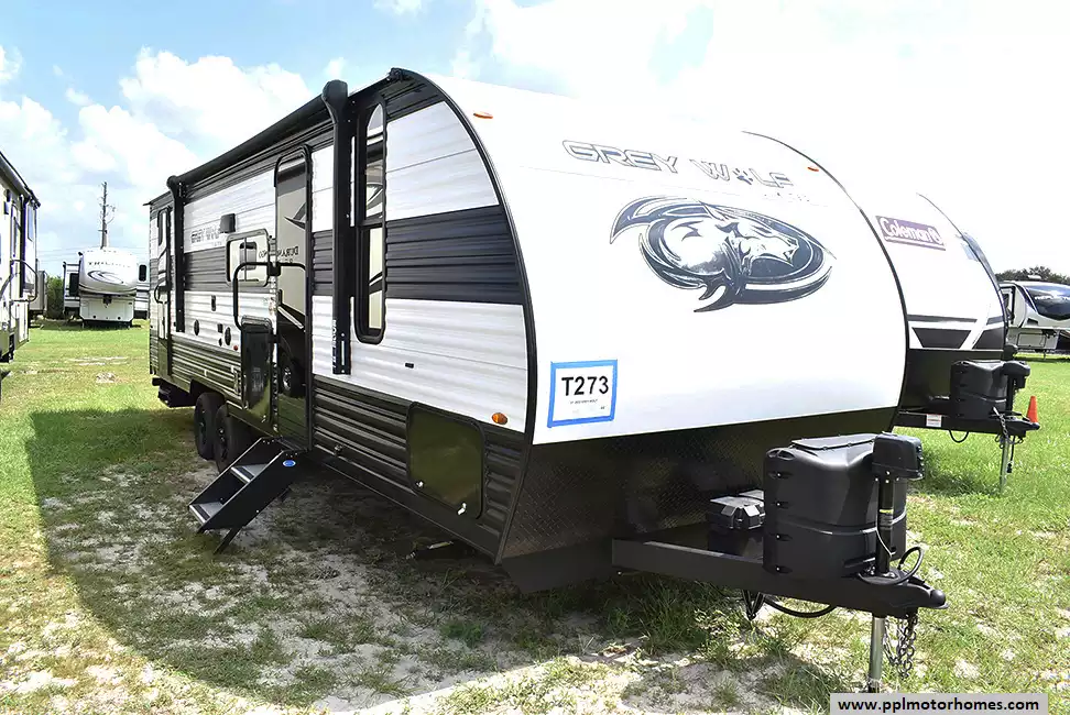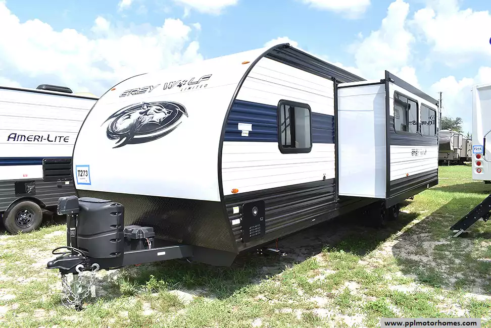 This 2022 Grey Wolf 26DBH has an Electric Tongue Jack, 1 Slide-out, 1 Ducted Air Conditioner, Double Door Refrigerator, Stand-Alone Ice Maker, Automatic Main Awning, Solar Panel, Outside Speakers, Outdoor Grill, Outdoor Kitchen, Outside Shower, Microwave, 3 Burner Range, Oven