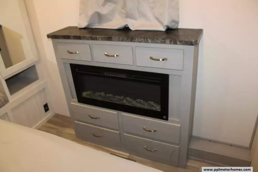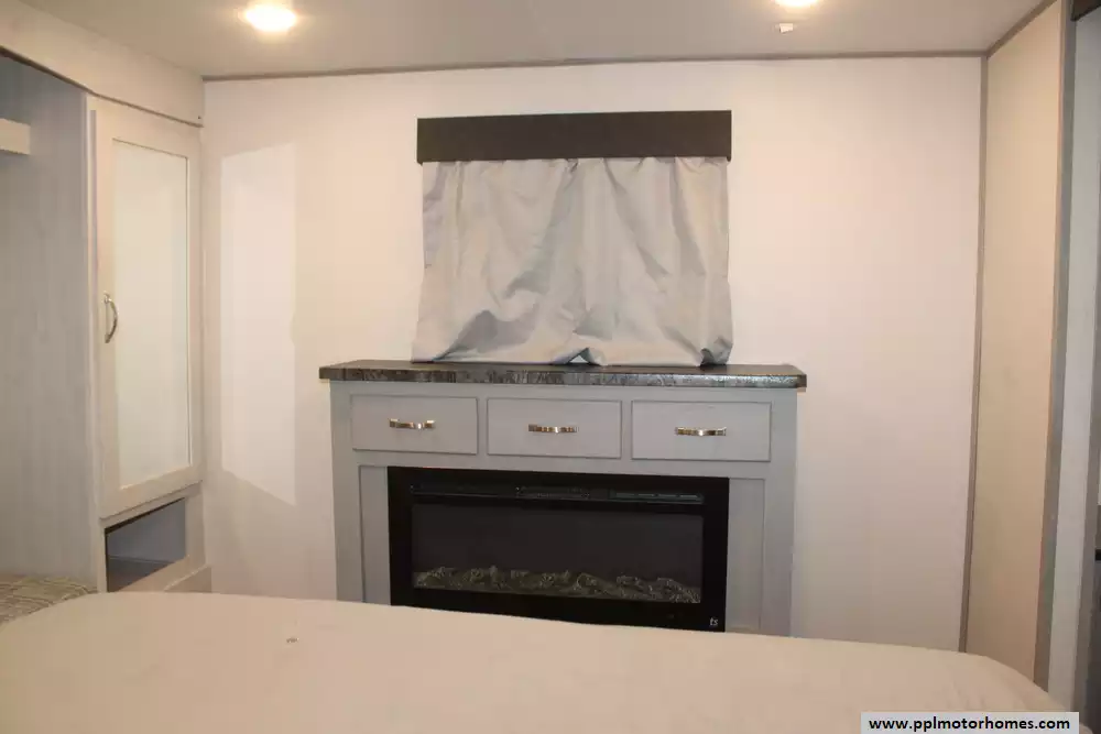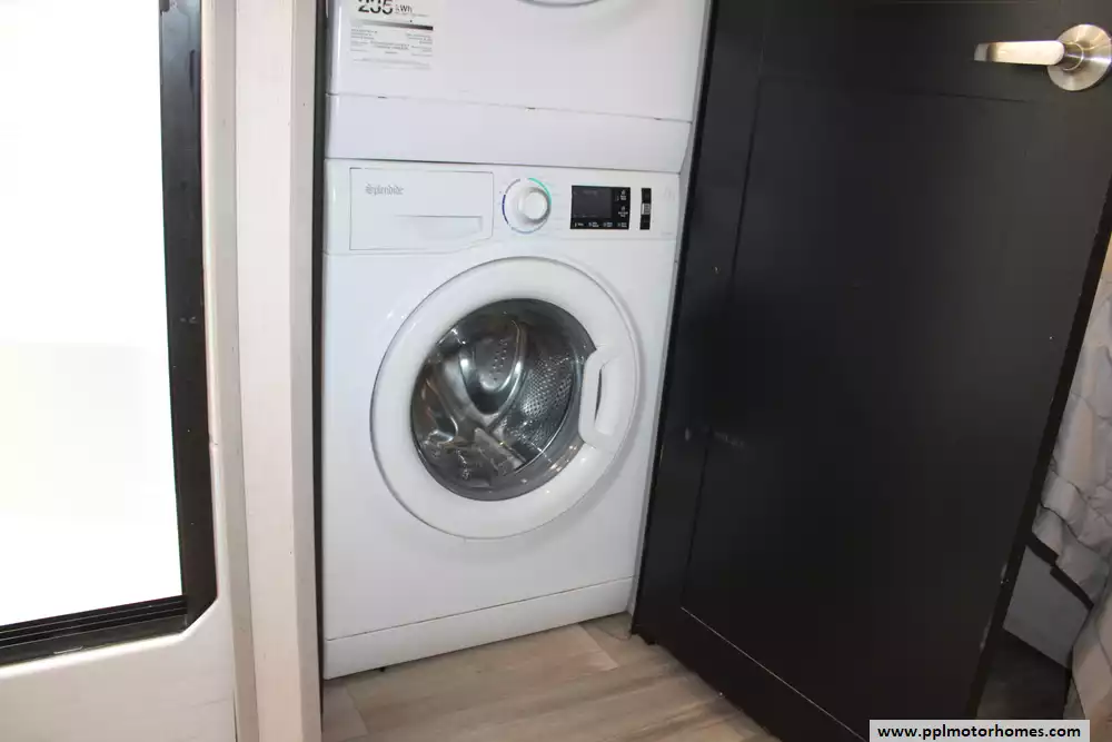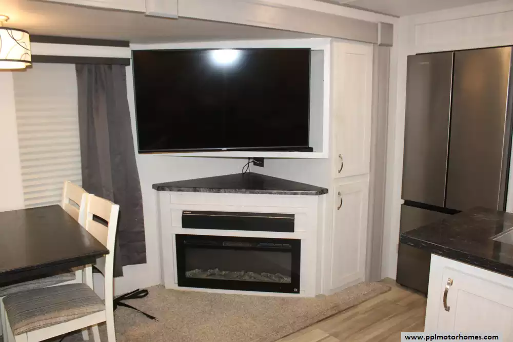 The interior is fully equipped for long-term luxury, featuring a cozy fireplace, a large TV, and the rare convenience of an onboard washer and dryer. Stay perfectly comfortable in any climate with a climate control system that includes both ducted and non-ducted air conditioners. The gourmet kitchen boasts an Everchill refrigerator, a three-burner range, an oven, and a microwave to handle all your culinary needs. Outside, the experience continues with an automatic main awning, outside speakers, and a handy outside shower. Complete with an electric tongue jack for effortless setup, this meticulously designed Lacrosse 3411RK is ready to elevate your next adventure.