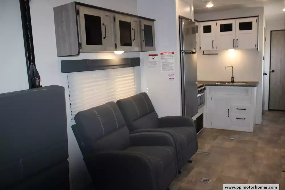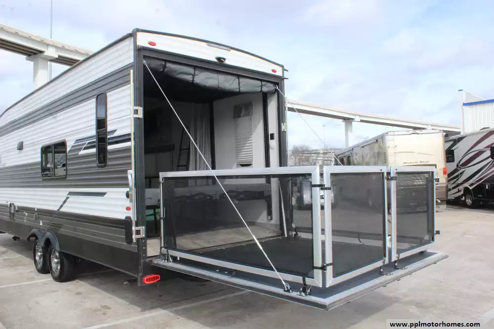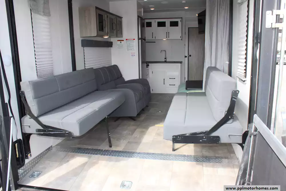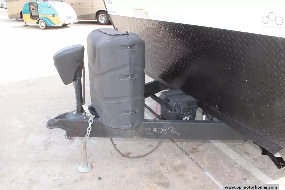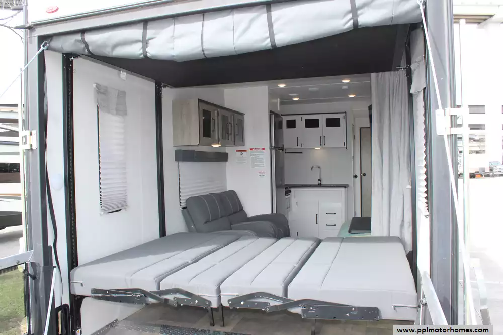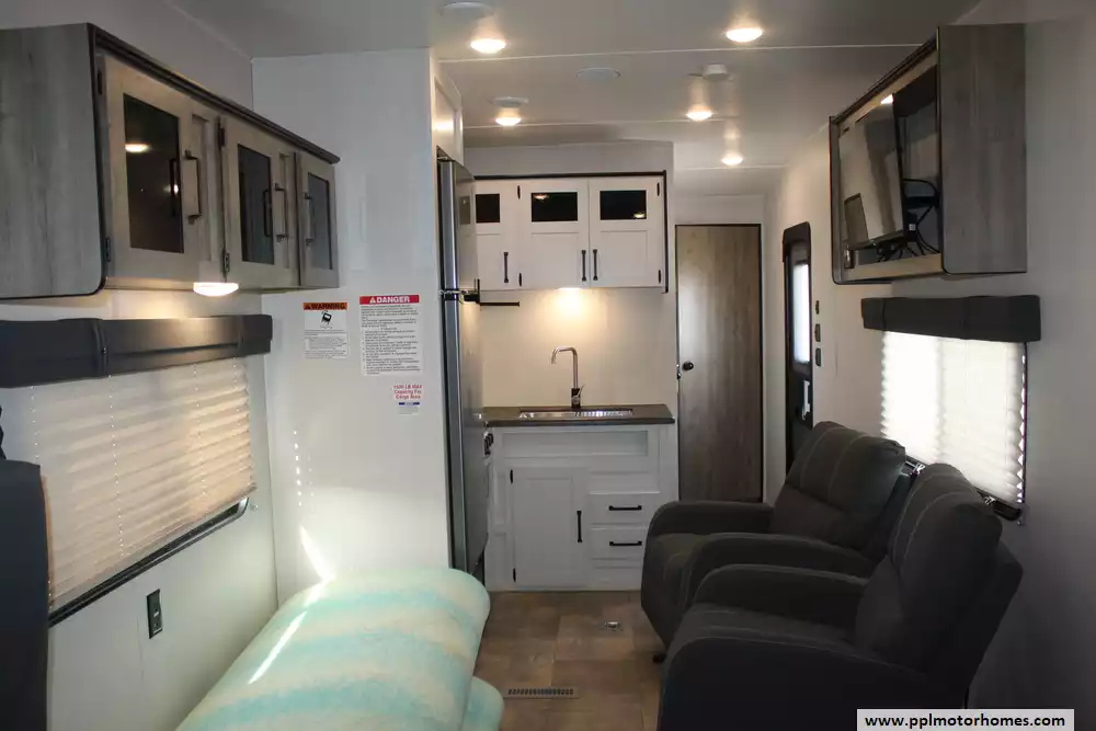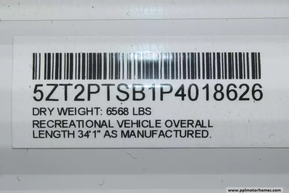 Specs: Length: 34.08 ft., Width: 8 ft., Height: 12.16 ft., Payload Capacity: 2,700 lbs., Total Fresh Water Tank Capacity: 43 gal., Total Gray Water Tank Capacity: 35 gal., Total Black Water Tank Capacity: 35 gal., Total Propane Tank Capacity: 40 lbs.