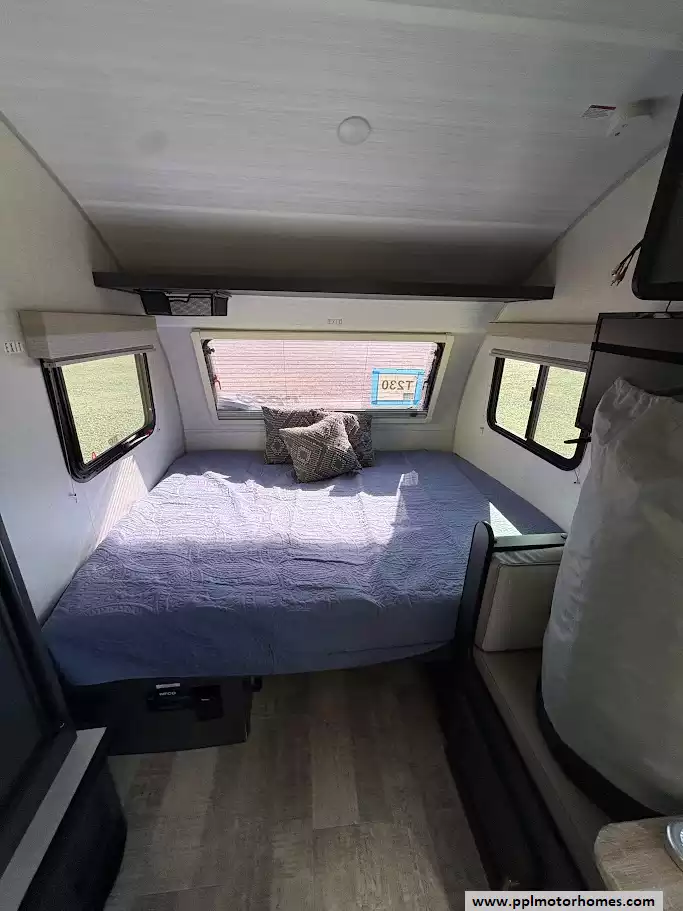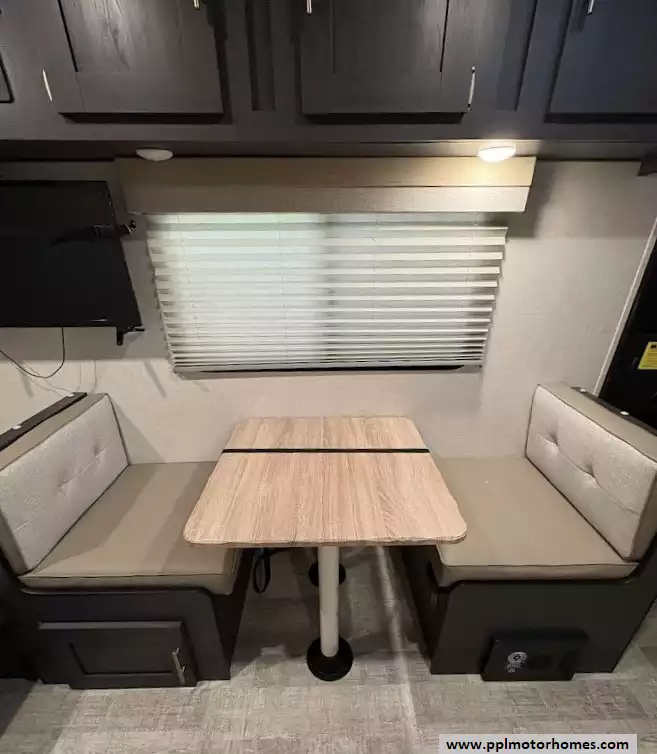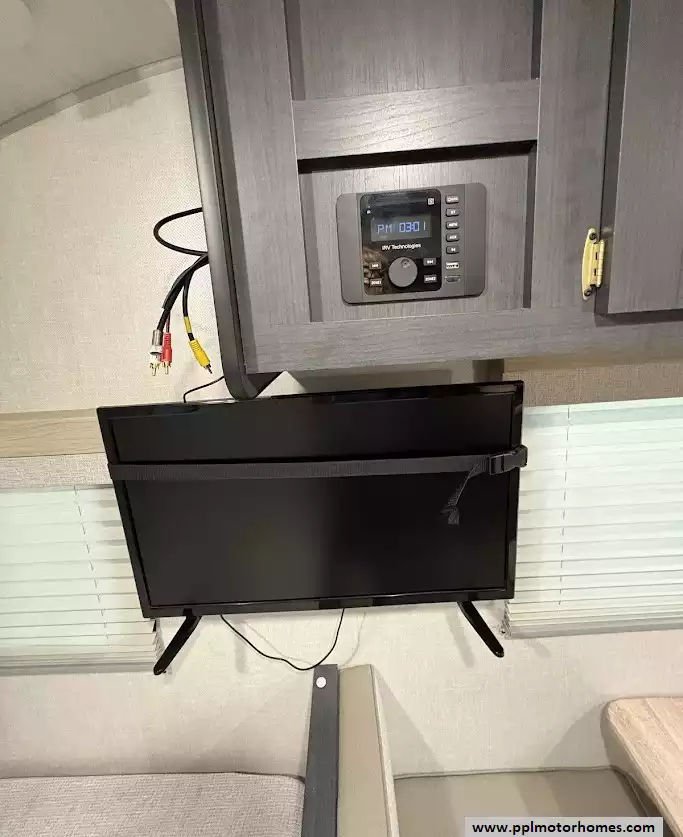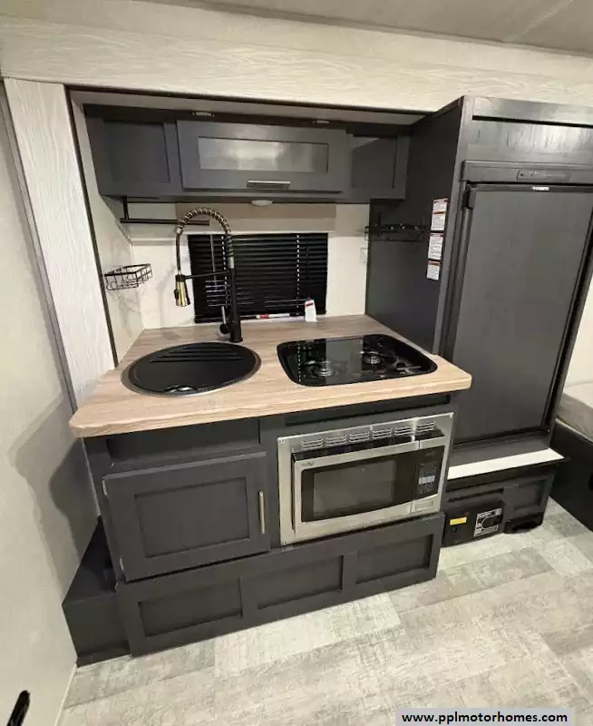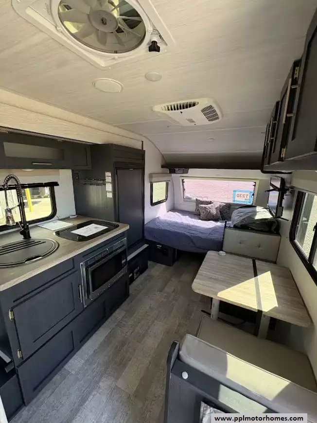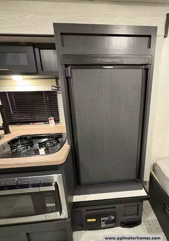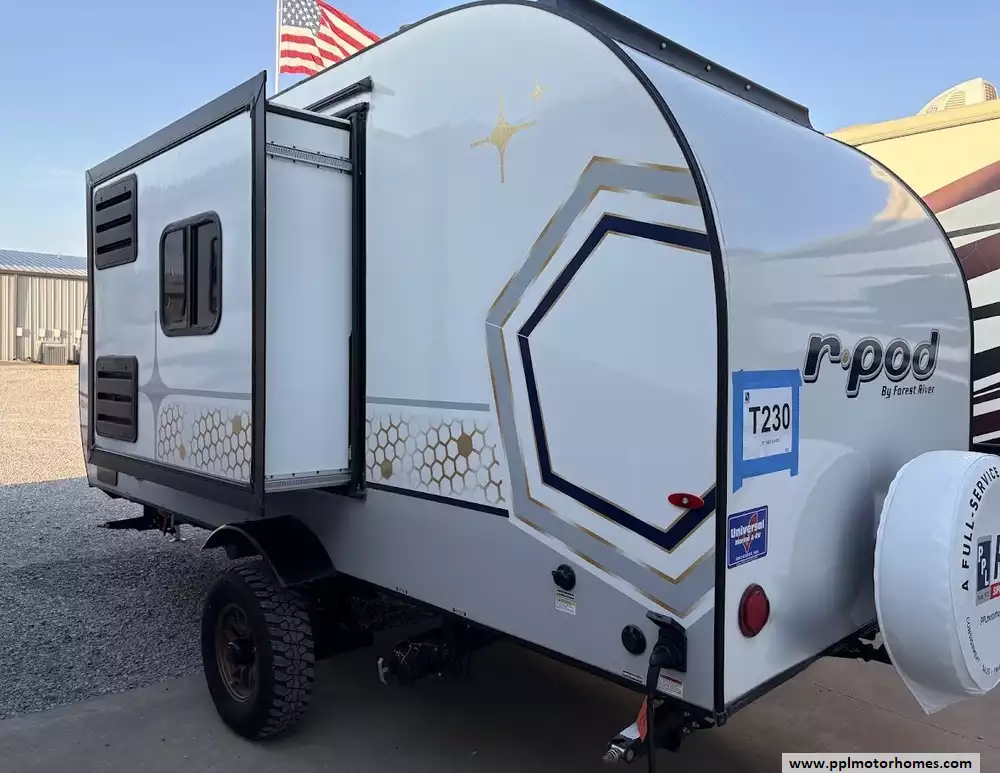 This 2023 R-Pod 180 has an Electric Tongue Jack, 1 Slide-out, 1 Non-Ducted Air Conditioner, Single Door 12v Dometic Refrigerator, Automatic Main Awning, Solar Panel, Outside Speakers, TV, Central Vacuum, Convection Microwave, 2 Burner Range