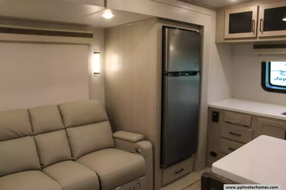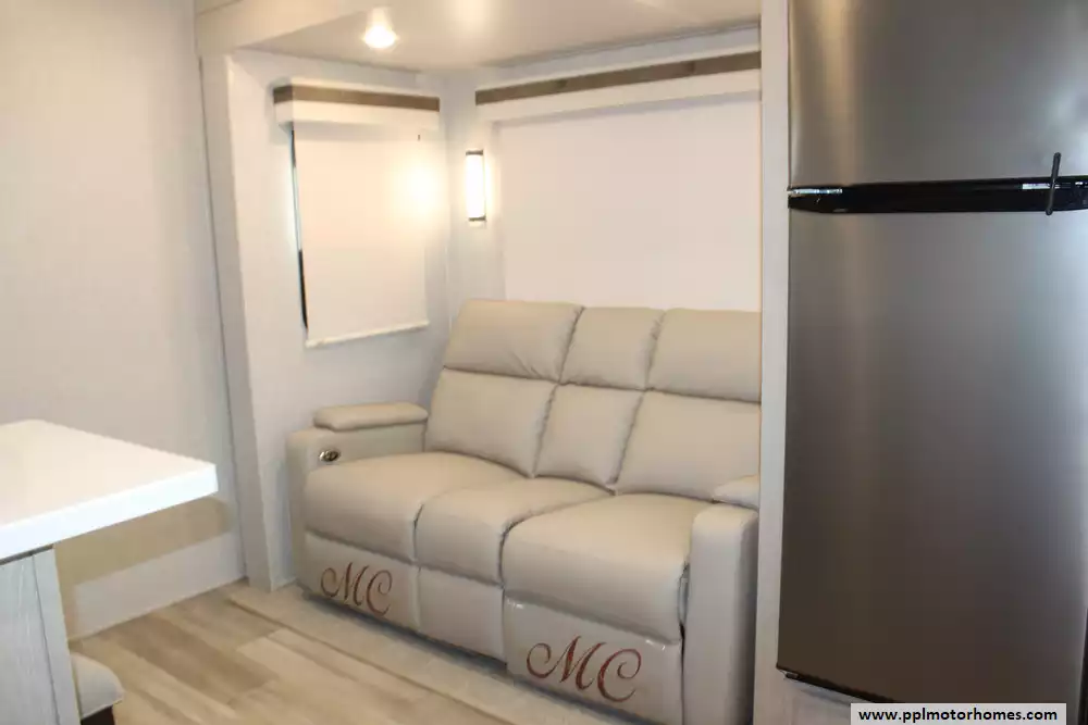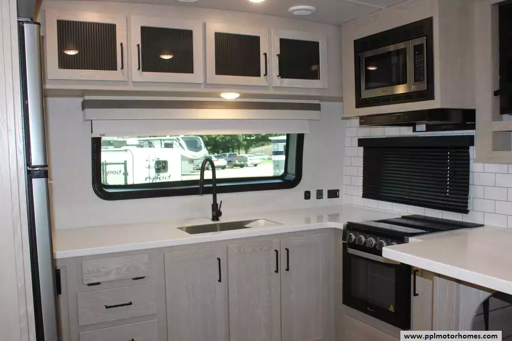 The 2023 Rockwood Signature 8263MBR represents the gold standard in luxury couples' travel, blending a spacious 29-foot layout with the high-end construction Forest River's Signature series is famous for. This fiberglass-bodied trailer features a unique front-kitchen design that provides an expansive residential workspace, highlighted by a three-burner range, oven, microwave, and a double-door Magic Chef refrigerator. A second refrigerator is also included for added convenience during extended stays. The dual slide-out floorplan creates an open, airy living area cooled by two ducted air conditioners, while theater-style seating offers a perfect view of the included TV.