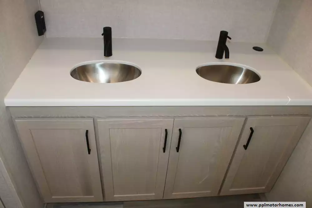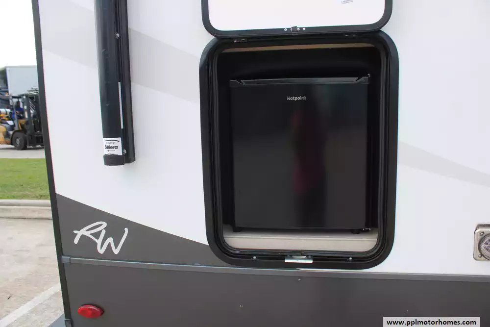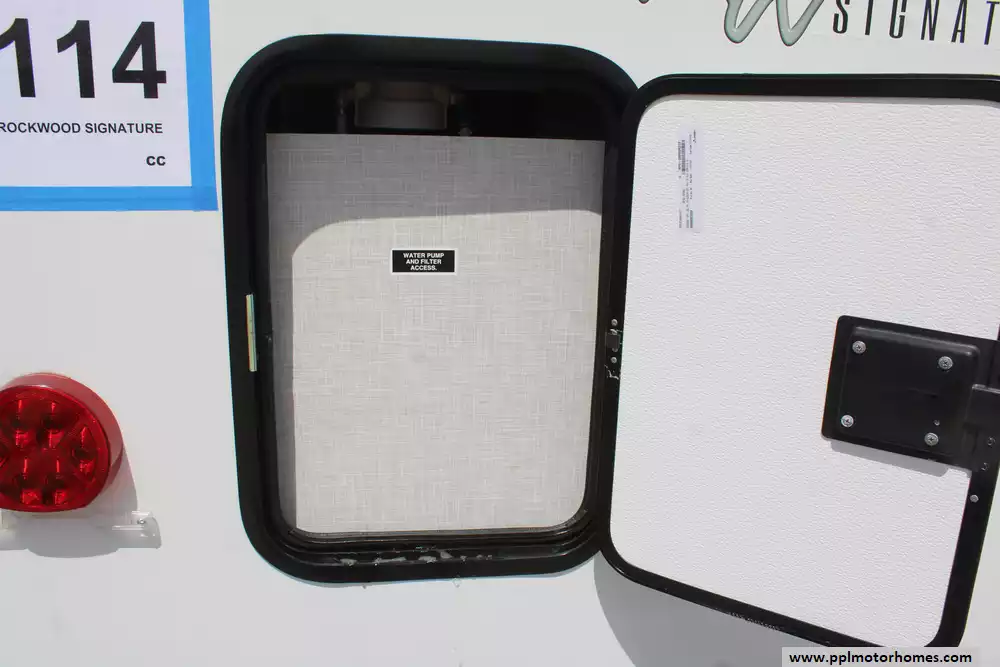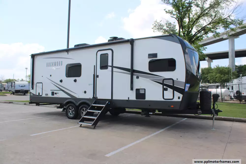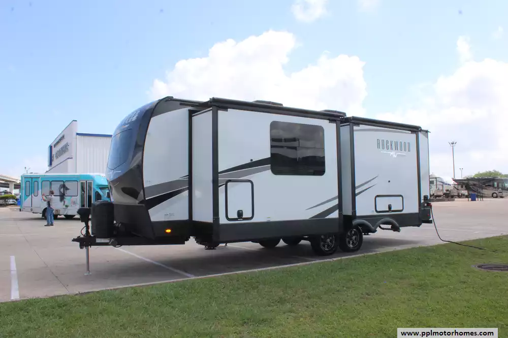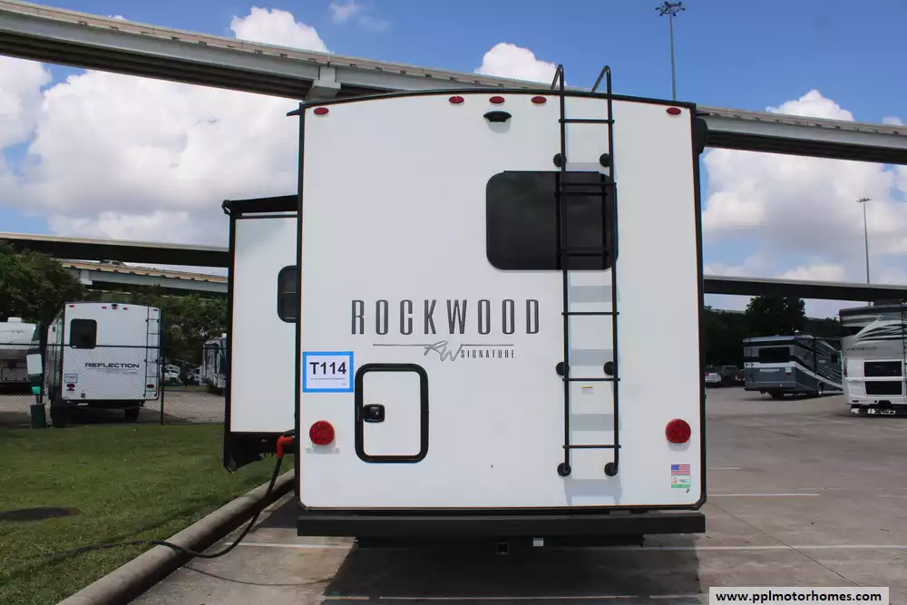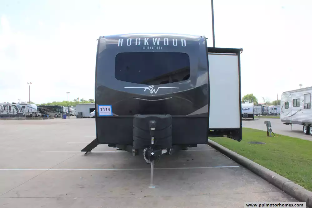 Beyond the living space, this model is celebrated for its "master suite" feel, offering a bedroom with a king-bed slide-out and a massive rear bathroom featuring a rare double-sink vanity. Setting up at your destination is effortless with the electric tongue jack and automatic main and slide awnings, which provide instant shade and protection. Premium exterior amenities, including outside speakers and an outside shower, complement the durable rubber roof and refined finish of the Signature series. With its reputation for superior craftsmanship and thoughtful design, this Rockwood Signature is a premier choice for travelers seeking a sophisticated home on the road.