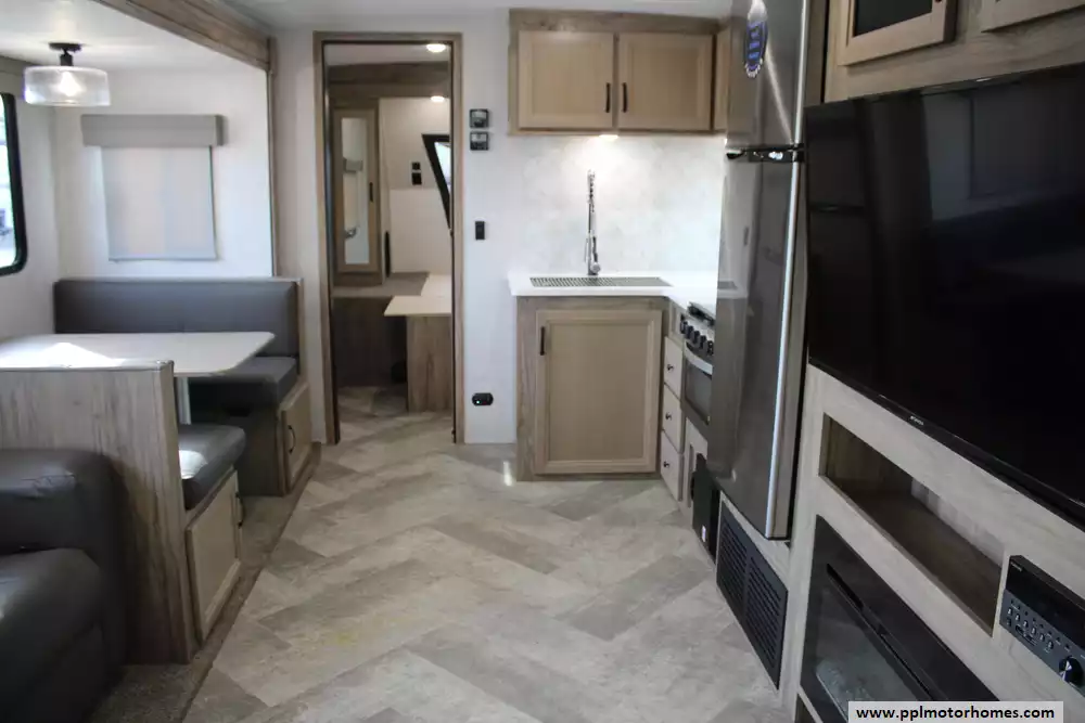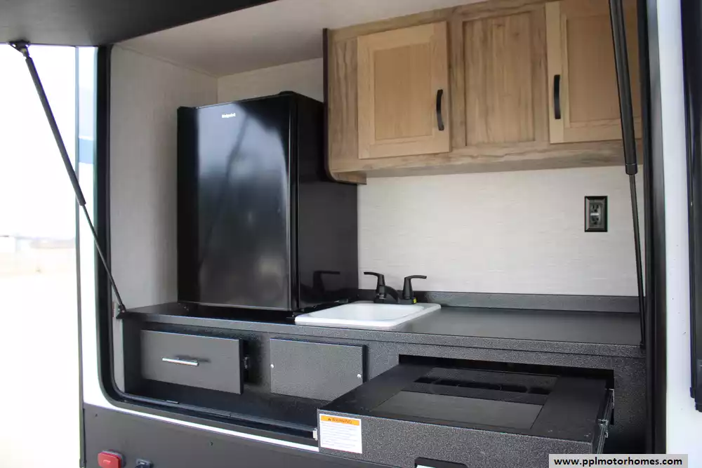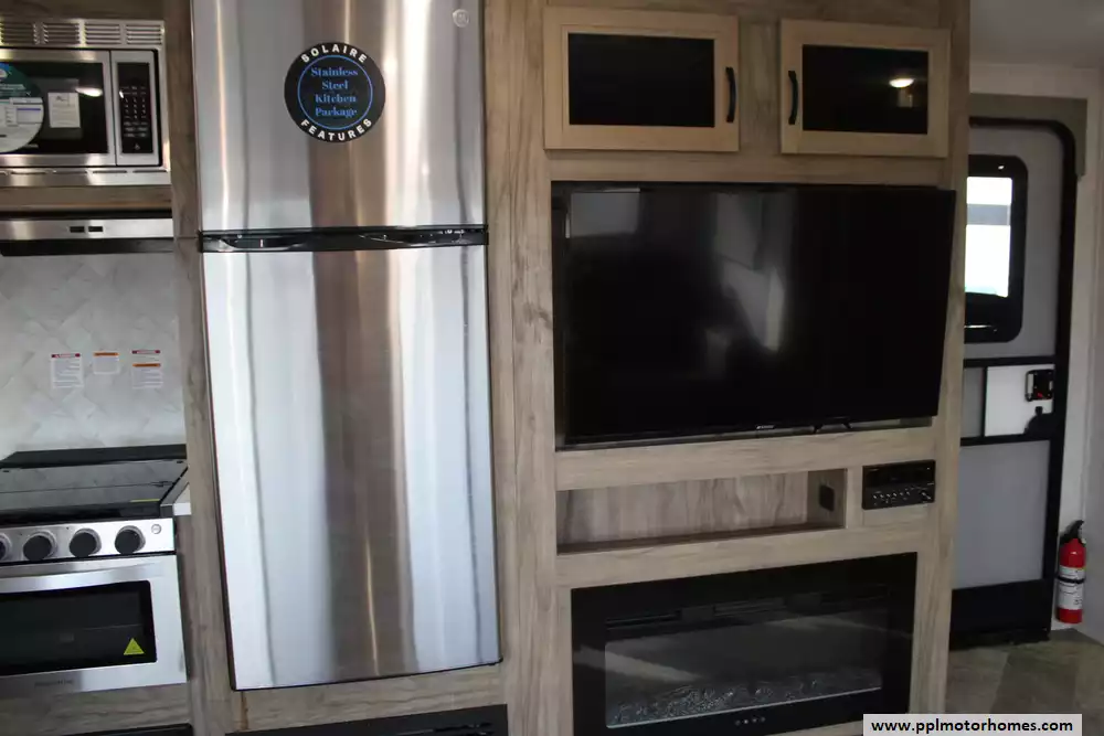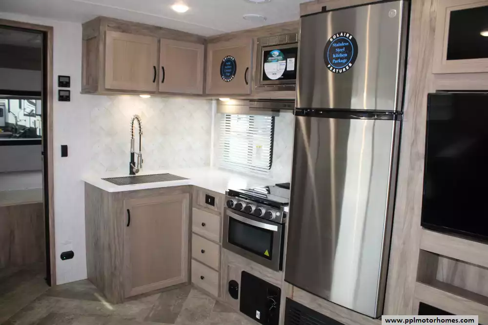 The 2023 Palomino SolAire 258RBSS is a lightweight travel trailer designed to balance comfortable living space with easy towing, featuring a single large slide-out that expands the main living and kitchen area and sleeps up to five. It includes a front queen bedroom, convertible sofa sleeper and booth dinette, plus a spacious rear full bathroom with a shower and linen storage. Inside you'll find practical amenities like an 11 cu ft refrigerator, solid-surface countertops, USB charging ports, roller shades and entertainment options, while outside a 19' power awning with LED lights and an outdoor kitchen extend your campsite living space. Built with a white hi-gloss exterior, Dexter Torsion axles, and a power tongue jack, the SolAire 258RBSS is aimed at providing a well-equipped and comfortable camping experience for couples or small families.
