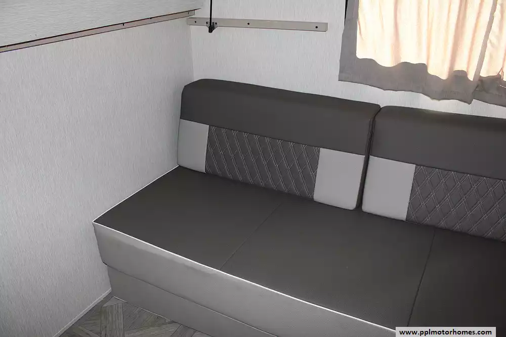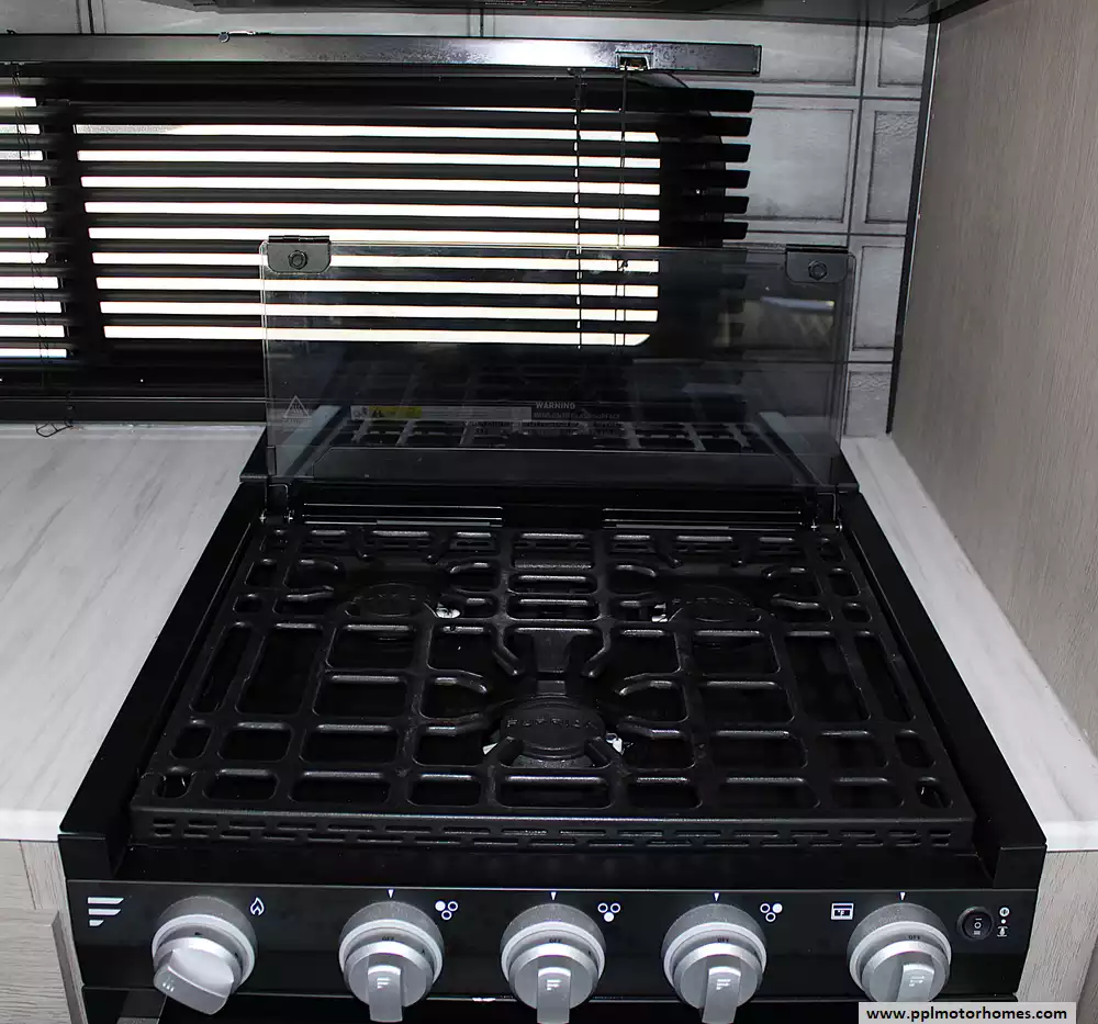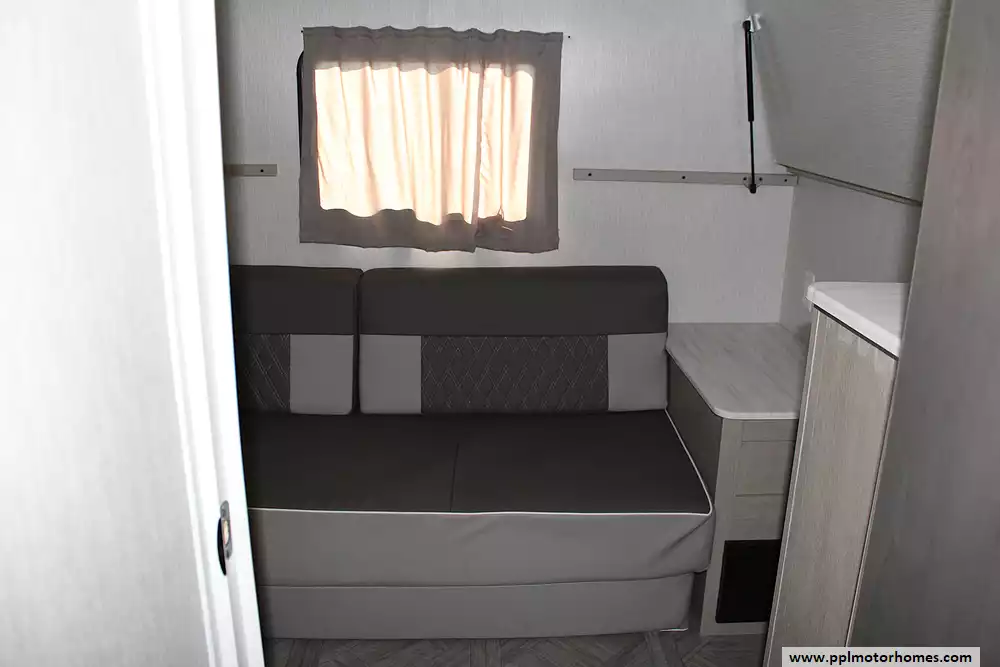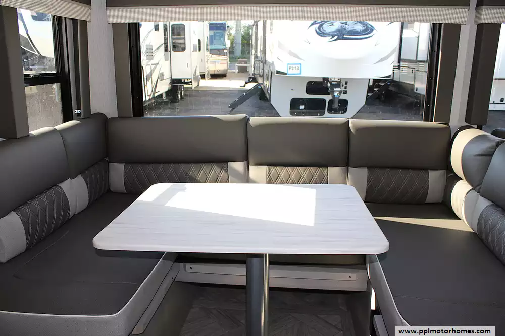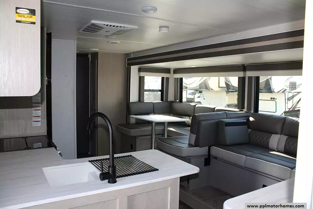 Inside, you'll find a versatile floorplan crafted to accommodate families and groups with ease. This model comfortably sleeps up to 10 people, thanks to its private bunkhouse, convertible Versa Lounge, U-shaped dinette, and front custom queen bed. The fully equipped kitchen features modern appliances, abundant cabinetry, and a generous countertop, making it a pleasure to prepare meals no matter where you roam. A stylish entertainment center and a spacious bathroom with a walk-in shower add the perfect balance of relaxation and convenience, while touches like residential flooring and decorative accents elevate the space to feel like home.