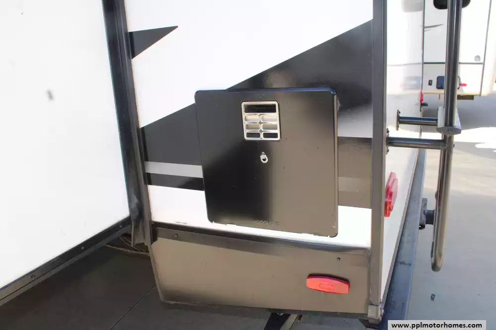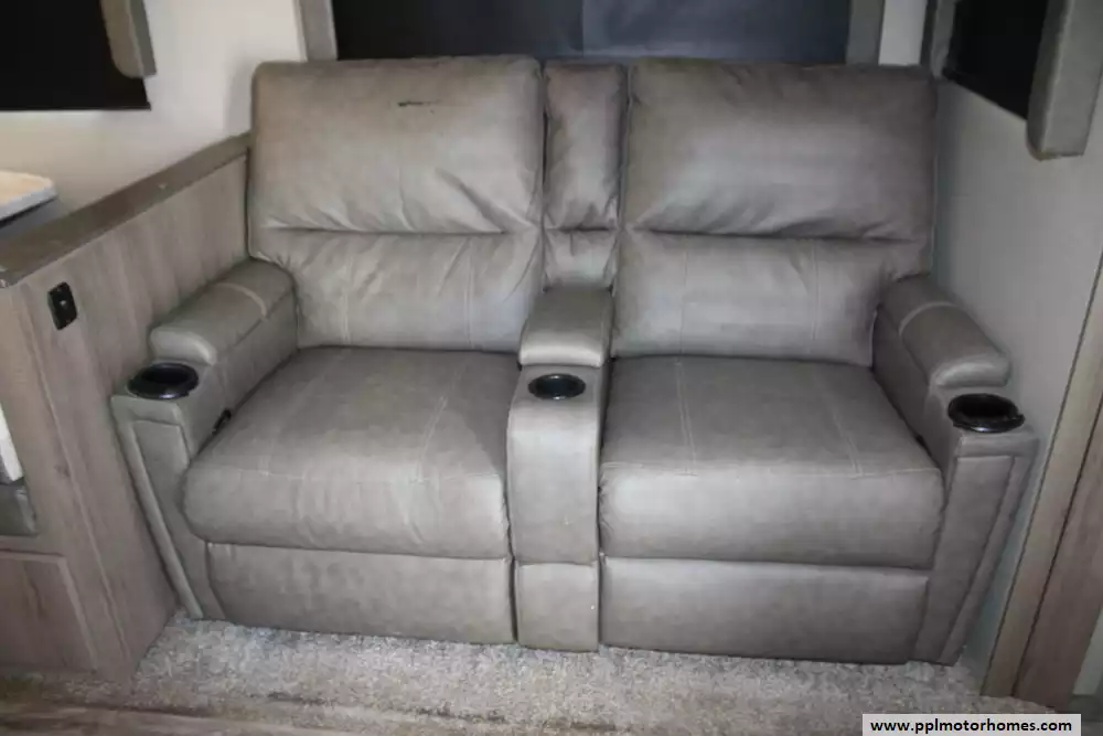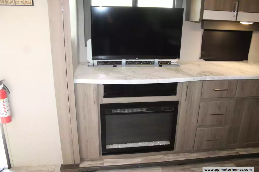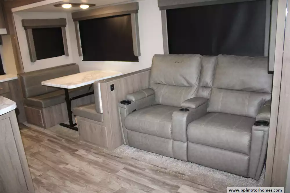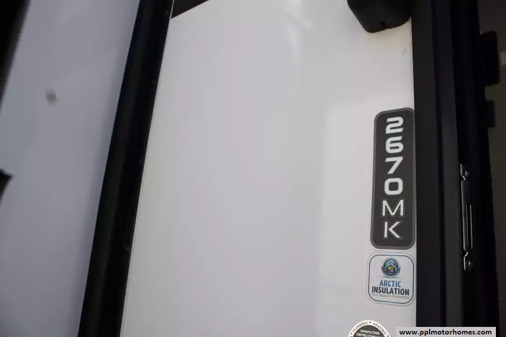 The 2023 Grand Design Imagine 2670MK is a well-appointed travel trailer designed to combine residential comfort with manageable towing weight. Measuring about 32 feet 3 inches in length and featuring two slide-outs, it offers a spacious rear-living floorplan that can sleep up to four people. The interior includes a large theater-seating lounge with entertainment center and fireplace, a spacious mid-kitchen with extended countertop space, stainless sink, and 10-cu-ft refrigerator, plus a dedicated desk/workstation area that makes it ideal for travelers who work remotely. A private front bedroom with a queen bed and ample wardrobe storage provides added comfort, while the bathroom features a roomy 30" x 36" shower. Built with laminated aluminum-framed construction, fiberglass exterior walls, and a heated and enclosed underbelly, the trailer also offers a dry weight around 6,845 lbs., GVWR of 8,495 lbs., 52-gallon fresh water tank, 82-gallon gray tank, and 45-gallon black tank, making it a durable and practical option for extended camping trips or weekend getaways. Honorable mentions include rear camera prep, outdoor kitchen, solar panel, and TV lift. Let the memories begin!