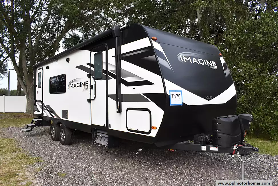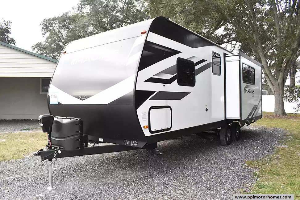 This 2023 Imagine Xls 23LDE has an Electric Tongue Jack, 1 Slide-out, 1 Ducted Air Conditioner, Double Door Gas Furrion Refrigerator, Automatic Main Awning, Outside Stereo, TV, Outside Shower, Microwave, 3 Burner Range, Oven, Queen Bed