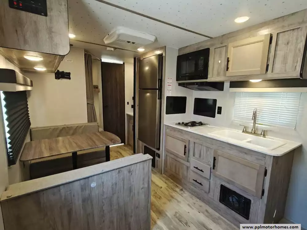The 2023 Gulf Stream Kingsport 248BH is a lightweight travel trailer with a bunkhouse floor plan, designed to sleep up to 8 people. The bedroom features a queen size bed and in the rear section a double-size bunks. The booth dinette can also be converted into a bed.