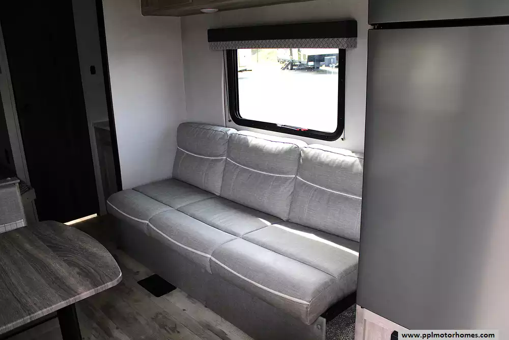 Step inside and you'll find a floorplan that maximizes every inch of space while still feeling open and inviting. This model comfortably sleeps up to 8 people, making it an excellent choice for families or groups. The private front queen bedroom offers a peaceful retreat, while the rear double-over-double bunks are perfect for kids or guests. Plus, the sofa and booth dinette quickly convert into extra sleeping areas, giving everyone a place to relax and recharge after a day of adventure.