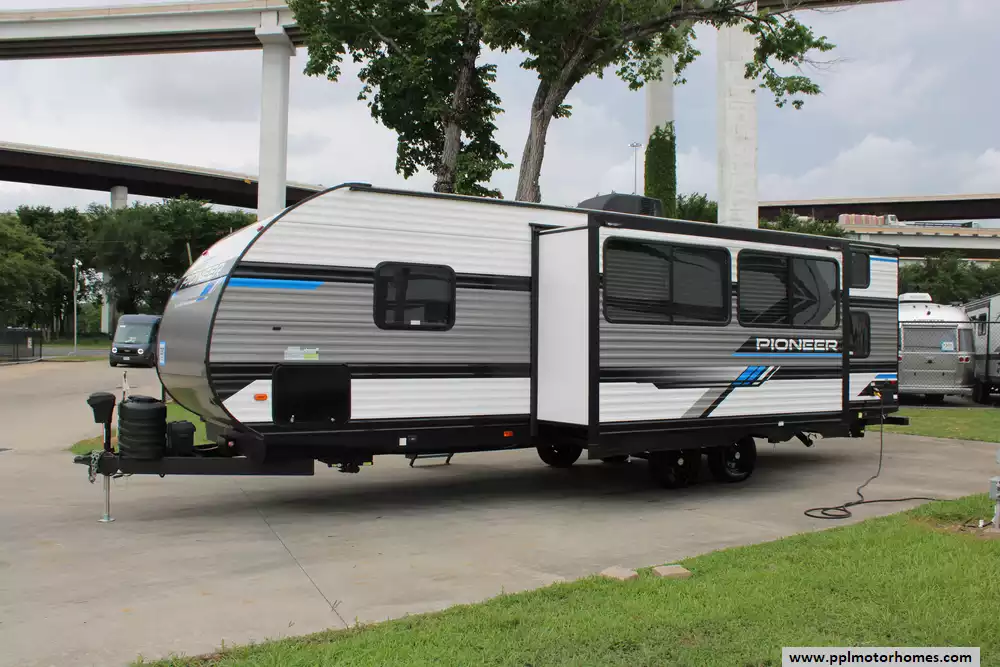 This 2023 Pioneer by Heartland BH270 is a family-friendly travel trailer designed to provide comfort and convenience for your camping adventures. Features Include... Electric Tongue Jack, 1 Slide-out, 1 Ducted Air Conditioner, Double Door Gas/110v Dometic Refrigerator, NEW Automatic Main Awning, Outside Speakers, TV, Outside Shower, Microwave, 3 Burner Range, and Oven. Bonus Brand NEW ROOF..With its spacious interior, thoughtful features, and durable construction, it's well-suited for both weekend getaways and extended stays.
