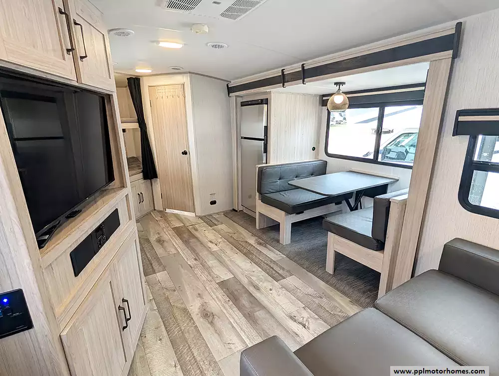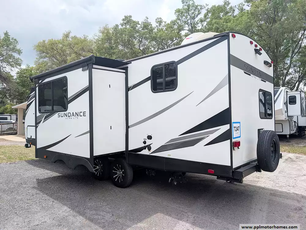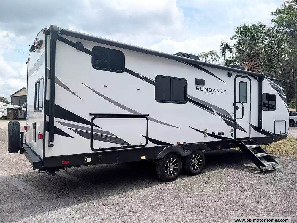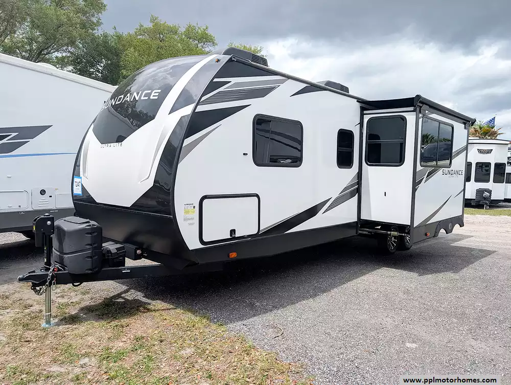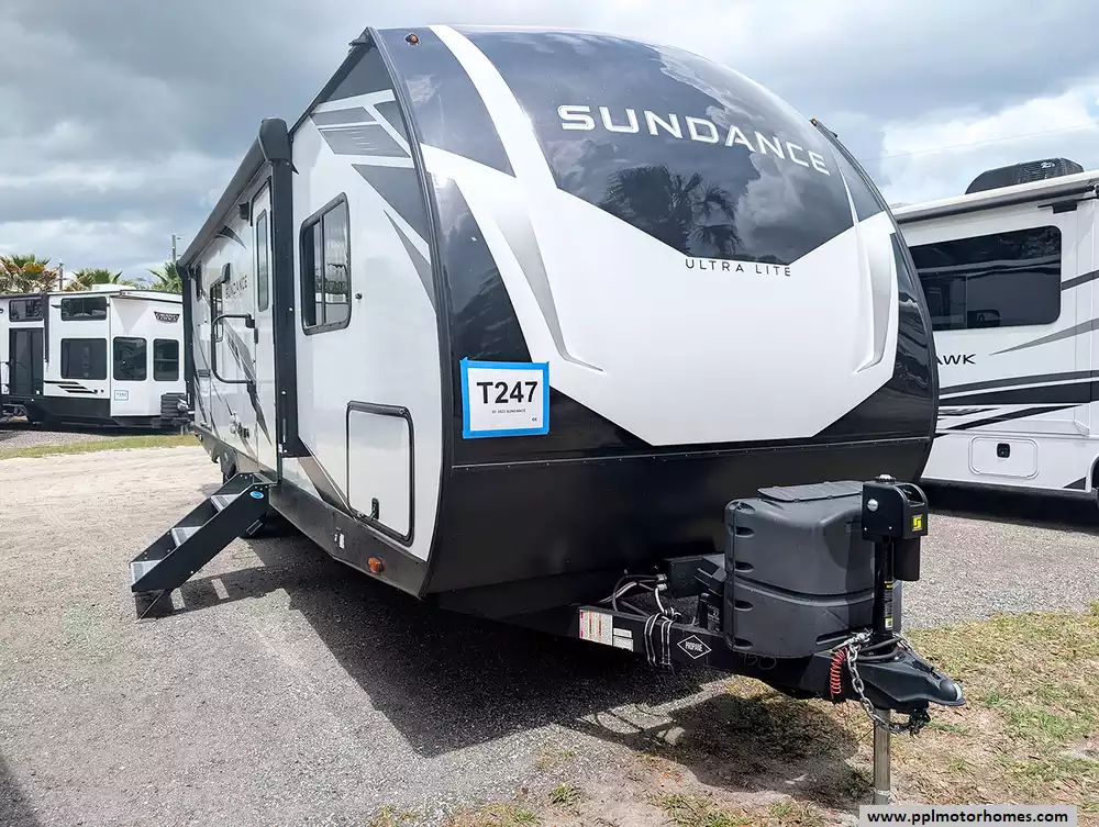 The 2023 Sundance 265BH is a masterclass in combining lightweight towability with high-end luxury, making it a top choice for those seeking both comfort and durability. Built with a sleek fiberglass body and a reliable rubber roof, this 30-foot travel trailer is engineered for the long haul. Setting up camp is effortless thanks to the electric tongue jack and automatic main awning, while the integrated outdoor kitchen, grill, and outside shower transform any campsite into a premium outdoor living space. With outside speakers to set the mood, this Sundance is designed to maximize your time in nature without sacrificing the modern conveniences of home.
