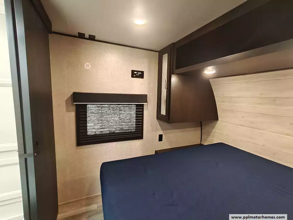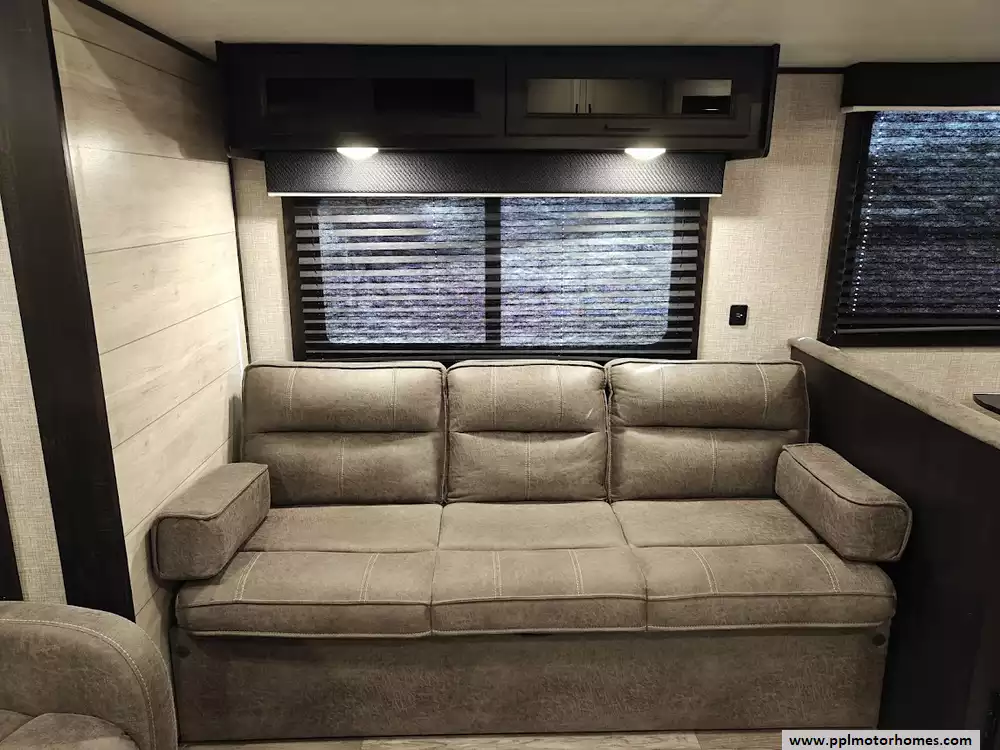 The 265RLS boasts an 81-inch interior ceiling height and vinyl flooring throughout. Standard features include a queen mattress in the private front bedroom, a walk-through bathroom with a radius shower with skylight, and a full kitchen with a 3-burner range, oven, microvwave, an stainless steel refrigerator and a double sink. The living area includes two recliners, a J-Steel jack-knife sofa which convert into additional sleeping space and a convertible booth dinette.