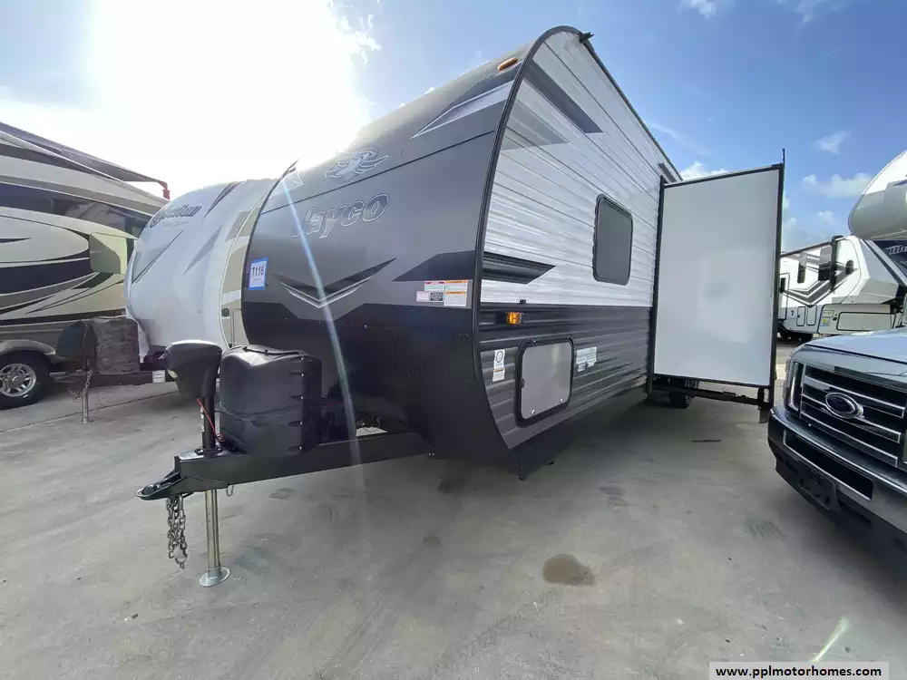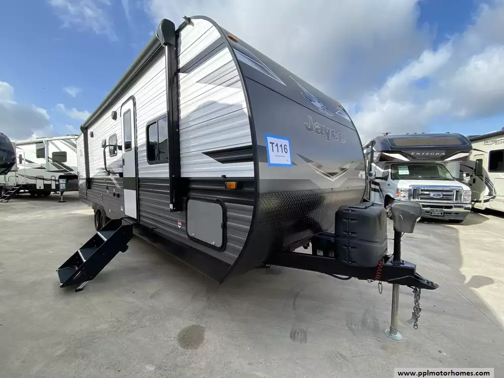This 2023 Jayco Jay Flight 284BHS has an Electric Tongue Jack, 1 Slide-out, 1 Non-Ducted And 1 Ducted Air Conditioner, Double Door 12v Norcold Refrigerator (Additional Refrigerator Present), Automatic Main Awning, Outside Speakers, TV, Outdoor Kitchen, Outside Shower, Microwave, 3 Burner Range, Oven