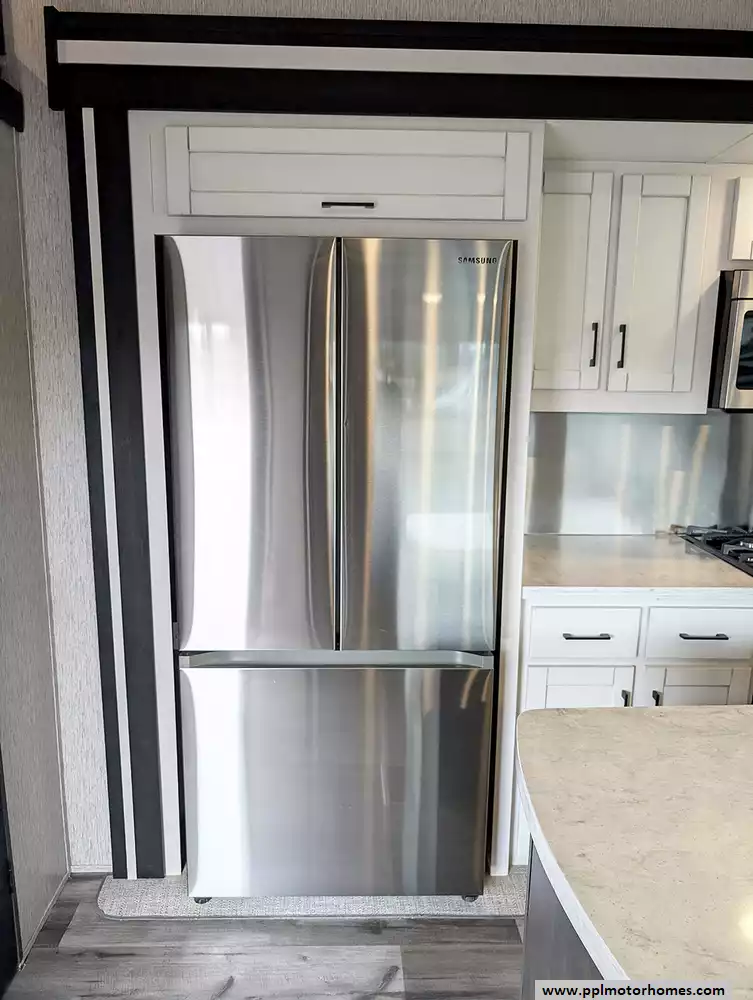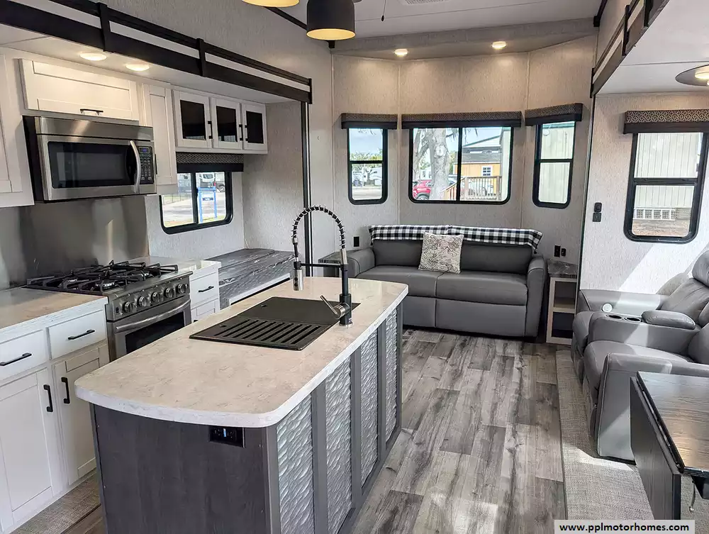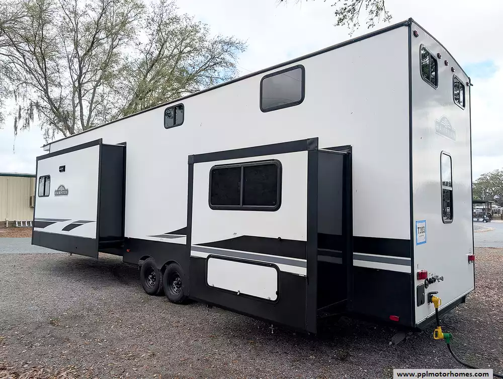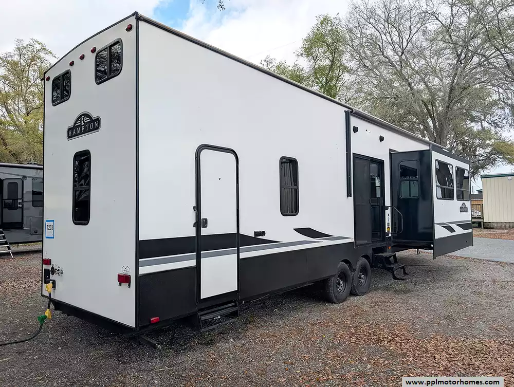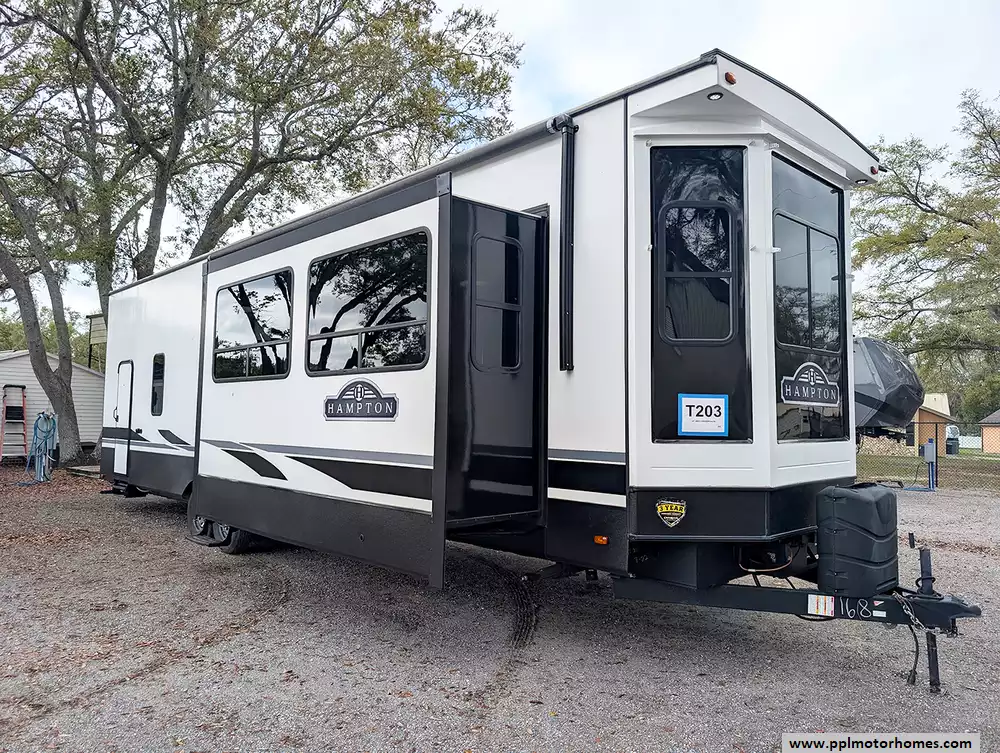 The gourmet-inspired kitchen is a true standout, headlined by a residential Samsung refrigerator with an in-fridge ice maker, a microwave, and a three-burner range with an oven for all your culinary needs. Comfort is guaranteed in any climate with two ducted air conditioners, and the unit is fully prepped for long-term convenience with dedicated washer and dryer connections. For entertainment, you can relax inside with the flat-screen TV and satellite receiver or move the party outdoors to enjoy the outside speakers under the large automatic main awning. Built with a reliable rubber roof and high-end finishes throughout, this Hampton 370FDL offers the perfect blend of residential luxury and vacation-ready durability.