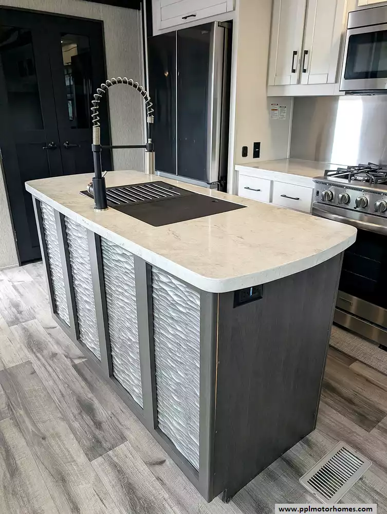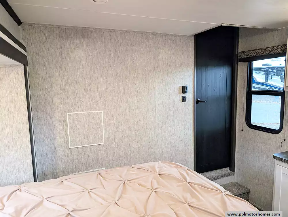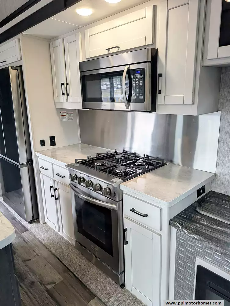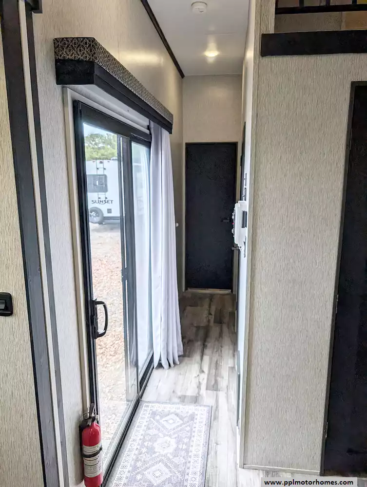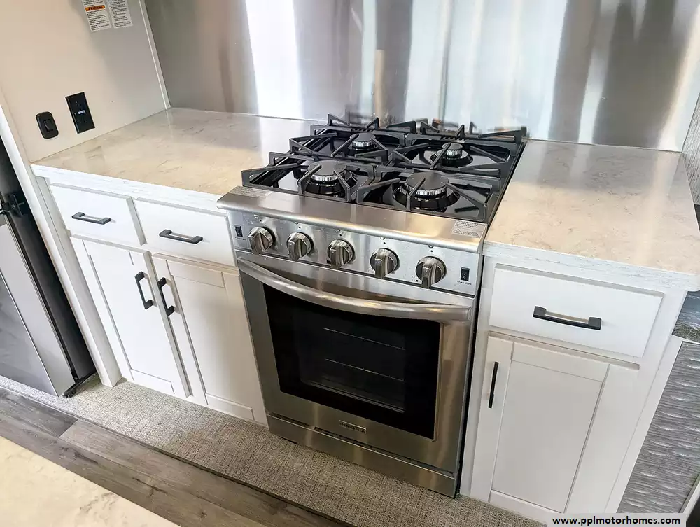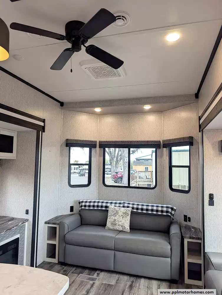 The gourmet-inspired kitchen is a true standout, headlined by a residential Samsung refrigerator with an in-fridge ice maker, a microwave, and a three-burner range with an oven for all your culinary needs. Comfort is guaranteed in any climate with two ducted air conditioners, and the unit is fully prepped for long-term convenience with dedicated washer and dryer connections. For entertainment, you can relax inside with the flat-screen TV and satellite receiver or move the party outdoors to enjoy the outside speakers under the large automatic main awning. Built with a reliable rubber roof and high-end finishes throughout, this Hampton 370FDL offers the perfect blend of residential luxury and vacation-ready durability.