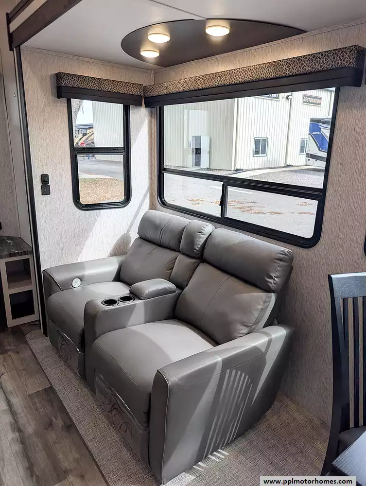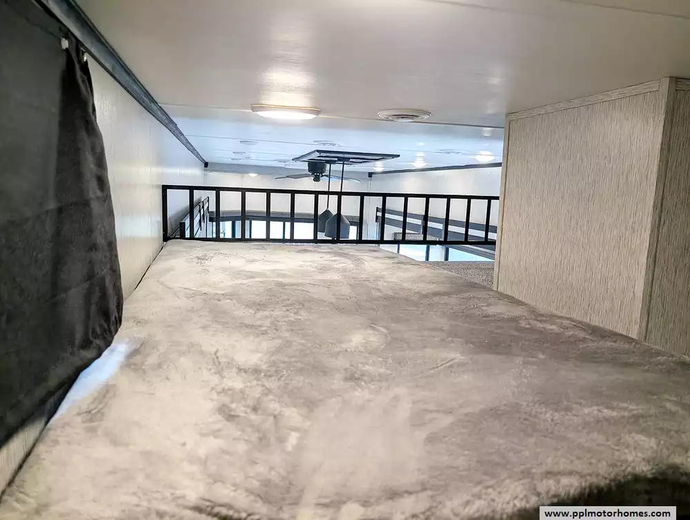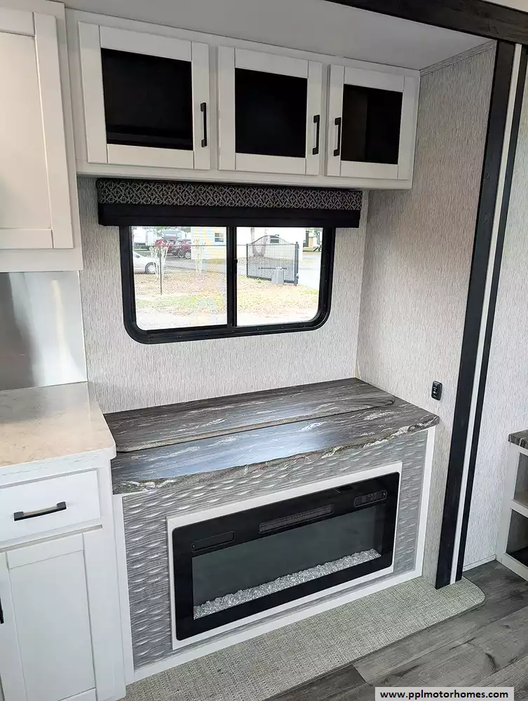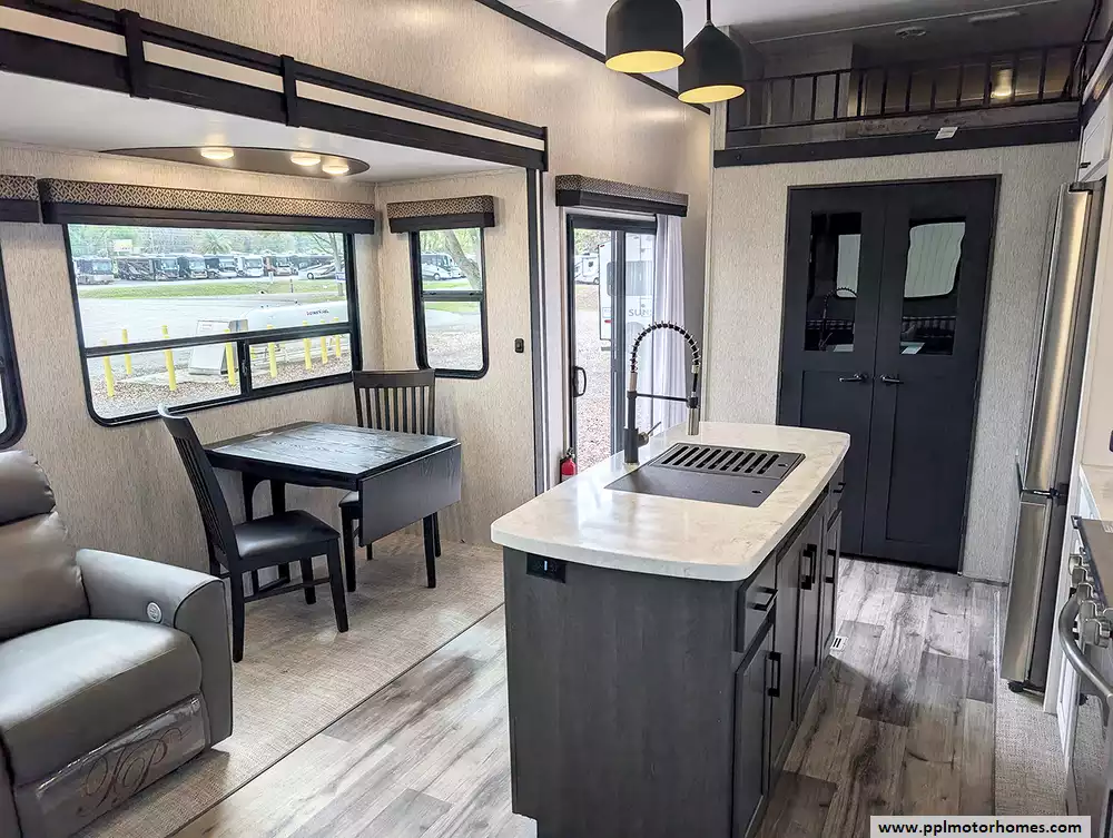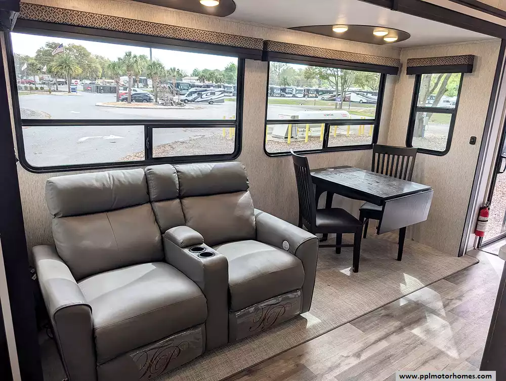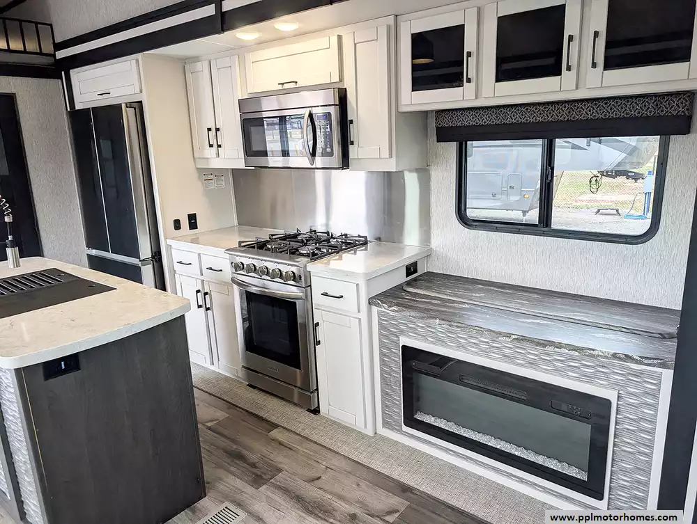 Experience the pinnacle of seasonal living with this 2023 Crossroads Hampton 370FDL. Renowned for its industry-leading eight-foot ceiling heights and sophisticated residential styling, the Hampton series is the gold standard for luxury destination trailers designed for extended stays. This 41-foot model features a durable fiberglass exterior and a triple slide-out configuration that creates an expansive, open-concept floor plan. The signature front double loft design provides exceptional versatility for guests or extra storage, while the dual opposing slides in the main living area offer a spacious environment anchored by a cozy built-in fireplace and large windows that invite plenty of natural light.