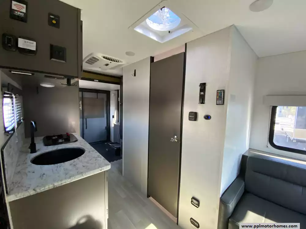 This 2023 Escape E18 HATCH has a 1 Non-Ducted Air Conditioner, Double Door 12v Furrion Refrigerator, Automatic Main Awning, Microwave, 2 Burner Range, Rear Camera System
