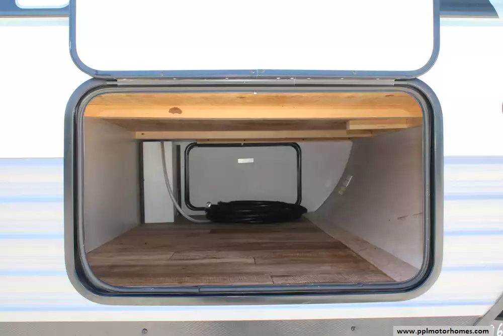 This 30-foot trailer is built to last with wood framing, metal sidewalls, and a fully enclosed, insulated underbelly. It includes a single slideout for added living space, a power awning with LED lighting, and a robust Tufflex walk-on roof. Entry is made safer and more convenient with a set of solid steps, while entertainment needs are supported by a built-in Furrion soundbar, although a TV is not included. The interior climate stays comfortable year-round thanks to a 13,500 BTU A/C unit and a 30,000 BTU furnace.