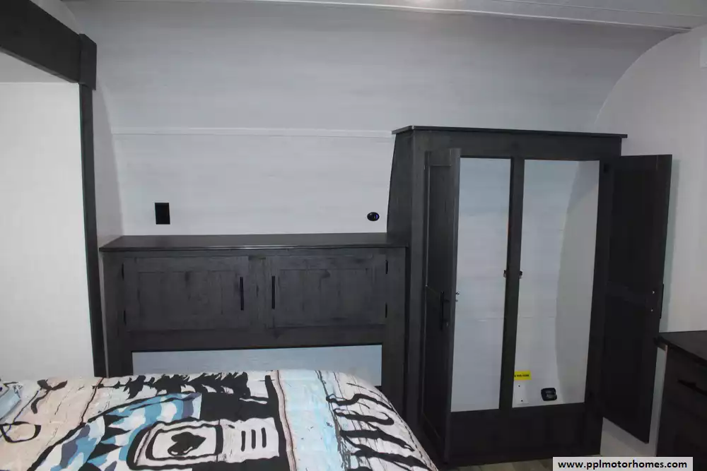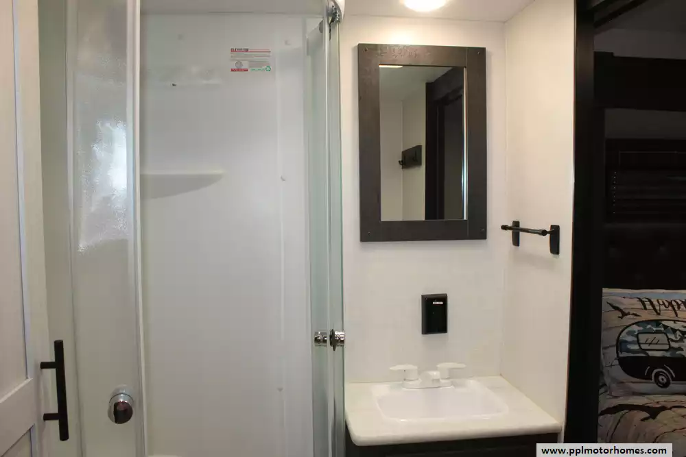 Specs: Length: 34.7 ft., Width: 8 ft., Height: 11 ft., Interior Height: 6.5 ft., Payload Capacity: 1,250 lbs., Total Fresh Water Tank Capacity: 45 gal., Total Gray Water Tank Capacity: 32 gal., Total Black Water Tank Capacity: 32 gal., Total Propane Tank Capacity: 40 lbs.