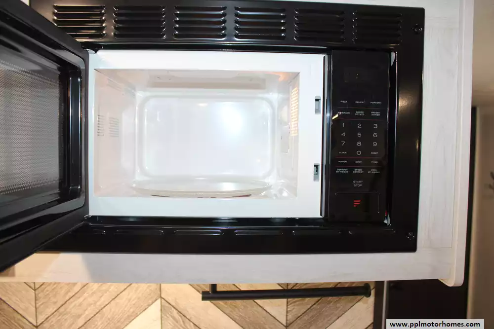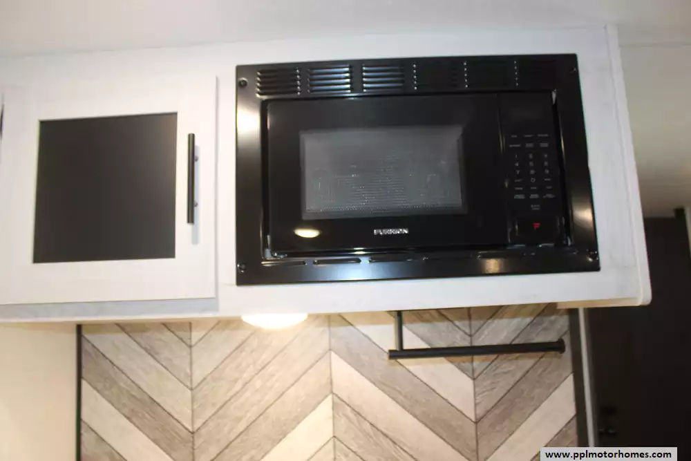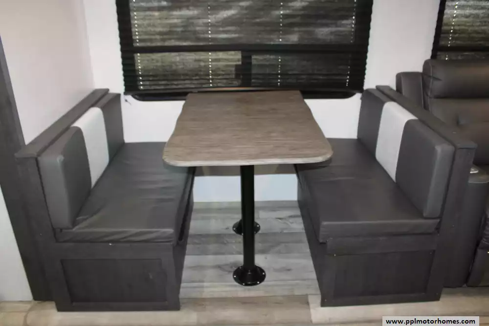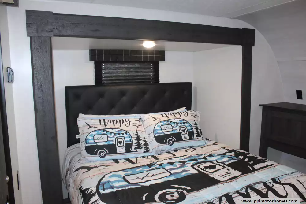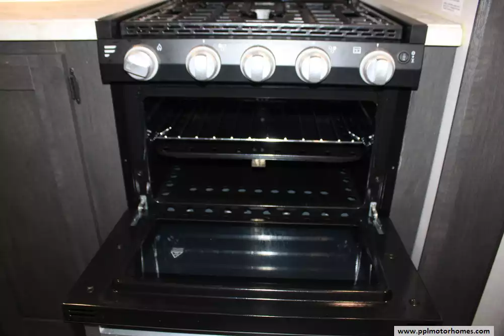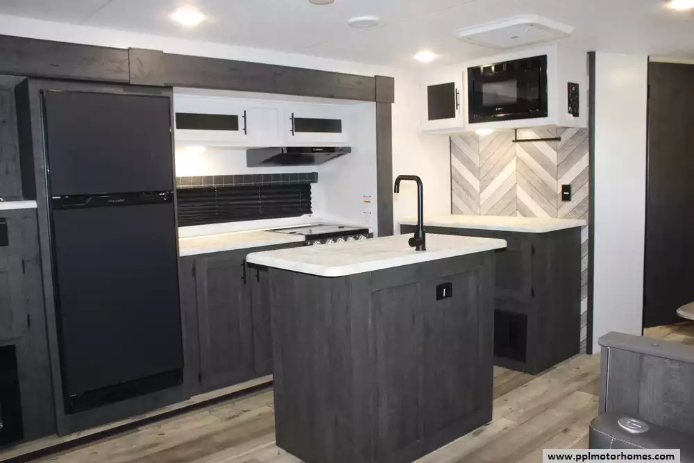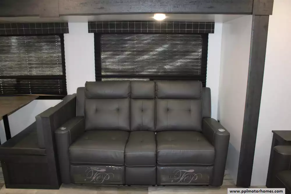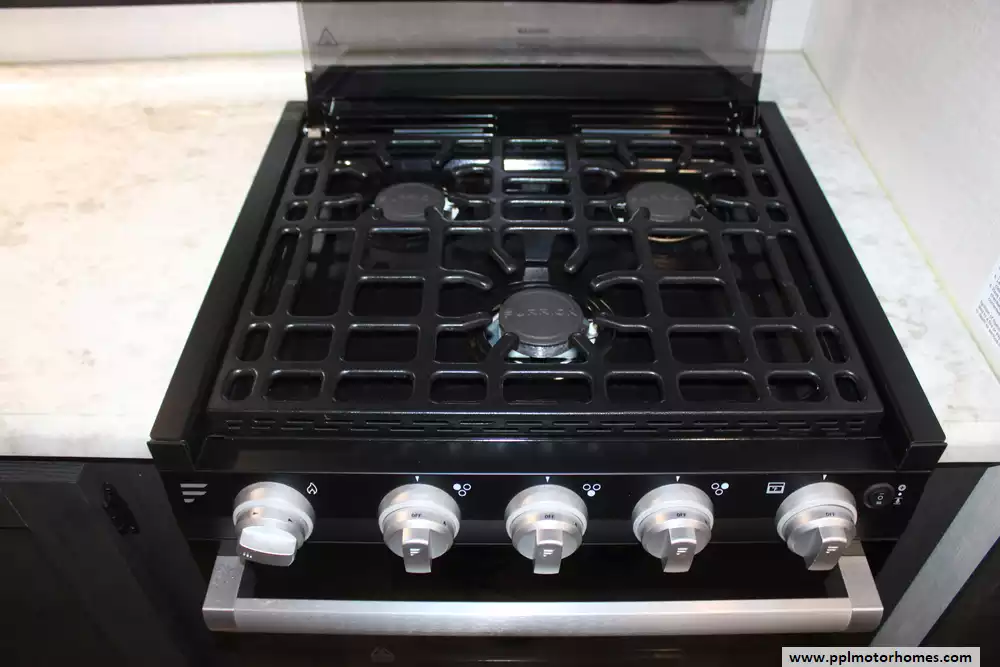The interior is a chef's dream, featuring a well-appointed kitchen equipped with a three-burner range, an oven, a microwave, and a spacious double-door Furrion refrigerator. Relaxation comes easy in the main lounge, where you can enjoy the cozy ambiance and supplemental heat of the built-in fireplace. To ensure your comfort in any climate, this unit comes equipped with two ducted air conditioners, providing superior temperature control and quiet airflow throughout the entire coach.