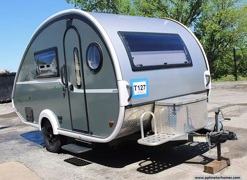 2023 nuCamp TAB 400 Boondock, a premium teardrop-style travel trailer that blends rugged capability with upscale comfort. Designed for those who want to explore off the beaten path without giving up the finer things, this unit features a sleek fiberglass exterior, one-piece aluminum roof, and aggressive Boondock package upgrades including off-road tires, a pitched axle, and a rugged front utility platform. The iconic teardrop shape not only turns heads but also improves towing efficiency, making this camper as practical as it is stylish.