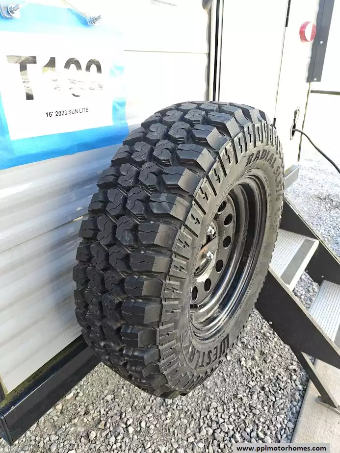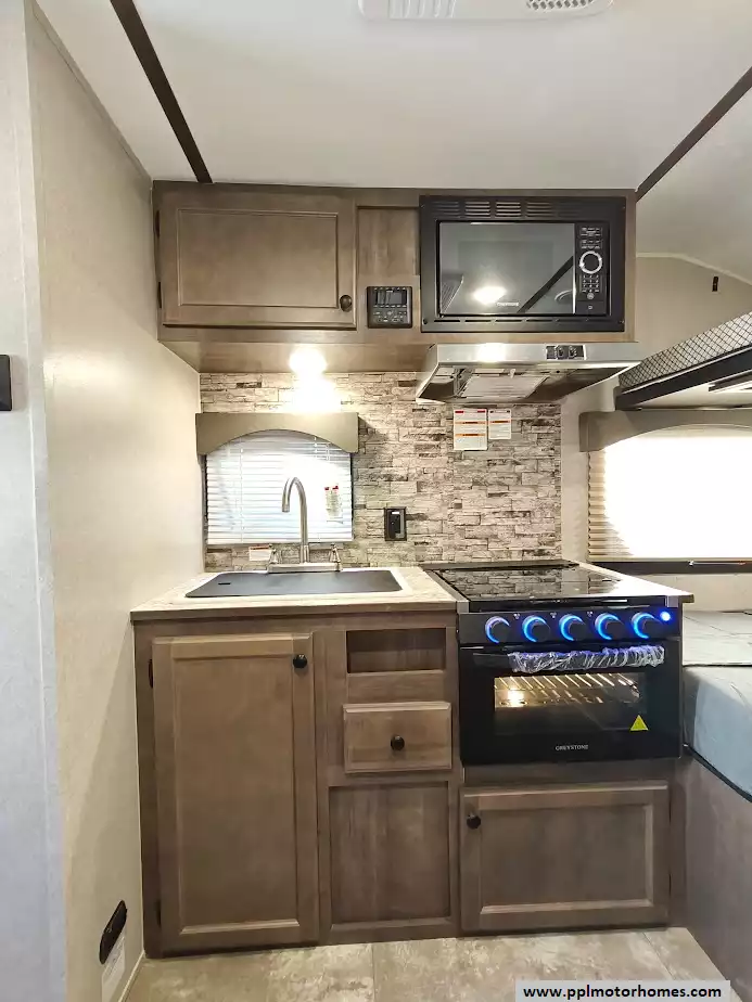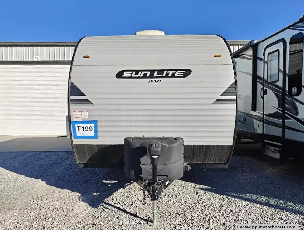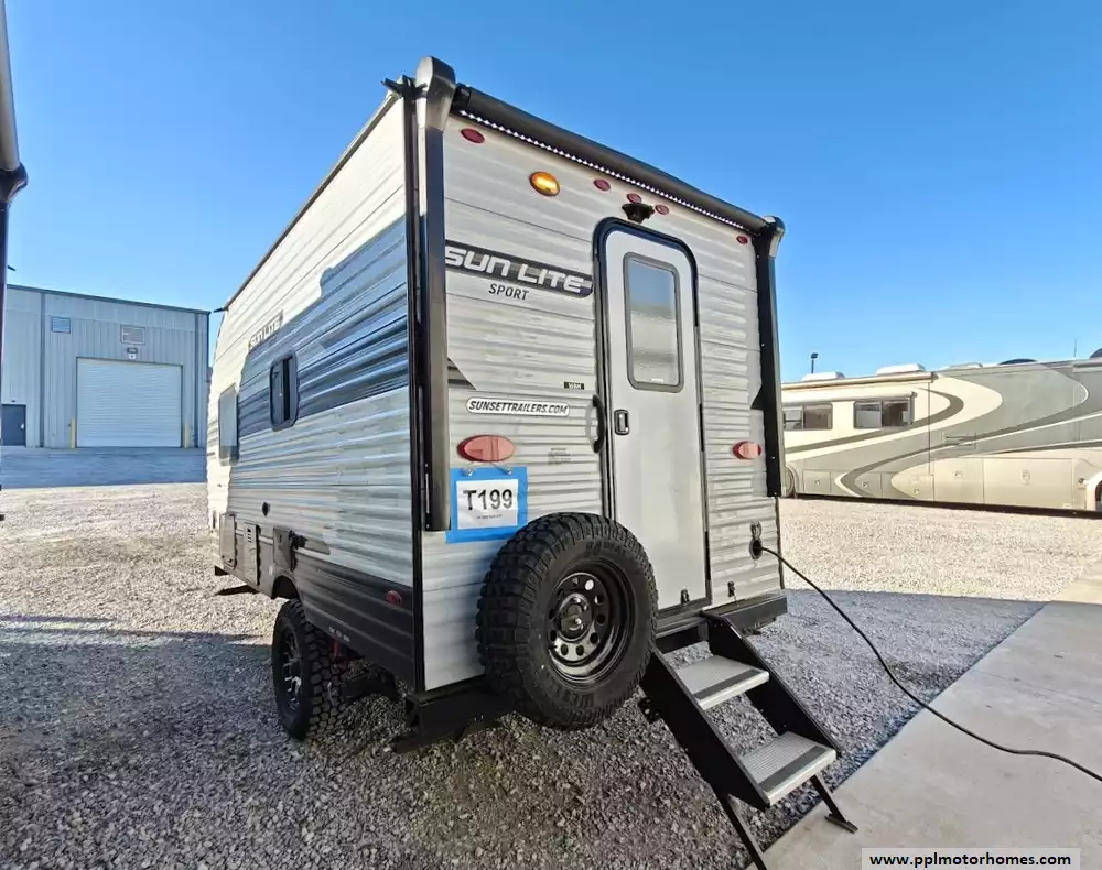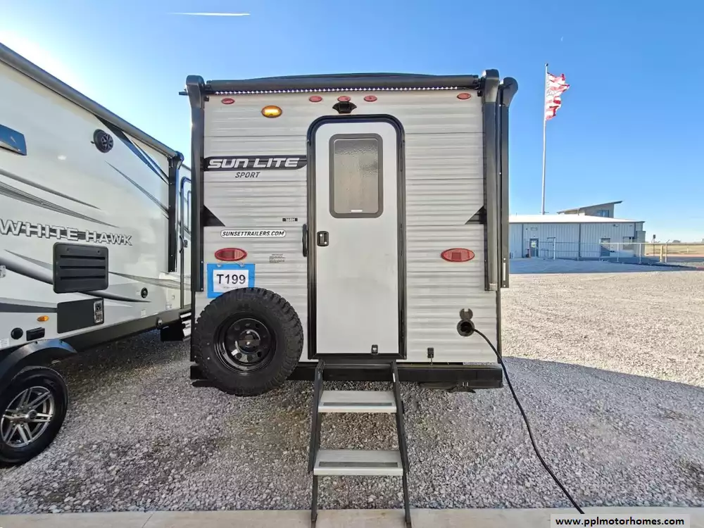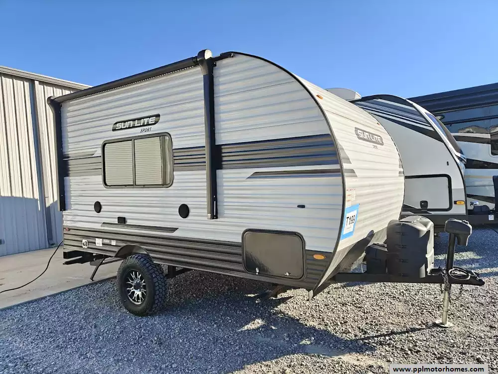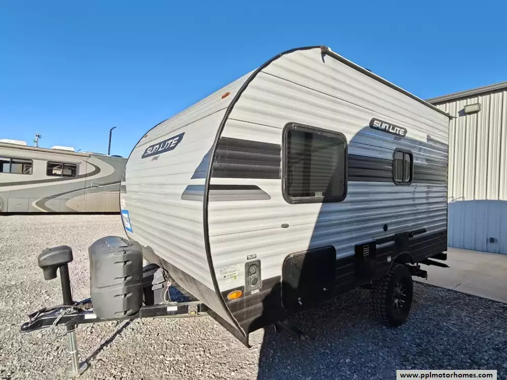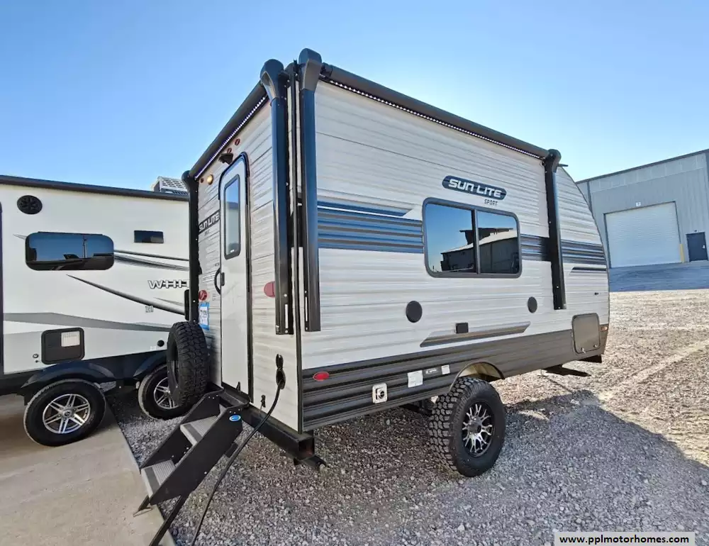 This 2023 Sun Lite 16BH features a full kitchen witha 3-burner stove, microwave, oven, double door 12v Everchill refrigerator and large sink. The dinette converts into a bed and the rear overhead bunk, above the main queen sized bed, can fold up for extra space when not in use. It also has a dry bath with a separate shower and toilet. The exterior is equipped with two power awnings (one side and one rear), outside speakers, outside shower, pass-through storage off-road tires , and a power tongue jack. It is also pre-wired for solar and backup cameras and has a Bluetooth stereo system, and multiple USB/110V outlets. Other features include 1 non-ducted Air Conditioner.