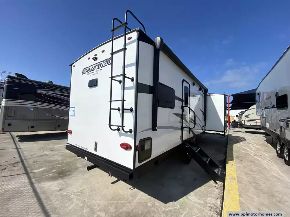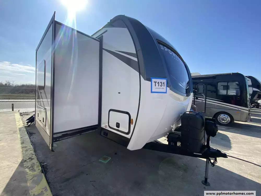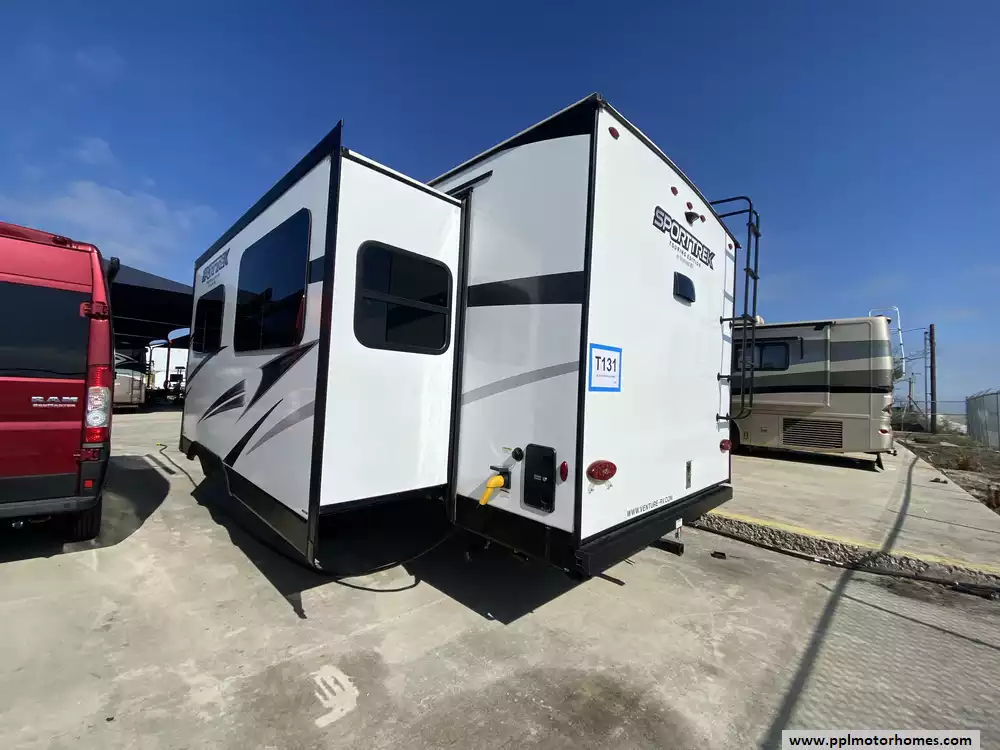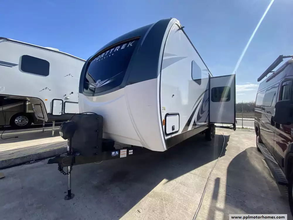 This 2023 Sporttek Touring 272VRK has an Electric Tongue Jack, 2 Slide-outs, 2 Ducted Air Conditioners, Double Door 12v Furrion Refrigerator, Automatic Main Awning, Solar Panel, Outside Speakers, TV, DVD Player, Outside Shower, 2 Fireplace, Microwave, 3 Burner Range, Oven