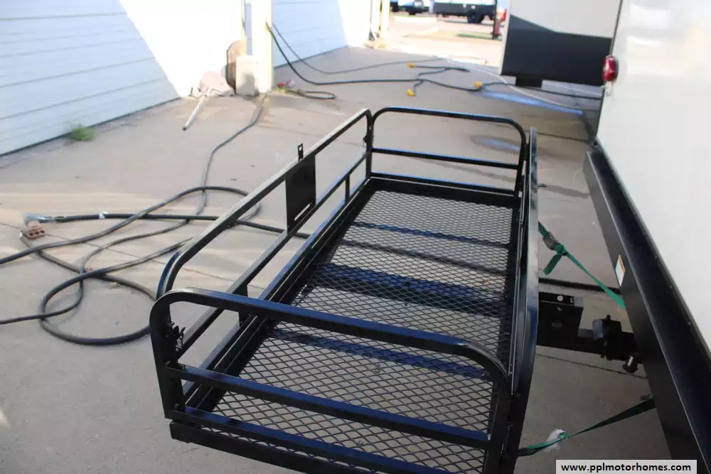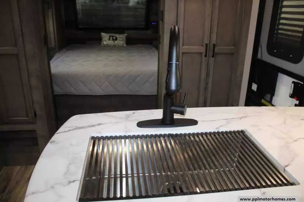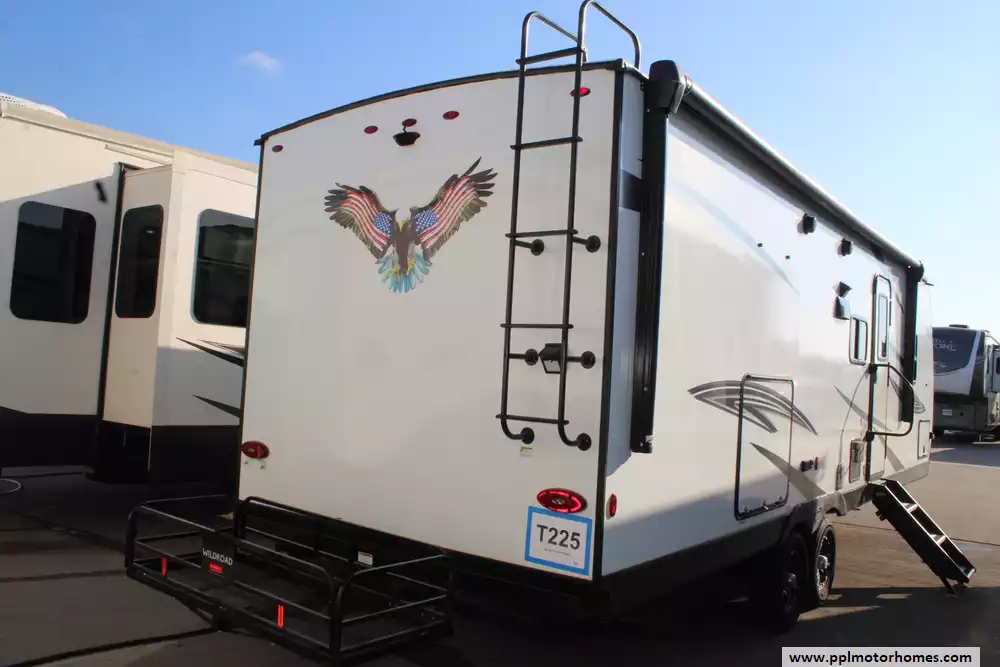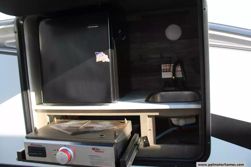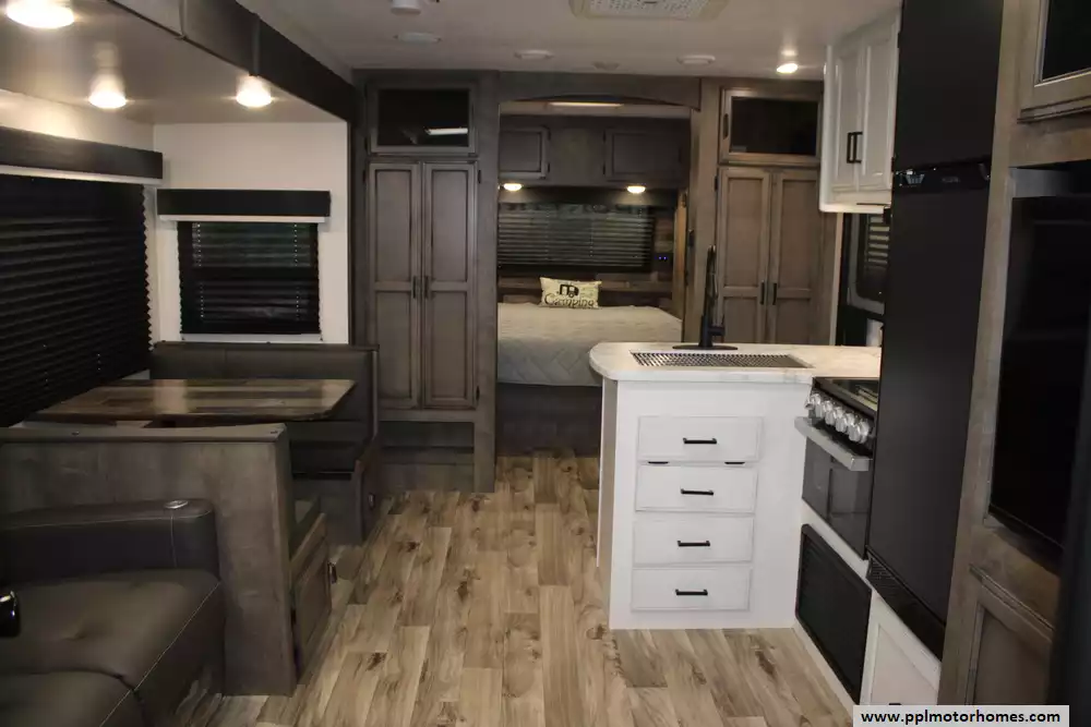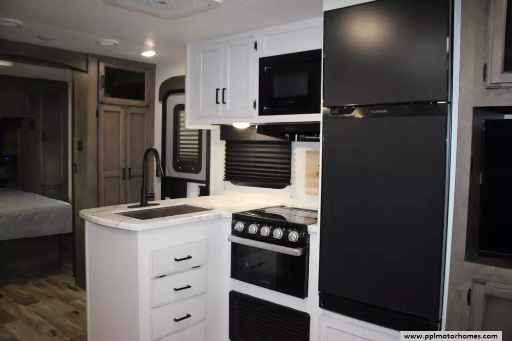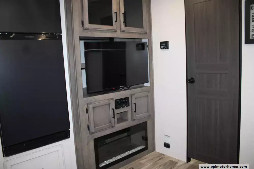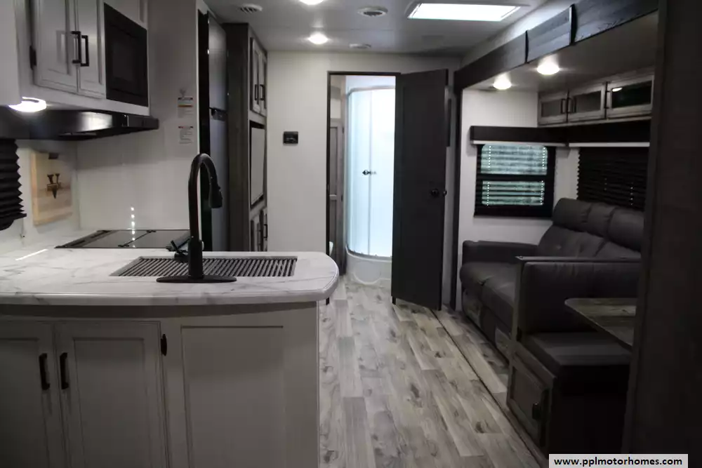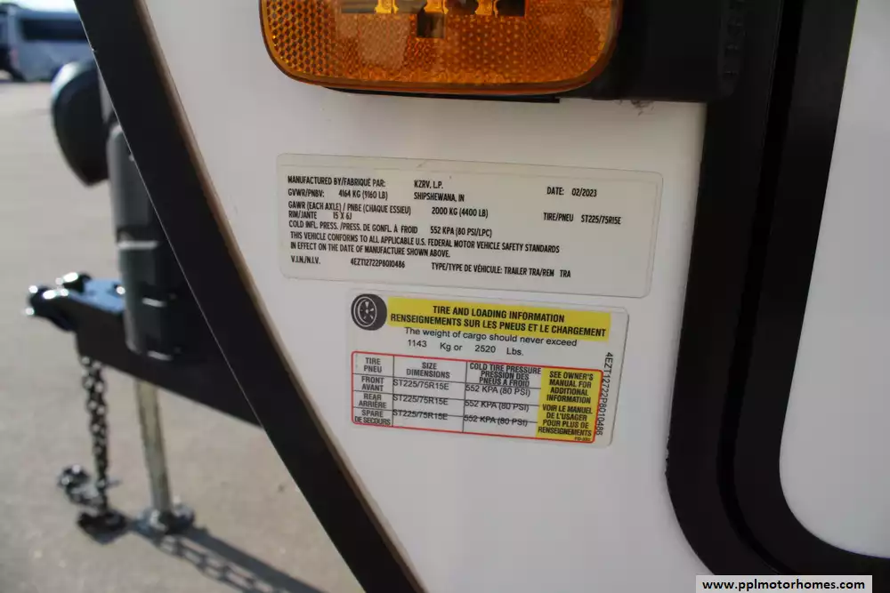 The 2023 Venture RV SportTrek ST-271VMB is a well-rounded travel trailer offering a cozy yet spacious setup for family or couples adventures. It weighs in at about 6,600 lbs unloaded (UVW) with a tongue weight of roughly 750 lbs, spans 30' 8" long, stands 11' 4" high with A/C, and is 96" (8 ft) wide. This one sleeps up to 4 people in a layout that includes a private front bedroom, a generous slide-out with living/dining area, and a rear bath. The trailer comes with useful water capacities (45 gal fresh, 69 gal gray, 34.5 gal black), a 10 cu ft refrigerator, 3-burner cooktop, radius shower, power awning, and modern touches like a 40" smart TV, fireplace, and upgraded interior finishes. It also includes rear and side cameras, an outside kitchen with a single-door refrigerator and griddle, rear-mount flip-up storage rack, tinted windows, surround sound speakers, and hidden storage behind the living room TV. Upgrade your adventures in this amenity-friendly RV!