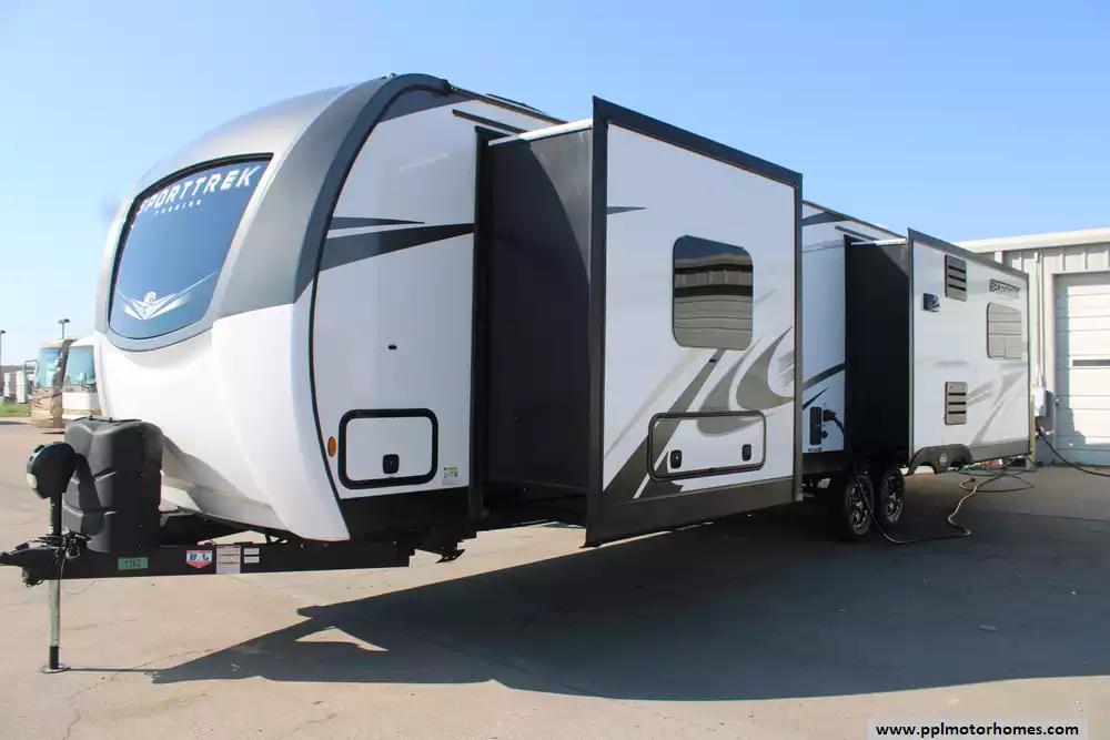 This 2023 Sporttrek Touring 343VIK Is In Need Of New Adventures! Some Highlights Include.... An Electric Tongue Jack, 4-Point Electric Stabilizing System, 3 Slide-Outs, MORryde "Step Above" Entry Steps, Rear Accessory Hitch, Dual Power Awnings, Enclosed Underbelly With Forced Heat, Azdel Panels, 2 Roof-Ducted Air Conditioners, Double Door Gas/110v Norcold Refrigerator (Additional Refrigerator Present), Automatic Main Awning, Washer/Dryer Connections, 100-Watt Solar Panel, Outside Speakers, TV, DVD Player, Outdoor Kitchen (Griddle/Sink/Refrigerator), Outside Shower, Living Room And Bedroom Fireplace, Kitchen Island, Pantry With Custom-Made Pull-Out Baskets, Microwave, 3 Burner Range, Oven, Pre-Wired For King Wifi, Adjustable Split King Sleep Number Bed, Farmhouse Interior, And More! Feel Right At Home In This 2023 Sporttrek Touring! This Travel Trailer Is Eligible For Protection. Ask About PPL's Convenient Financing Options.