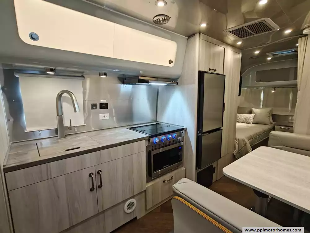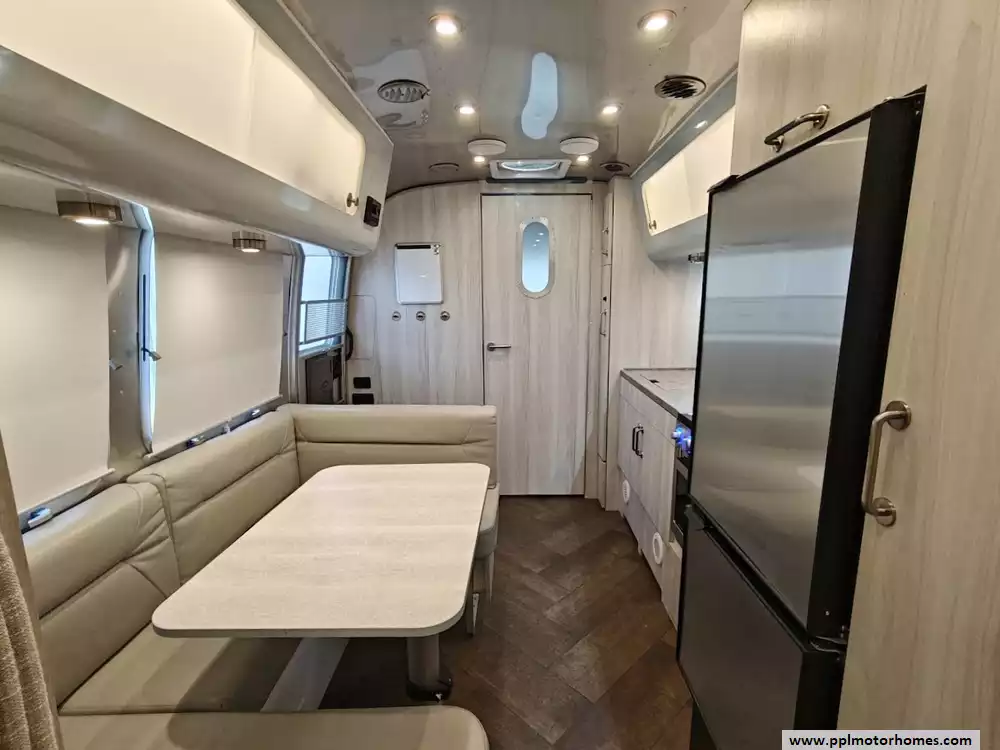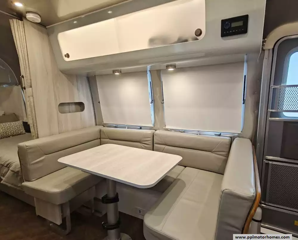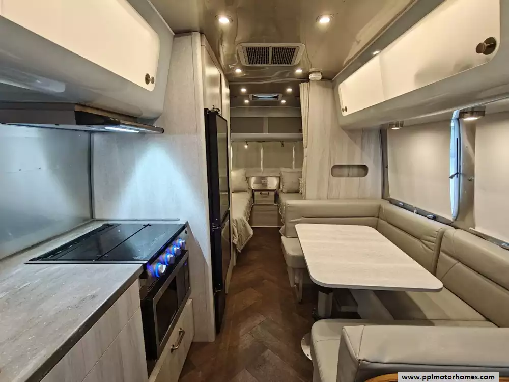 The 2024 Airstream International 23FB Twin is a 23 ft 11 in, dual-axle travel trailer and designed to sleep up to four people, The twin bed configuration provides a more open center aisle and increased storage. The interior of the International trim is designed to feel like a "silver sanctuary" with a light, airy, beach-inspired aesthetic, using high-end materials and finishes. The decor features Ultraleatherr lounge and dinette seating, along with seamless vinyl flooring. The primary seating area features Ultraleatherr cushions and comfortably seats four people for dining and can be converted into an additional sleeping area measuring approximately 39" x 76". The living area includes handcrafted Italian Lite-Ply cabinetry with translucent sliding doors and integrated LED lighting to illuminate the interior.