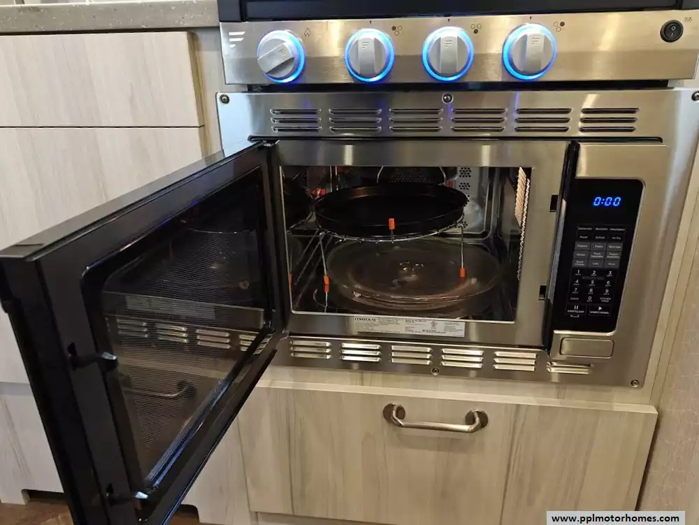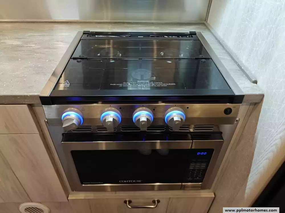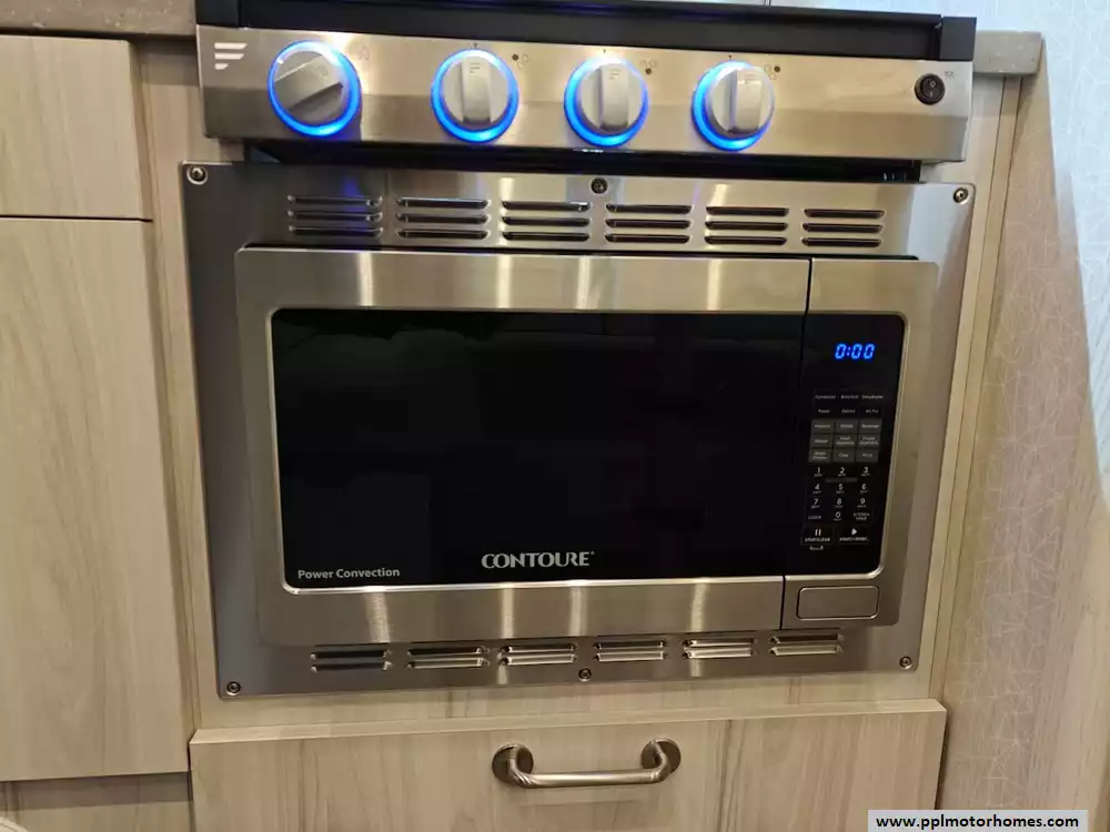 The kitchen includes a 3-burner LP gas cooktop, a convection microwave a 12V 6.8 cu. ft. electric refrigerator, a stainless steel undermounted sink, and a Dupont Corianr galley top.