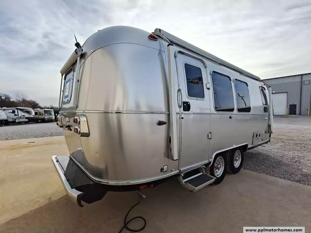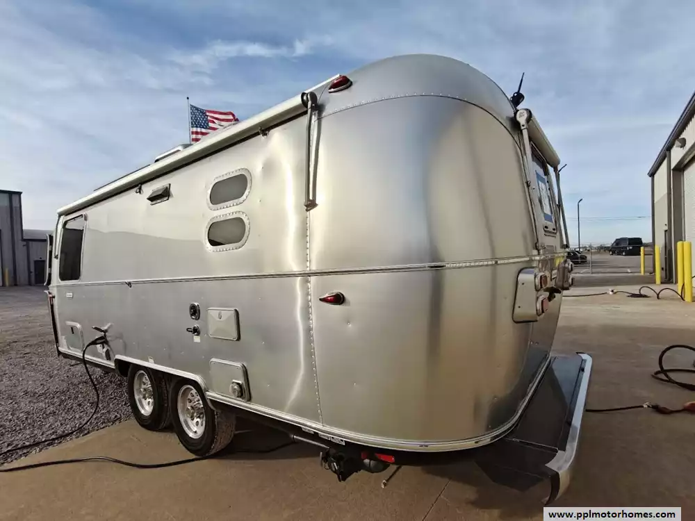 The 2024 Airstream International 23FB Twin features the brand's iconic semi-monocoque aluminum superstructure with high-end exterior utilities designed for durability and ease of use.