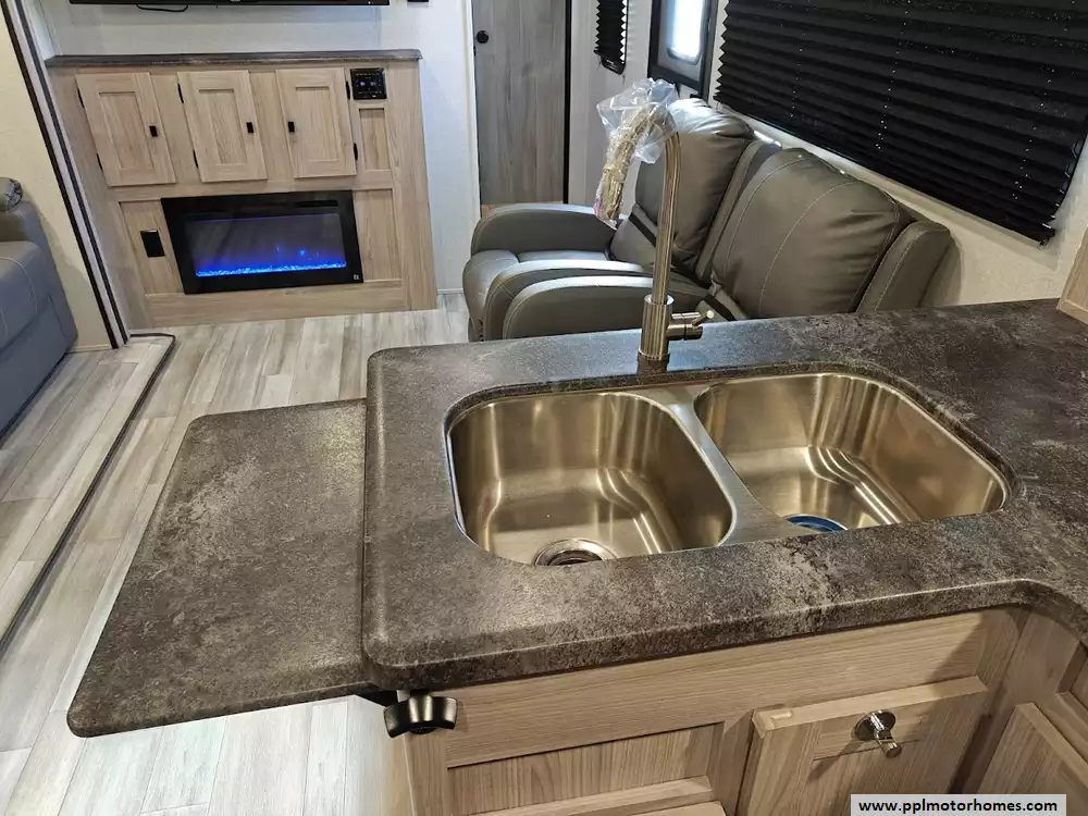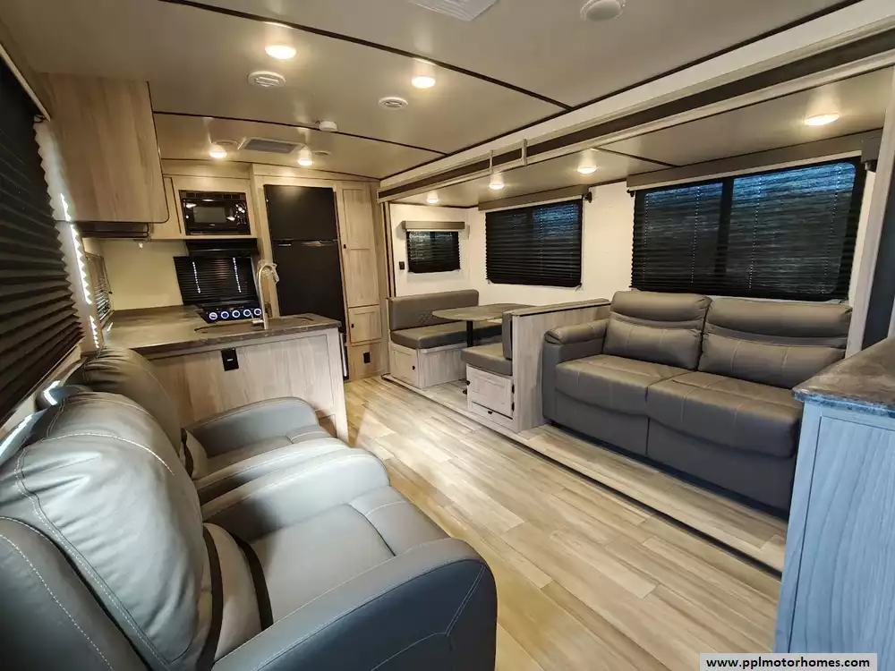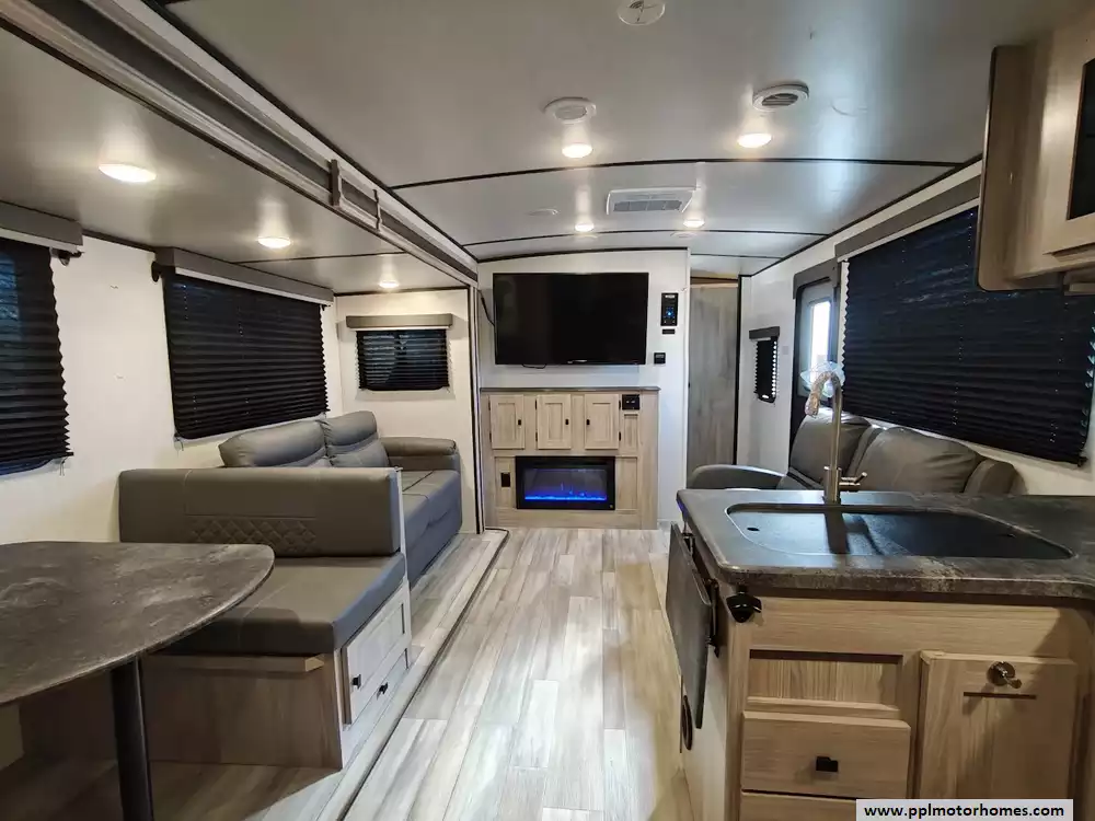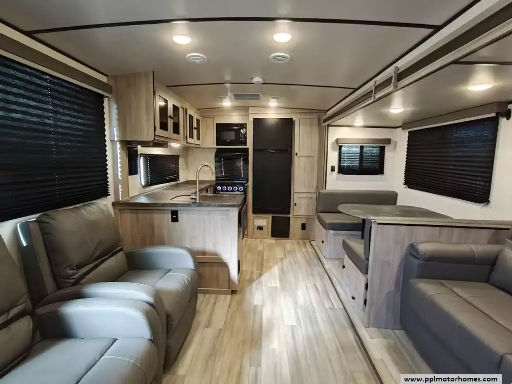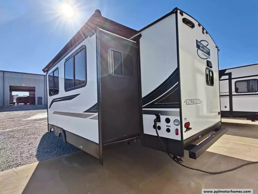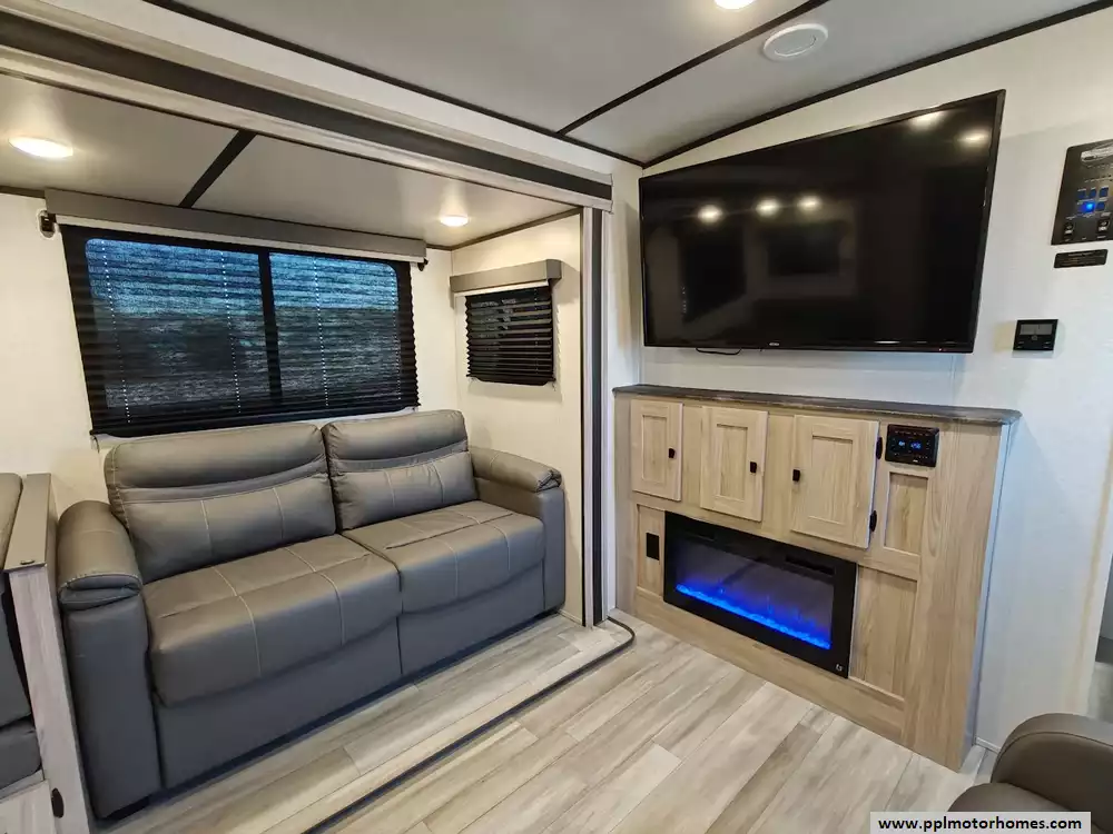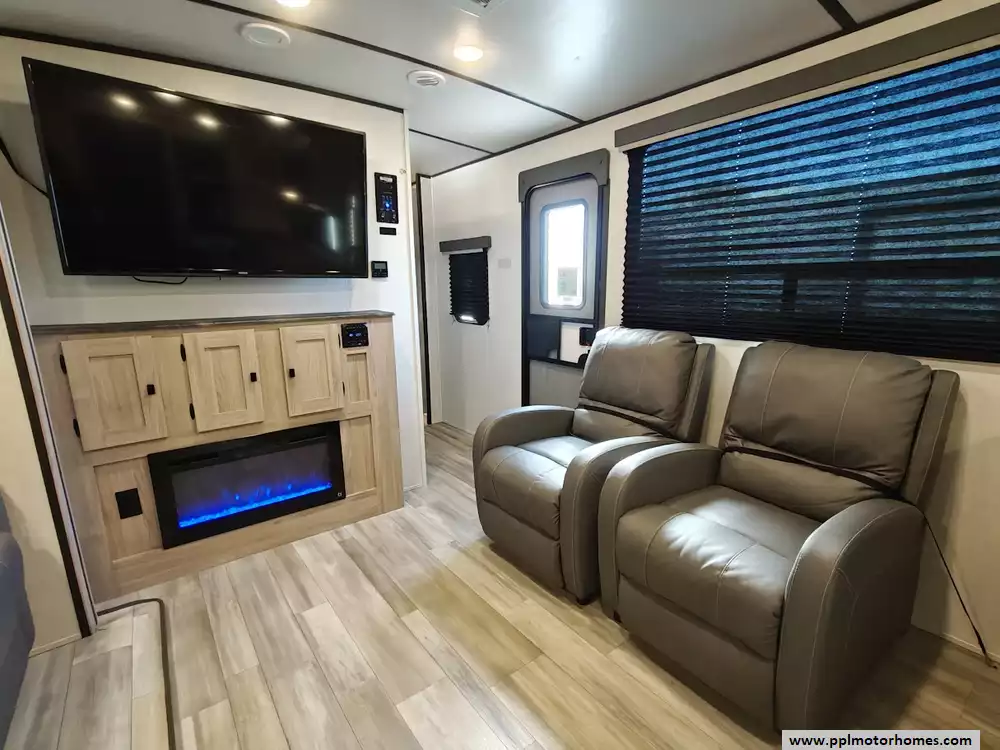 The 2024 Coachmen Northern Spirit Ultra Lite 2965RK features a rear kitchen layout that transitions into an open-concept living area with a large slide-out, and a front private bedroom and a center bathroom. The kitchen is located at the very back of the travel trailer, offering a significant amount of counter space and a large pantry. It includes a deep basin farm-style sink, a three-burner cooktop with an oven, a microwave, and a 10 cubic foot 12V refrigerator. The living area is in the center of the RV, made spacious by a single large slide-out. The slide-out contains a booth dinette (which can convert into a sleeping area) and a tri-fold sofa for additional sleeping capacity. Opposite the slide, there are two recliners positioned near an electric fireplace and entertainment center with a large TV. The full bathroom is located in the hallway area leading to the front bedroom. It features a large shower with a tri-slide glass door, a porcelain foot flush toilet, a vanity with a sink, a medicine cabinet, and a power vent and skylight. The private front bedroom includes a walk-around queen-size bed (60" x 80") with extensive storage options, including hanging rods, drawers, and cubbies, some of which are motion-activated. It also features bedside nightstands with outlets.
