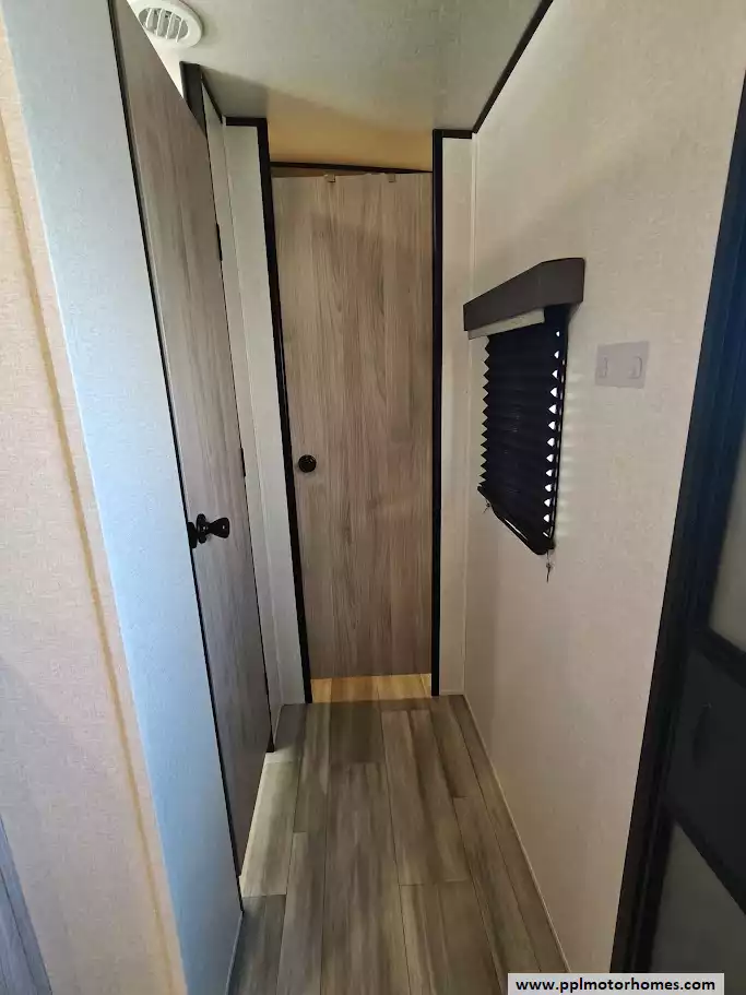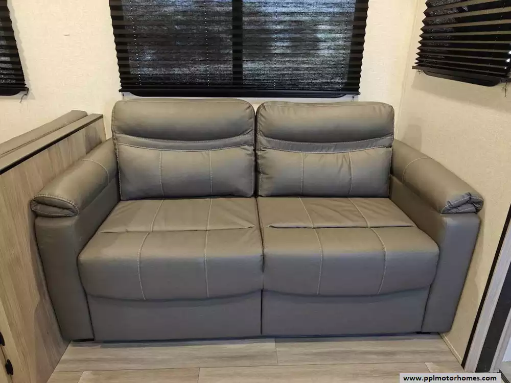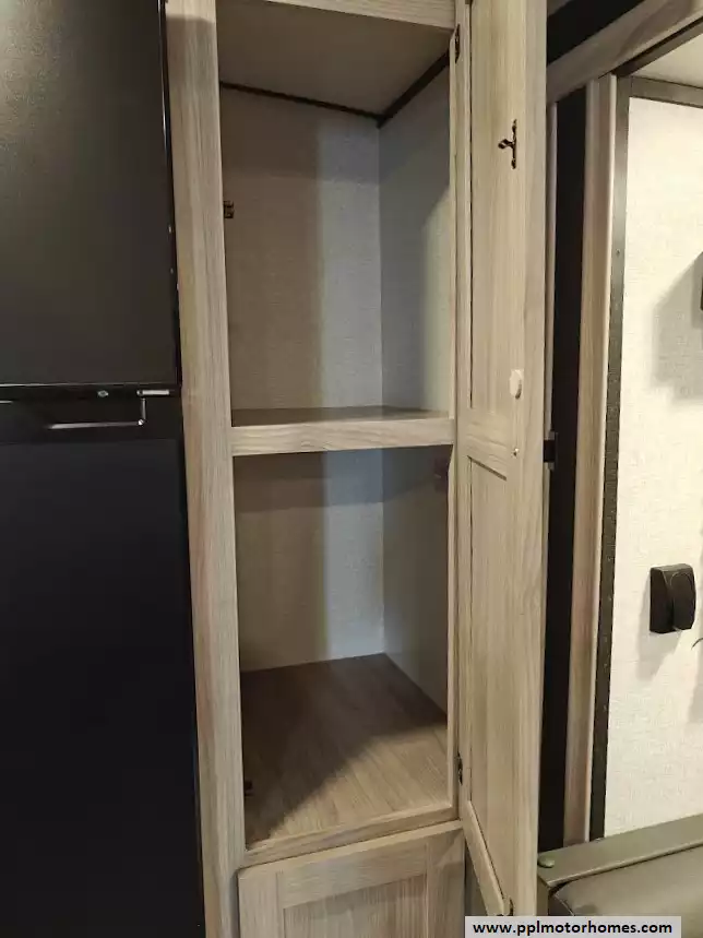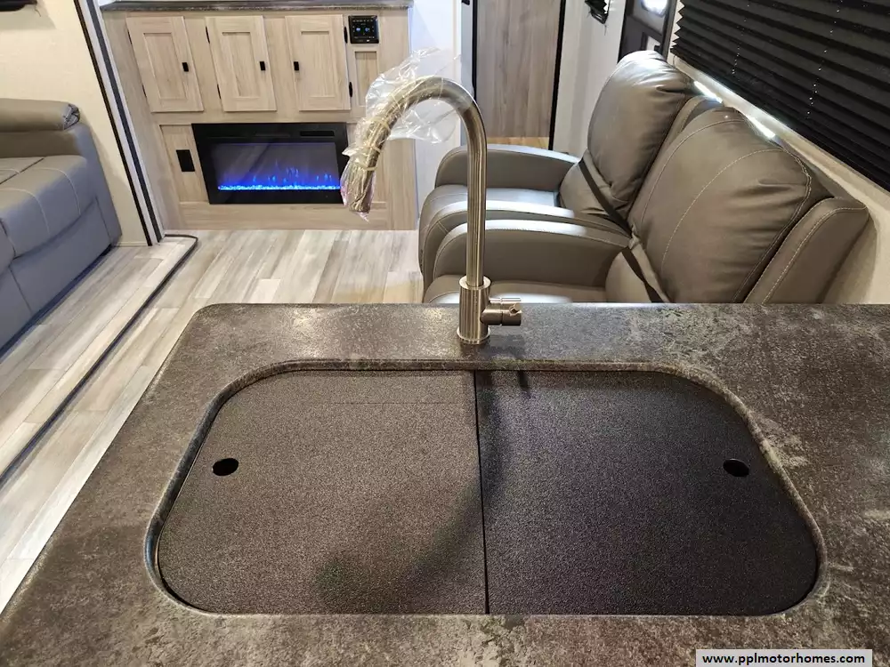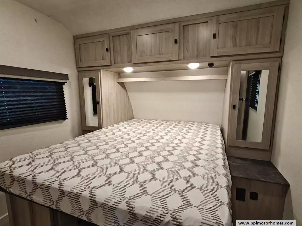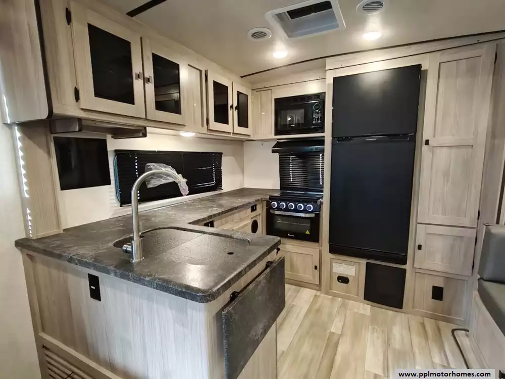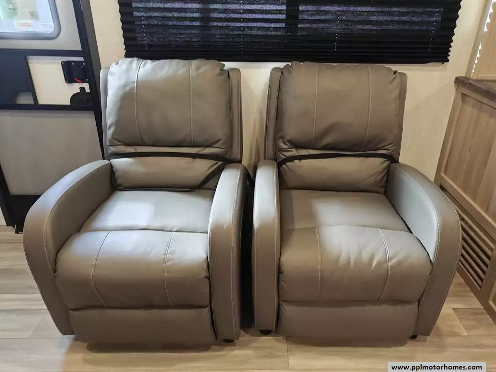 The 2024 Coachmen Northern Spirit Ultra Lite 2965RK features a rear kitchen layout that transitions into an open-concept living area with a large slide-out, and a front private bedroom and a center bathroom. The kitchen is located at the very back of the travel trailer, offering a significant amount of counter space and a large pantry. It includes a deep basin farm-style sink, a three-burner cooktop with an oven, a microwave, and a 10 cubic foot 12V refrigerator. The living area is in the center of the RV, made spacious by a single large slide-out. The slide-out contains a booth dinette (which can convert into a sleeping area) and a tri-fold sofa for additional sleeping capacity. Opposite the slide, there are two recliners positioned near an electric fireplace and entertainment center with a large TV. The full bathroom is located in the hallway area leading to the front bedroom. It features a large shower with a tri-slide glass door, a porcelain foot flush toilet, a vanity with a sink, a medicine cabinet, and a power vent and skylight. The private front bedroom includes a walk-around queen-size bed (60" x 80") with extensive storage options, including hanging rods, drawers, and cubbies, some of which are motion-activated. It also features bedside nightstands with outlets.