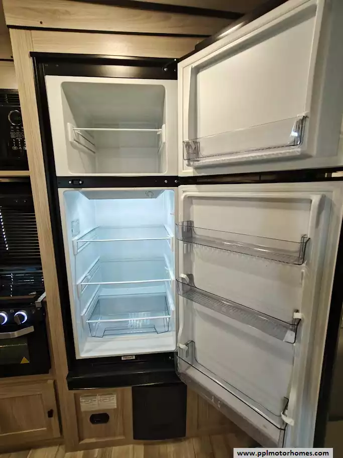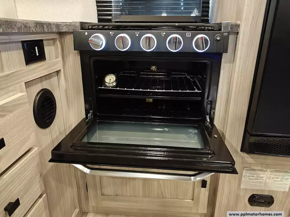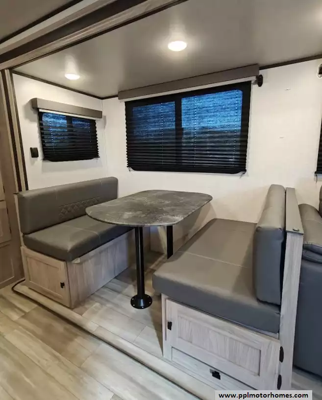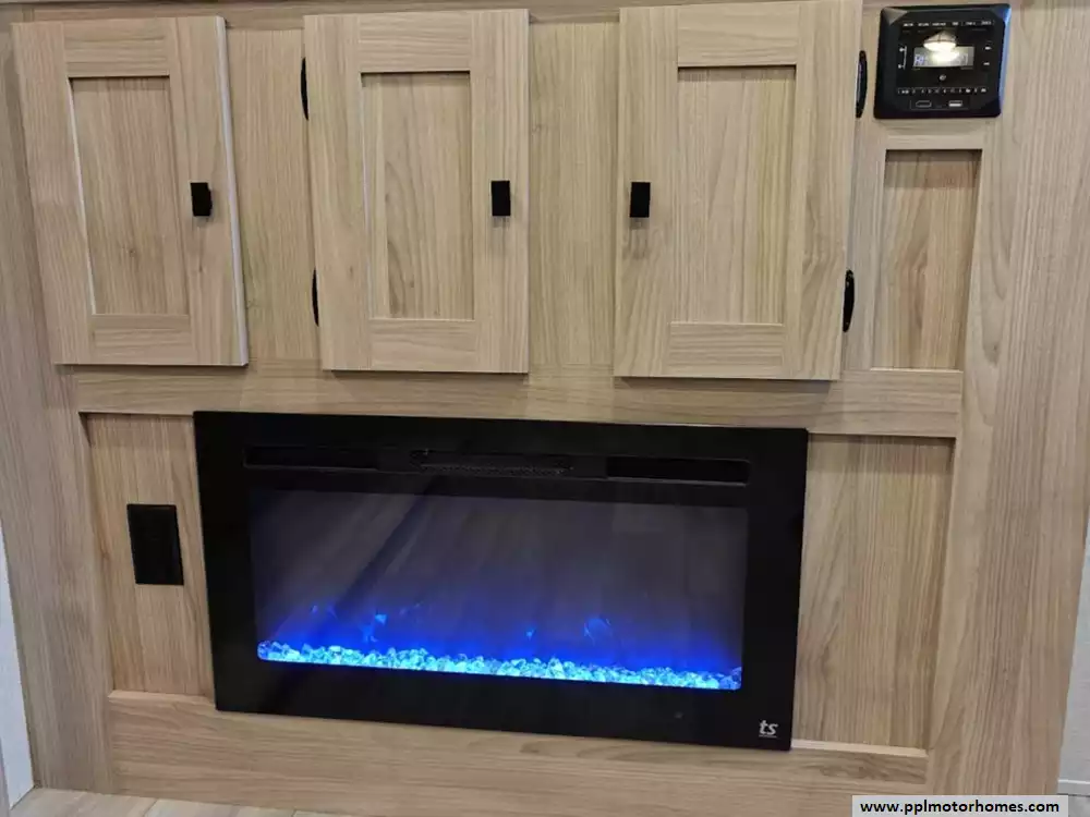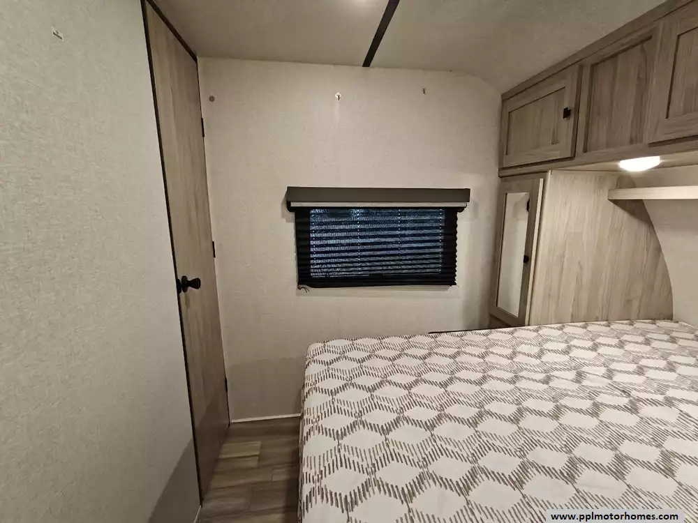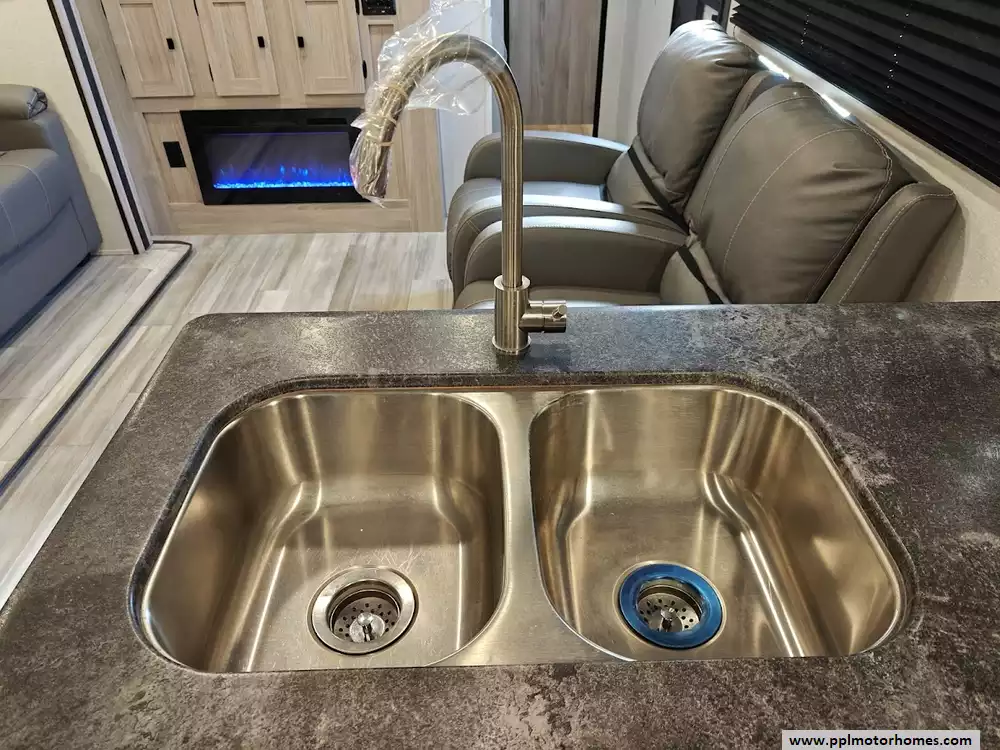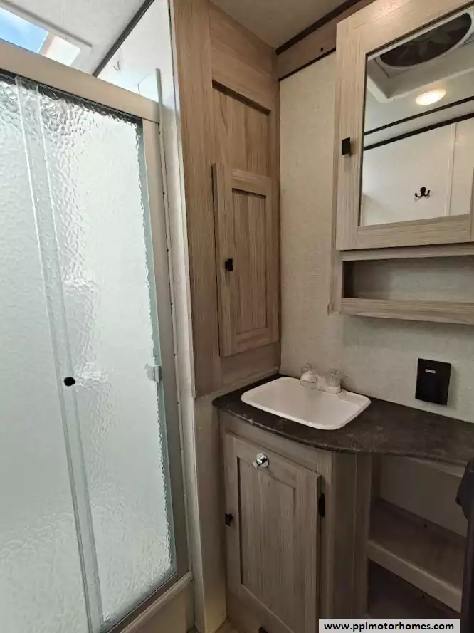 The 2024 Coachmen Northern Spirit Ultra Lite 2965RK features a rear kitchen layout that transitions into an open-concept living area with a large slide-out, and a front private bedroom and a center bathroom. The kitchen is located at the very back of the travel trailer, offering a significant amount of counter space and a large pantry. It includes a deep basin farm-style sink, a three-burner cooktop with an oven, a microwave, and a 10 cubic foot 12V refrigerator. The living area is in the center of the RV, made spacious by a single large slide-out. The slide-out contains a booth dinette (which can convert into a sleeping area) and a tri-fold sofa for additional sleeping capacity. Opposite the slide, there are two recliners positioned near an electric fireplace and entertainment center with a large TV. The full bathroom is located in the hallway area leading to the front bedroom. It features a large shower with a tri-slide glass door, a porcelain foot flush toilet, a vanity with a sink, a medicine cabinet, and a power vent and skylight. The private front bedroom includes a walk-around queen-size bed (60" x 80") with extensive storage options, including hanging rods, drawers, and cubbies, some of which are motion-activated. It also features bedside nightstands with outlets.