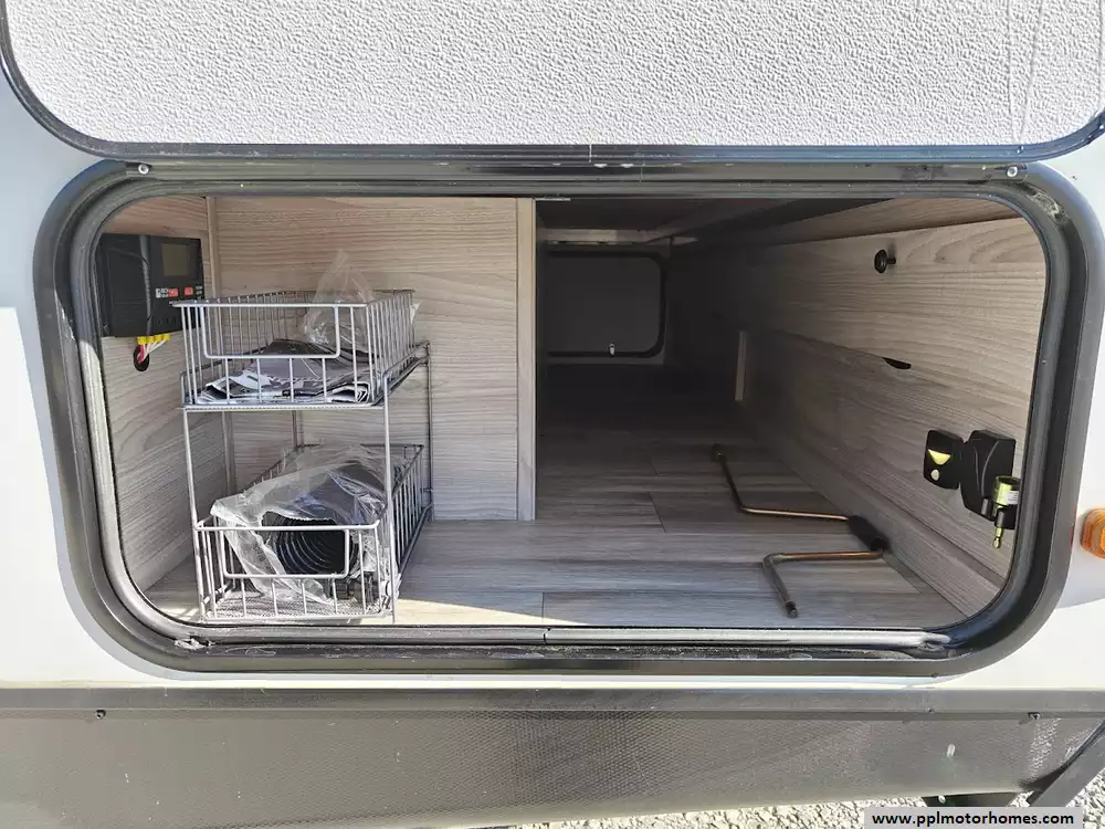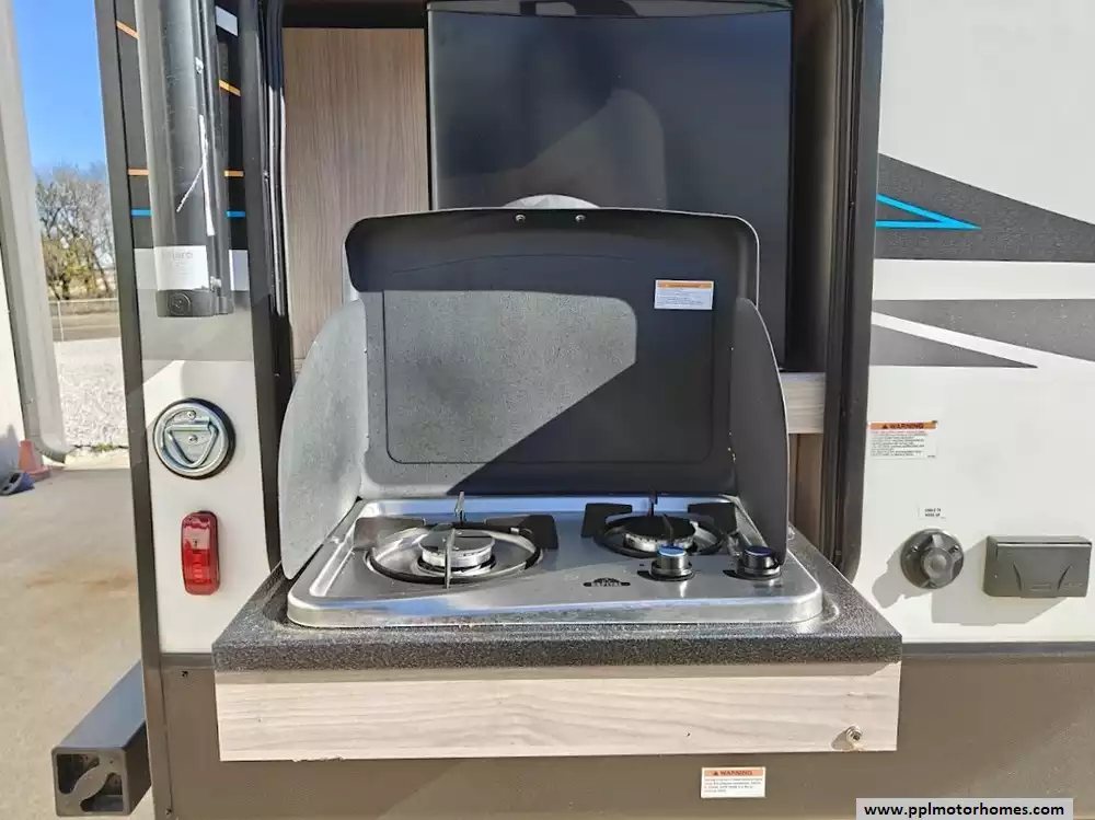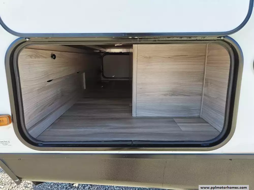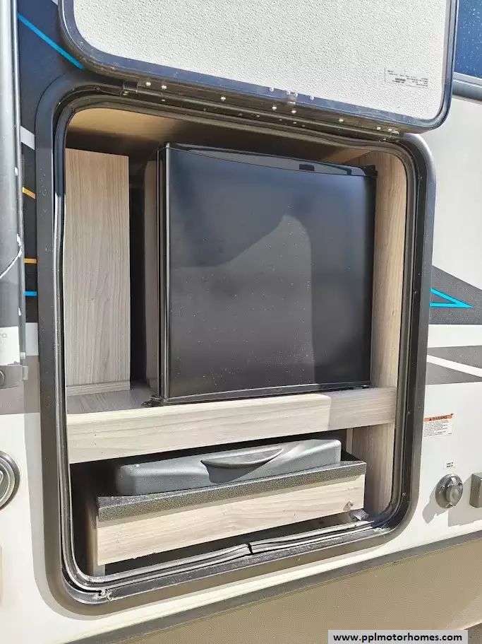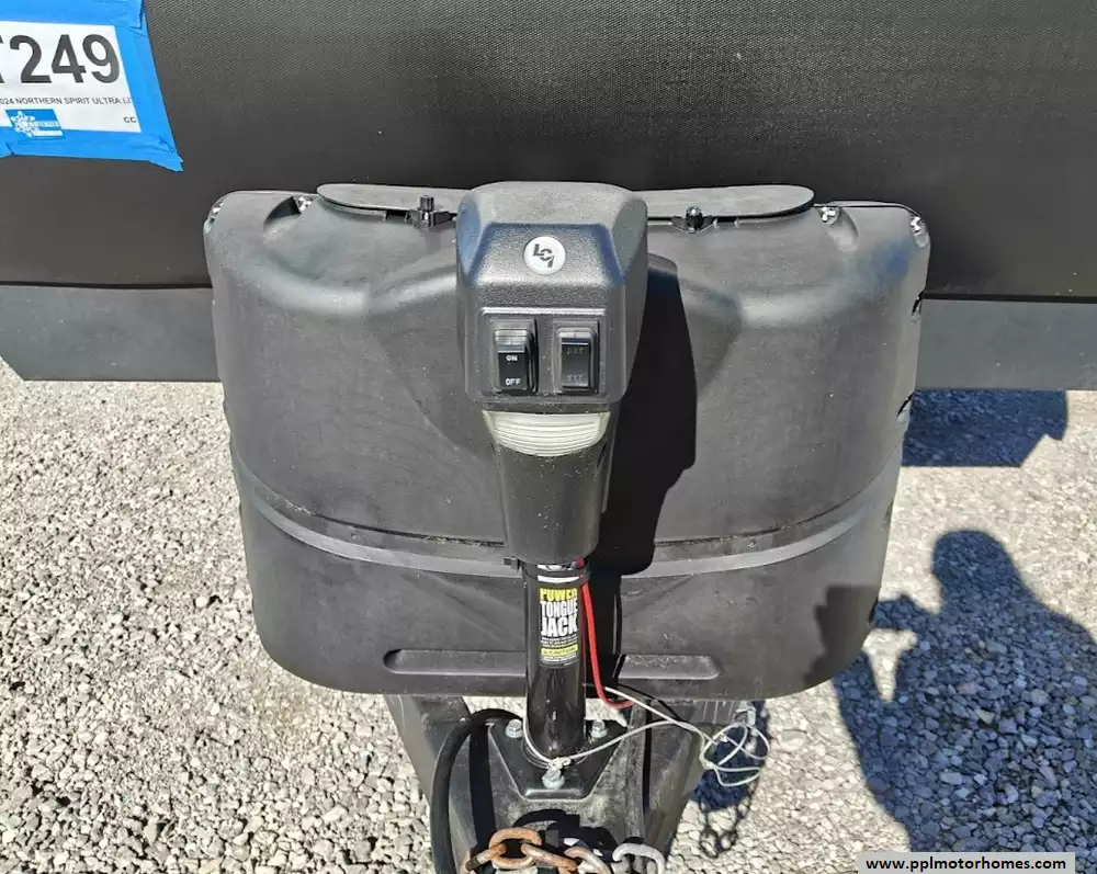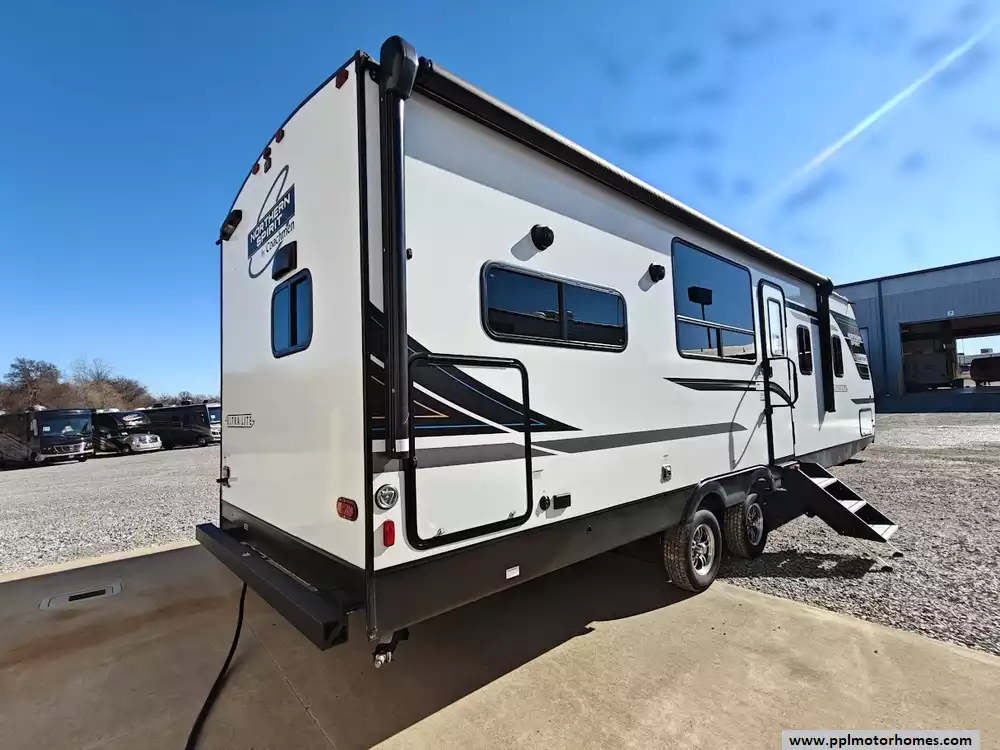 The exterior of the 2024 Coachmen RV Northern Spirit Ultra Lite 2965RK is designed for durability and convenient camping, featuring a fully enclosed and heated underbelly, a 20-foot power awning with LED strip lights, an exterior camp kitchen, and practical pet-friendly amenities like a dog wash station. It comes equipped with a solar panel and a 30 amp charge controller, supporting off-grid camping. Features a large pass-through storage compartment with a motion-activated light and dedicated storage for fishing poles or roasting sticks. A convenient outdoor camp kitchen includes a counter, a mini-fridge, and additional storage space. A fully enclosed and heated underbelly extends the camping season by protecting the water lines and tanks in colder weather.