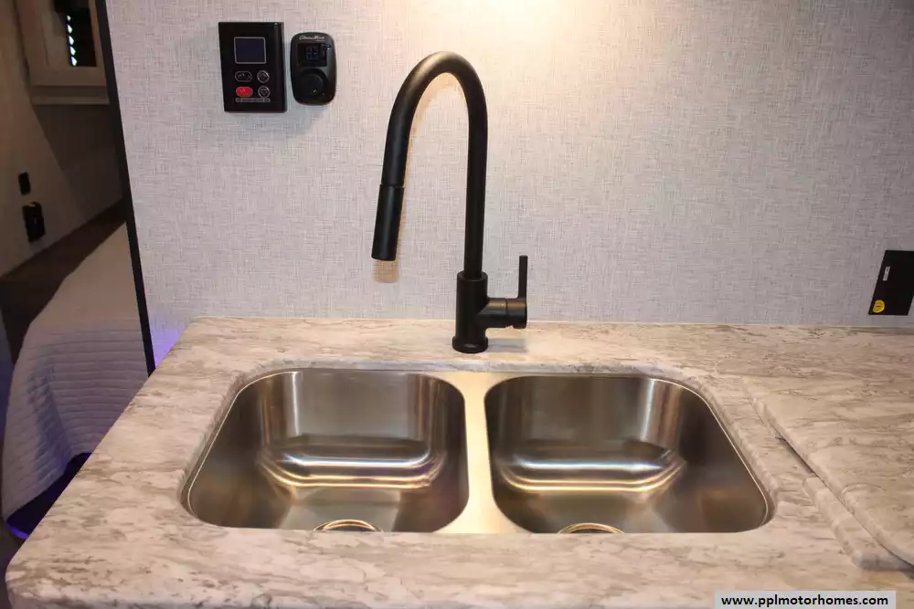 The residential-style kitchen is fully equipped for any culinary task, featuring a three-burner range, oven, microwave, and a high-capacity double-door 12v Furrion refrigerator. For those planning extended stays or full-time adventuring, the rare inclusion of a washer and dryer provides the ultimate convenience on the road. Stay comfortable in any climate with a dual-cooling system featuring one ducted and one non-ducted air conditioner. Complete with a TV for entertainment and an outside shower for quick clean-ups after a day of exploring, the Zinger 280RB offers a premium, home-like experience in a manageable travel trailer footprint.