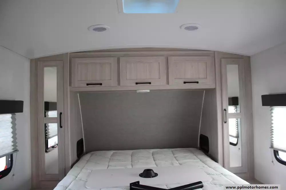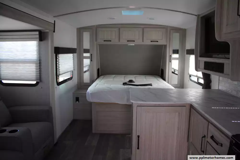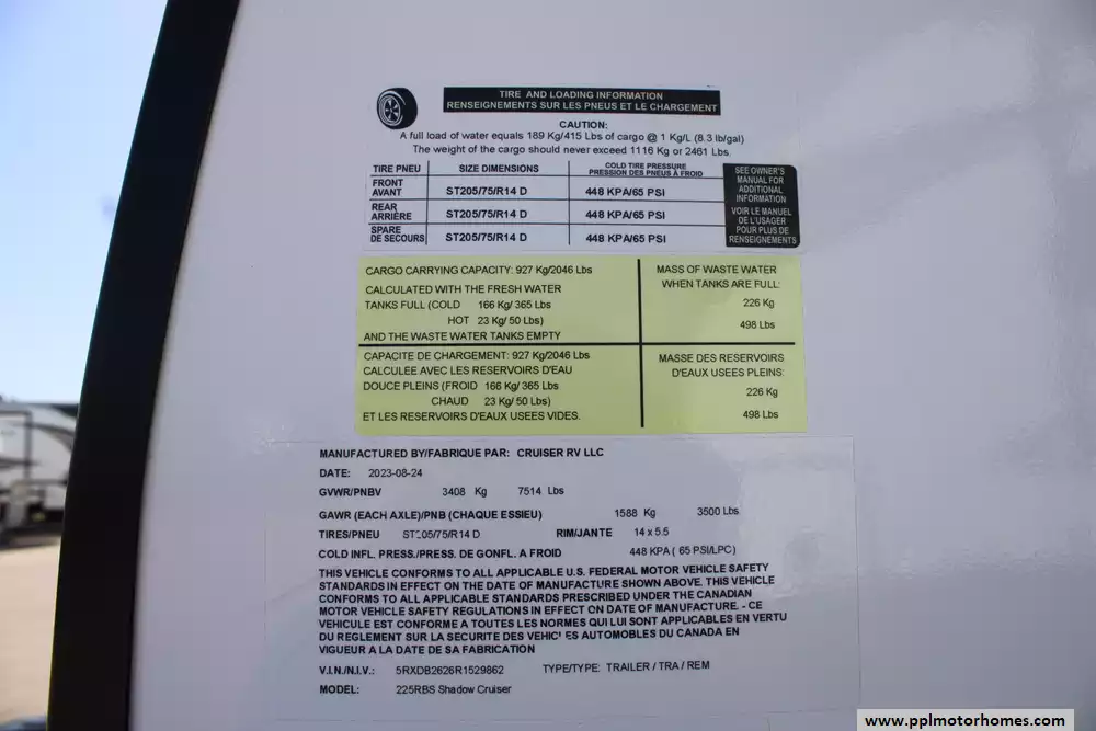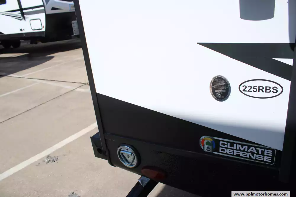 The 2024 Cruiser RV Shadow Cruiser 225RBS is a compact, lightweight travel trailer measuring approximately 26 ft 6 in long, 8 ft 1 in wide, and standing about 10 ft 11 in high, with an interior ceiling height of 6 ft 9 in. It carries a dry (unloaded) weight of around 5,052 lbs and a maximum GVWR of about 7,514 lbs, leaving roughly 2,430 lbs for cargo and a hitch weight of approximately 514 lbs. This rear-bath layout comfortably sleeps up to four via a queen bed and a convertible U-shaped dinette, features an 8 to 10.7 cu ft gas/electric refrigerator, a radius-door shower, seamless-edge countertops, ample pass-through storage, optional solar package with a disconnect knob, and a 14 ft electric awning with LED lighting. Built with five-sided aluminum framing and Azdel composite sidewalls, along with a rain-gutter slide system and tongue-and-groove plywood flooring, it's engineered for durability and extended-season use via enclosed underbelly heating, dual ducted 13,500 BTU air conditioning, and a 30,000 BTU furnace.