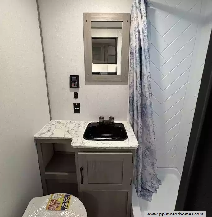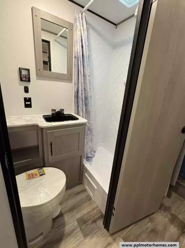 A three-piece dry bath located in the middle of the unit has a full-height shower with a skylight that provides extra headroom and natural light and a high-rise foot flush toilet. The vanity includes a sink with countertop, medicine cabinet and mirror. This RV features a tankless water heater, allowing for continuous hot water during showers.