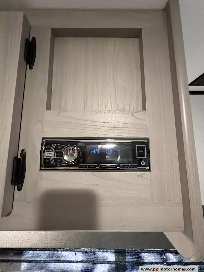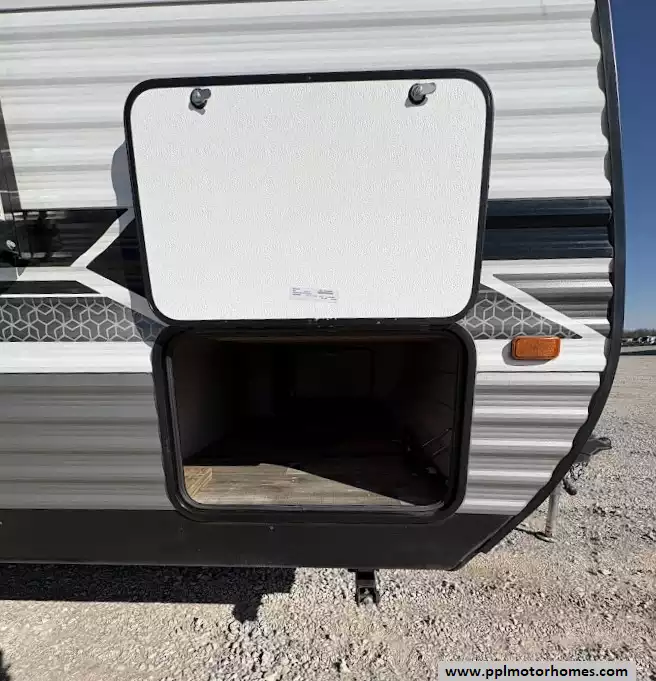 Outside you will find a power awning with LED lighting, a power tongue jack, front and rear stabilizer jack and pass-through storage front compartment with extra-tall doors and magnetic catches for easy access to bulky gear.