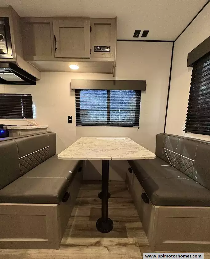 There is a private front queen bed with dual wardrobes and charging ports. Additional sleeping for guests include a jackknife couch and convertible booth dinette in the rear of the living area.