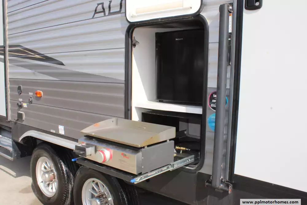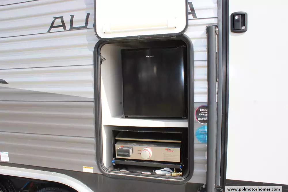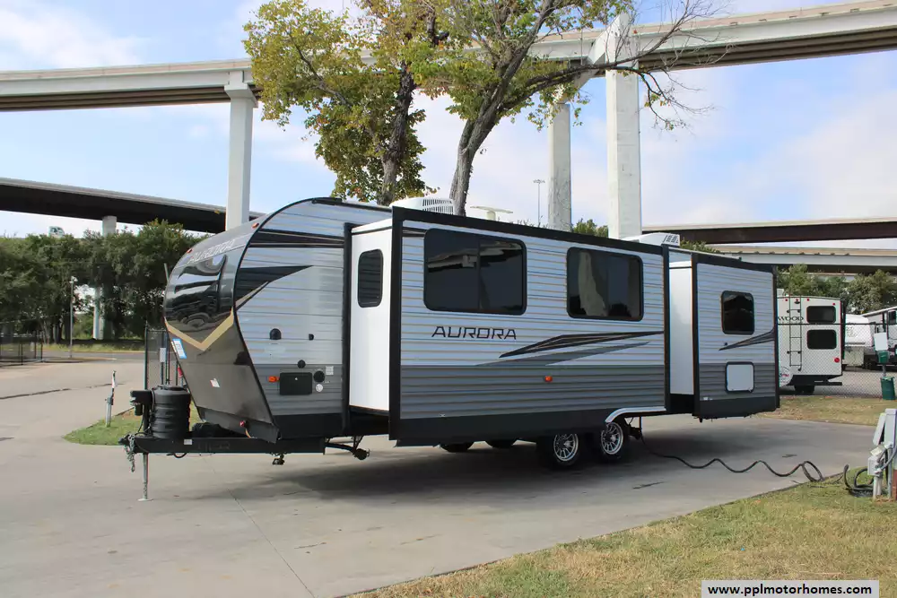This 2024 Aurora 26FKDS is well-suited for a small family, a pair of couples, or folks who want a bit more space. Features Include...Electric Tongue Jack, 2 Slide-outs, 2 Ducted Air Conditioners, Double Door Gas/110v Ge Refrigerator, Automatic Main Awning, Outside Speakers, TV, Outdoor Grill, Outdoor Kitchen, Outside Shower, Fireplace, Microwave, 3 Burner Range, and Oven.
